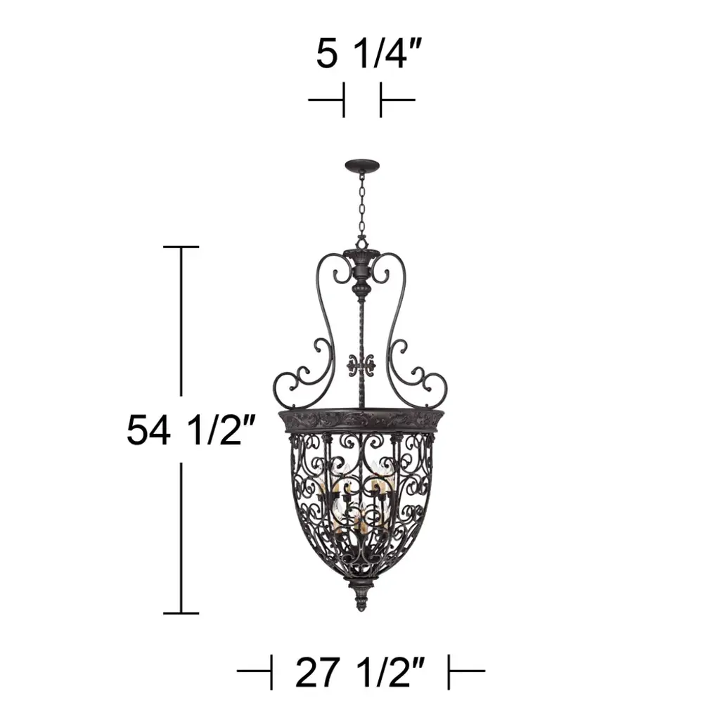 With elegant scrolls and an open look, this large foyer chandelier lends beautiful style to entryways, foyer spaces, and large rooms. The design features an iron-look ornate frame with twelve lights clustered inside. Delicate metalwork connects decorative top scrolls with the main lower section. Add old world elegance and panache to your home with this grand chandelier.