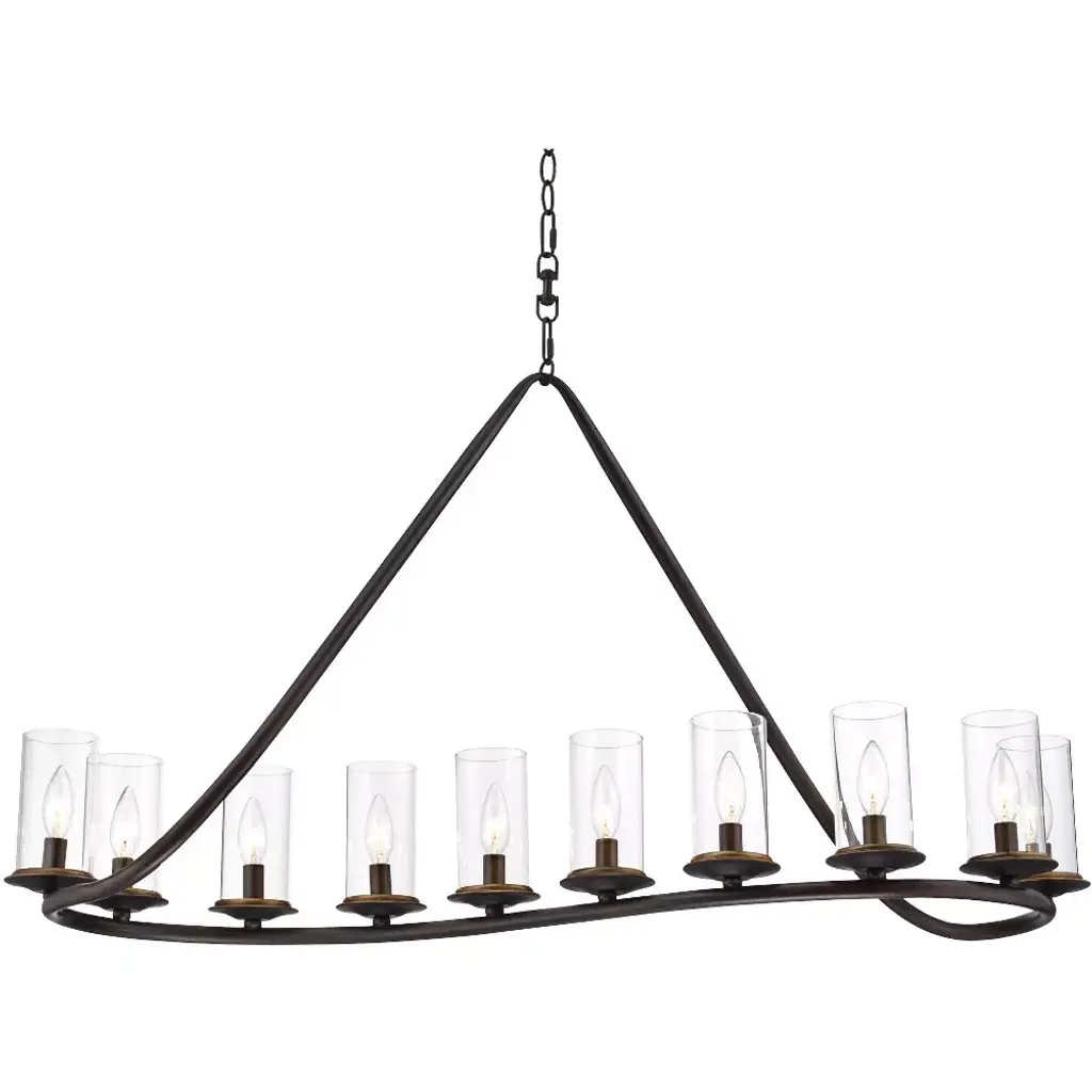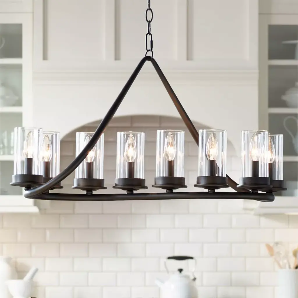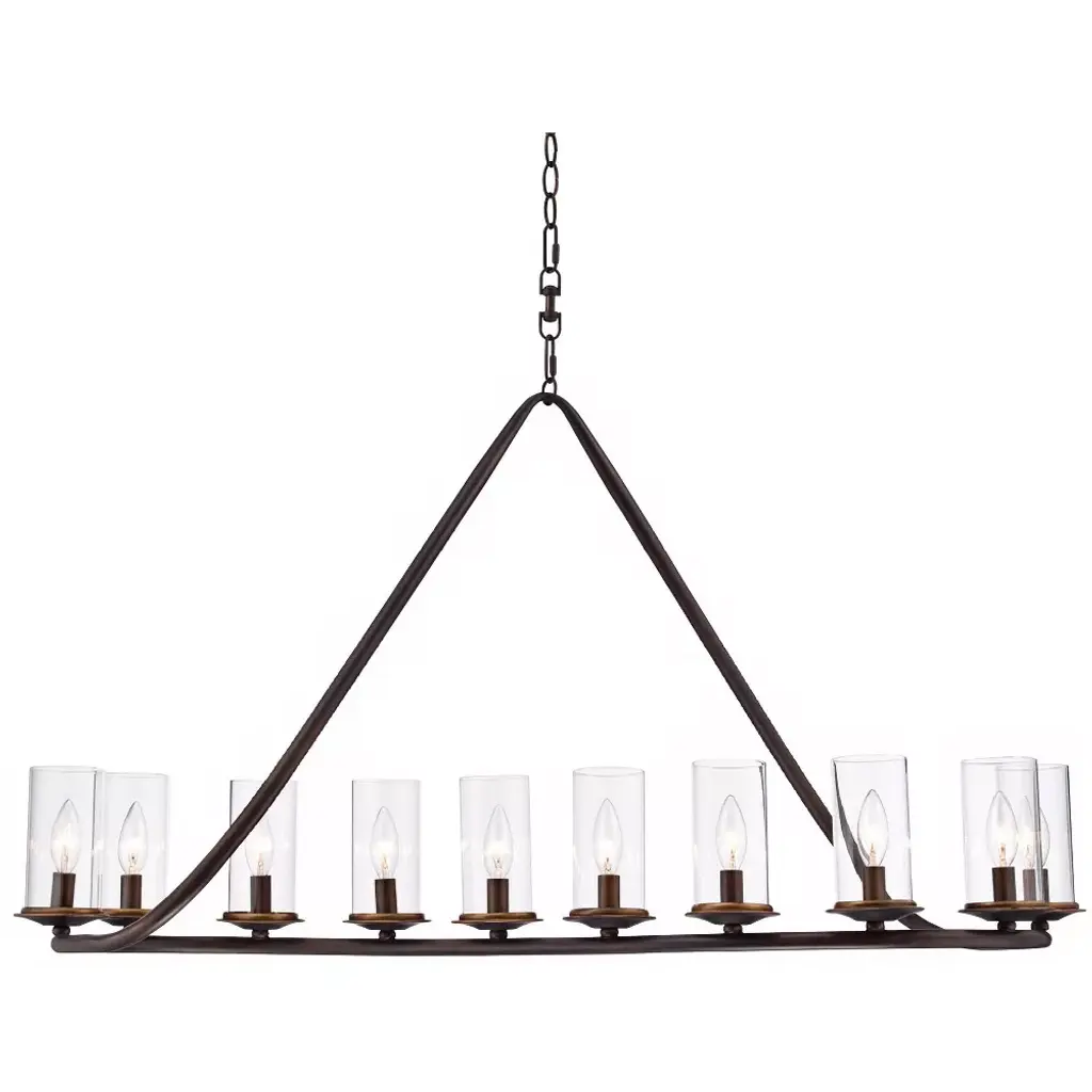 The sweeping look of this linear chandelier adds a dramatic bit of glamour to kitchen island lighting, home offices, dining tables, and more. From the Franklin Iron Works™ brand, the chandelier features a slim and elegant profile with ten candelabra lights set behind clear glass. Inspired by iron lighting fixtures, the frame and canopy are in a Heritage Bronze finish, a perfect look for modern farmhouse or rustic decor. It will add a new dimension to your home decor. Perfect in a kitchen or above a dining table as a warm, comforting part of your stylish decor. Clear glass cylinders encase the bulbs and add a light touch to this sophisticated design.