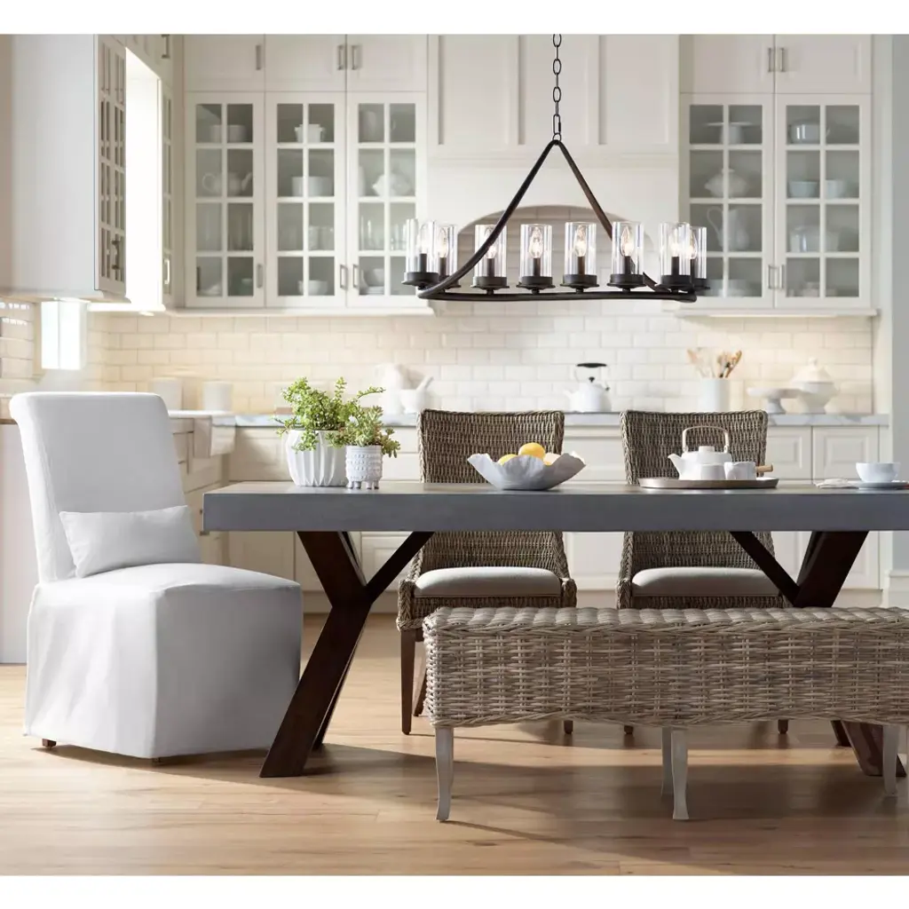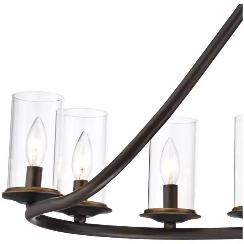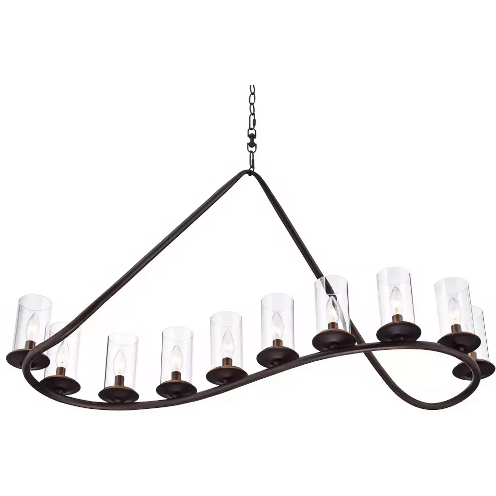 The sweeping look of this linear chandelier adds a dramatic bit of glamour to kitchen island lighting, home offices, dining tables, and more. From the Franklin Iron Works™ brand, the chandelier features a slim and elegant profile with ten candelabra lights set behind clear glass. Inspired by iron lighting fixtures, the frame and canopy are in a Heritage Bronze finish, a perfect look for modern farmhouse or rustic decor. It will add a new dimension to your home decor. Perfect in a kitchen or above a dining table as a warm, comforting part of your stylish decor. Clear glass cylinders encase the bulbs and add a light touch to this sophisticated design.