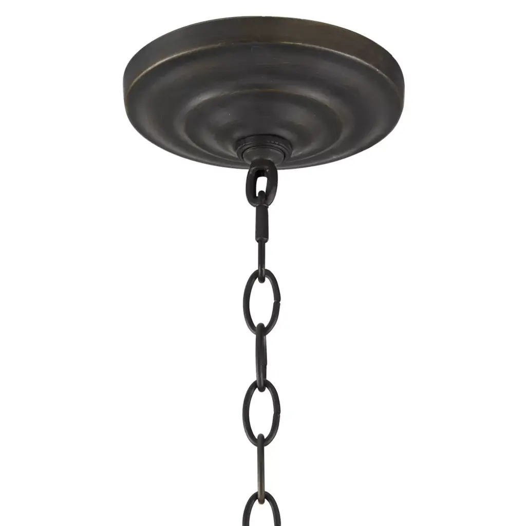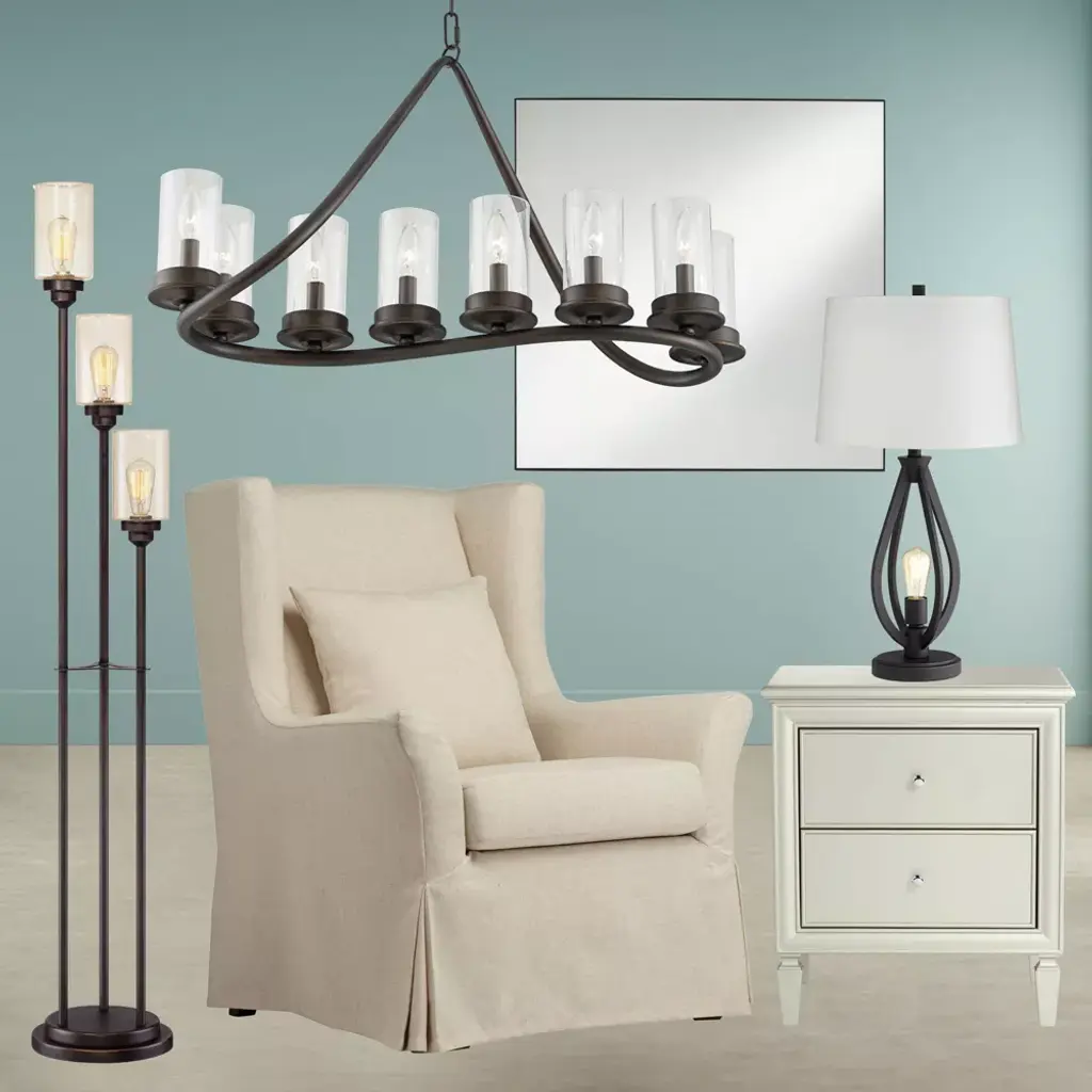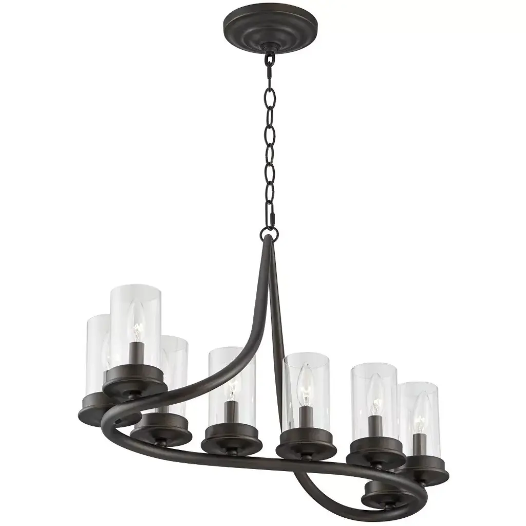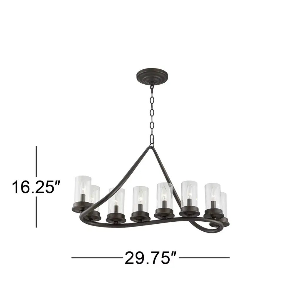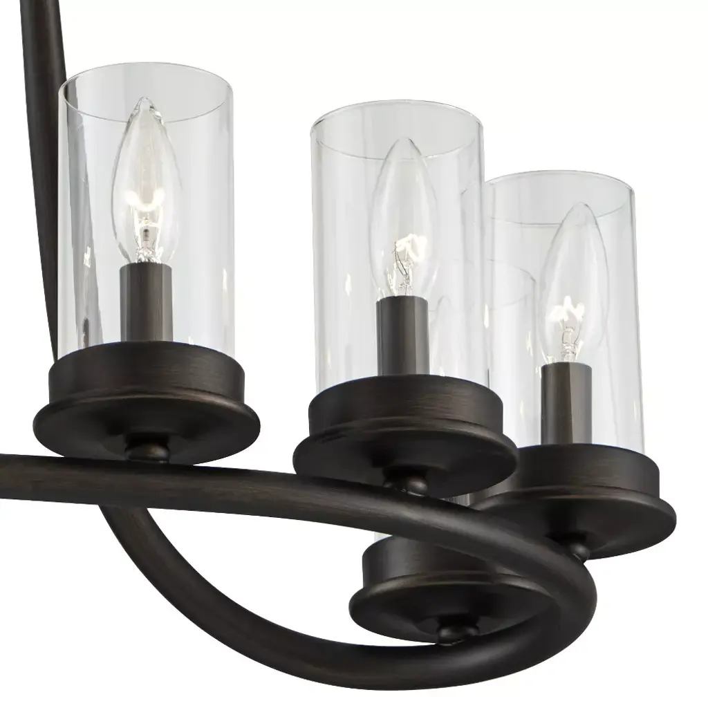 Inspired by an unending, curving loop, this eight-light island chandelier by Franklin Iron Works™ is elegant and eye-catching. The Heritage bronze finish delivers richness and character white offering beautiful contrast. Cylindrical clear glass shades put finishing touches of detail and personality on this exceptional design.