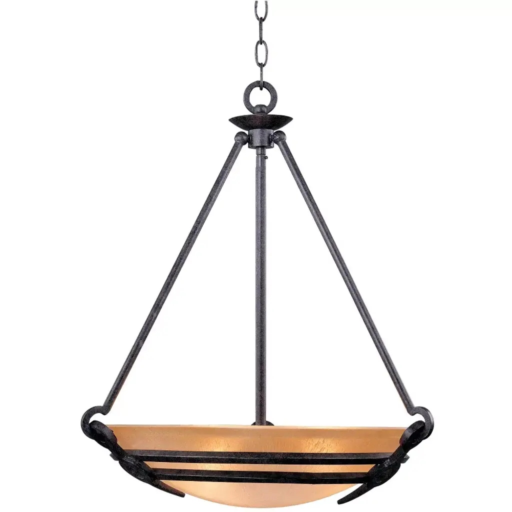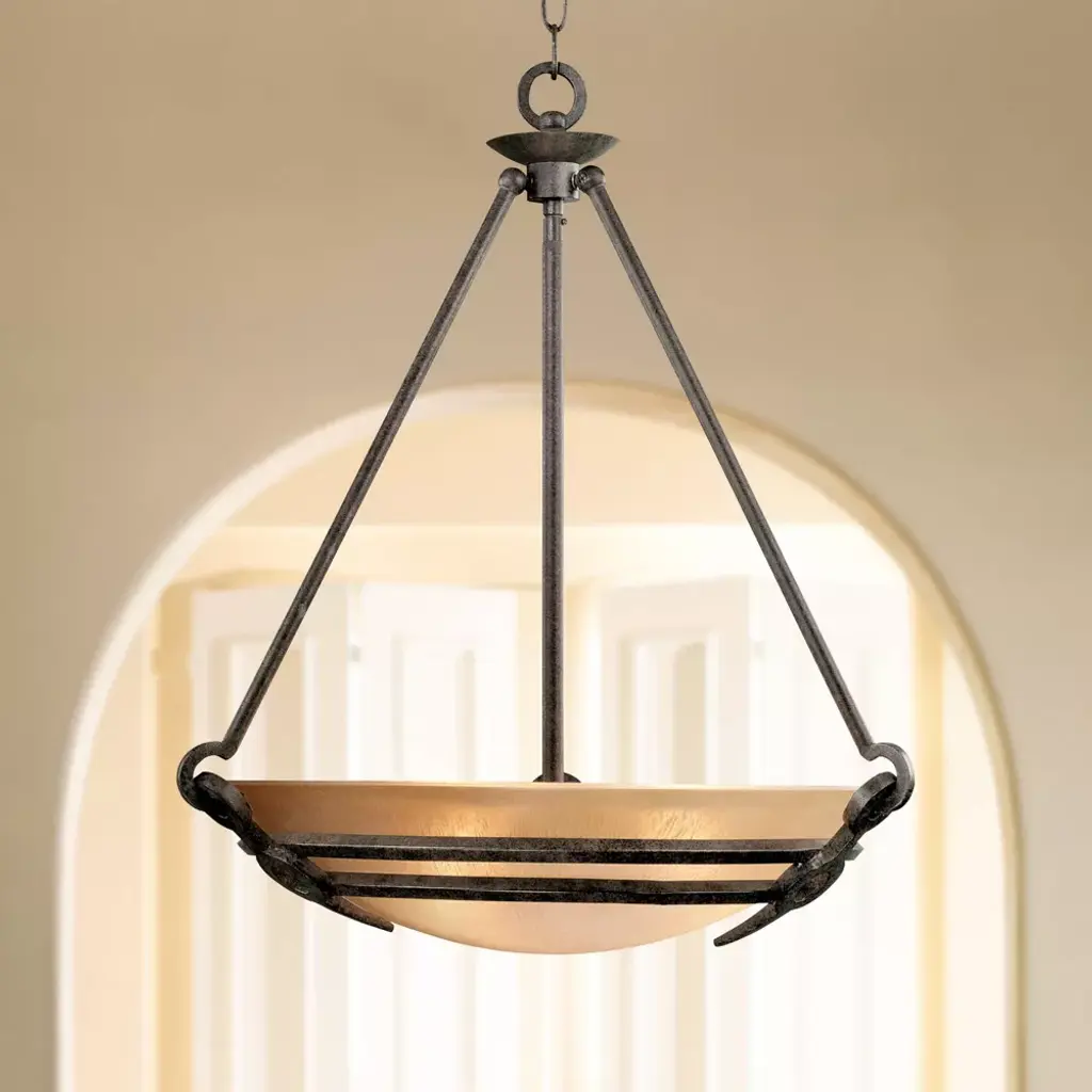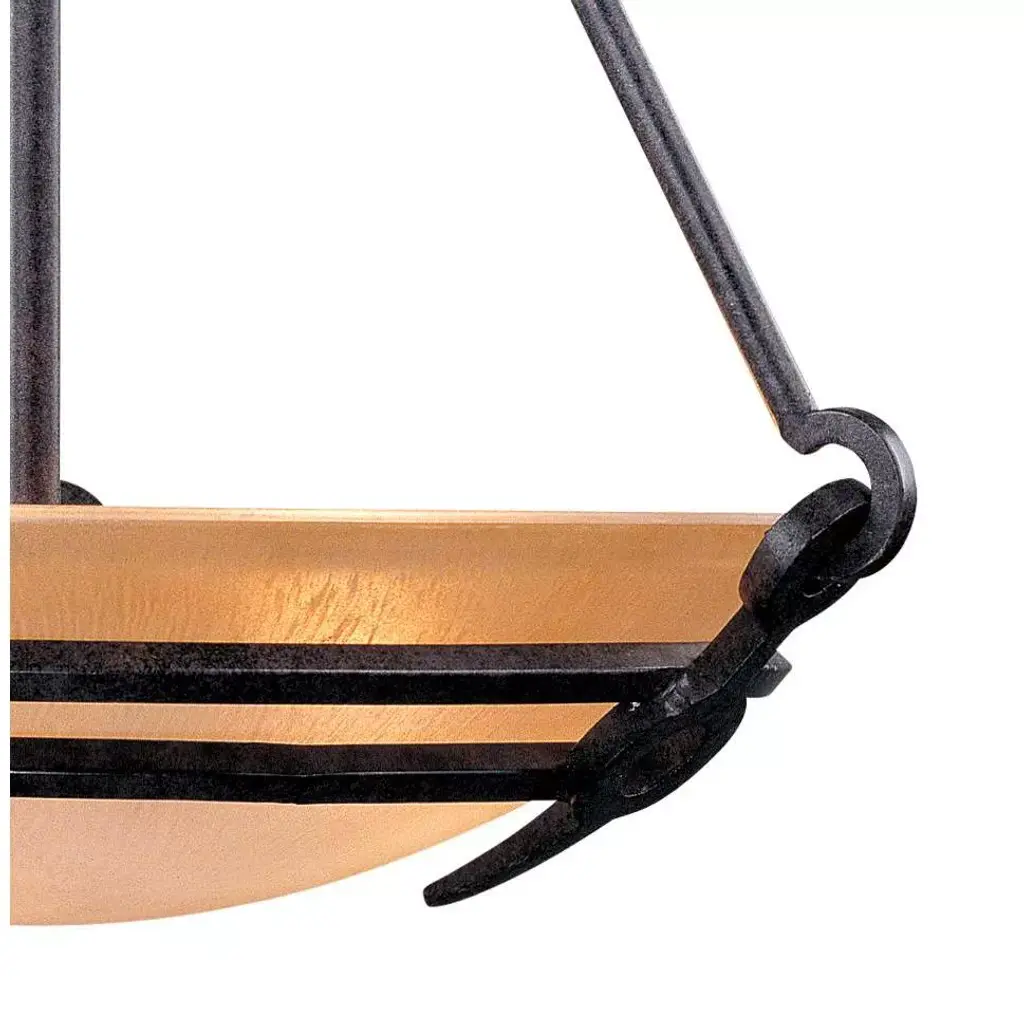 Brighten your home with the classic style of this bowl-shaped pendant chandelier. From the Franklin Iron Works™ brand of lighting, the design is inspired by California Mission style and lighting. It features a bowl-shaped profile crafted from India Scavo glass that glows warmly when the three bulbs inside are illuminated. The metal support rods, frame and canopy all come in an Old Bronze finish, which nicely offsets the glass element.