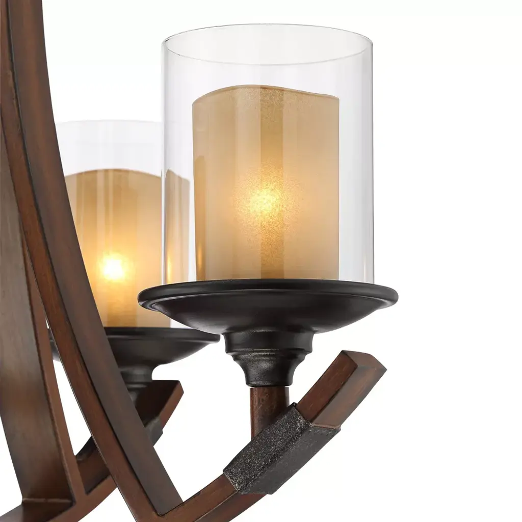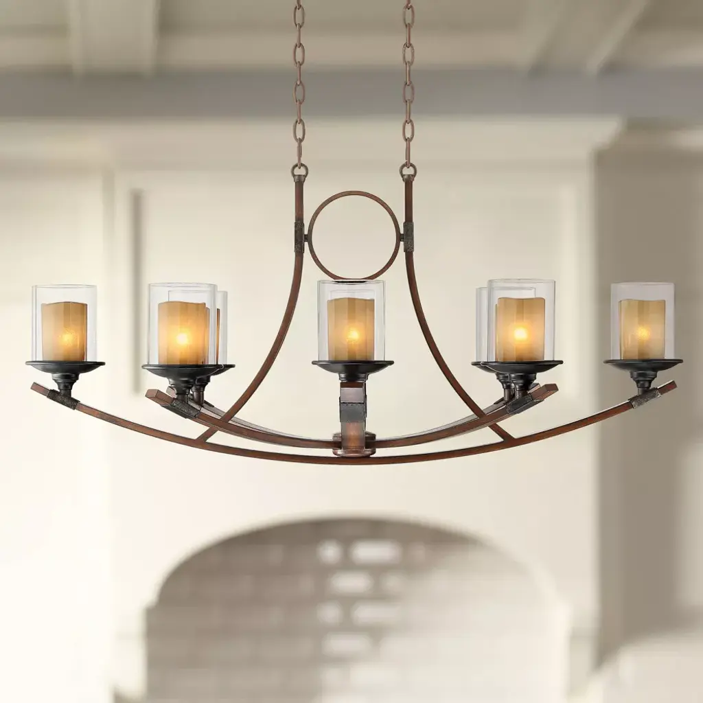 From the Tafford collection by Franklin Iron Works, this rustic eight-light island chandelier offers woodsy warmth with alluring curves. In a rich mahogany finish, the curving metal frame is shaped like an anchor for a charming, eclectic look. It supports eight double glass cylinder shades, which have clear glass outer shades that encase Scavo glass inner shades. The result is an attractive rustic farmhouse chandelier that's perfect for a living room, dining room, or den area.