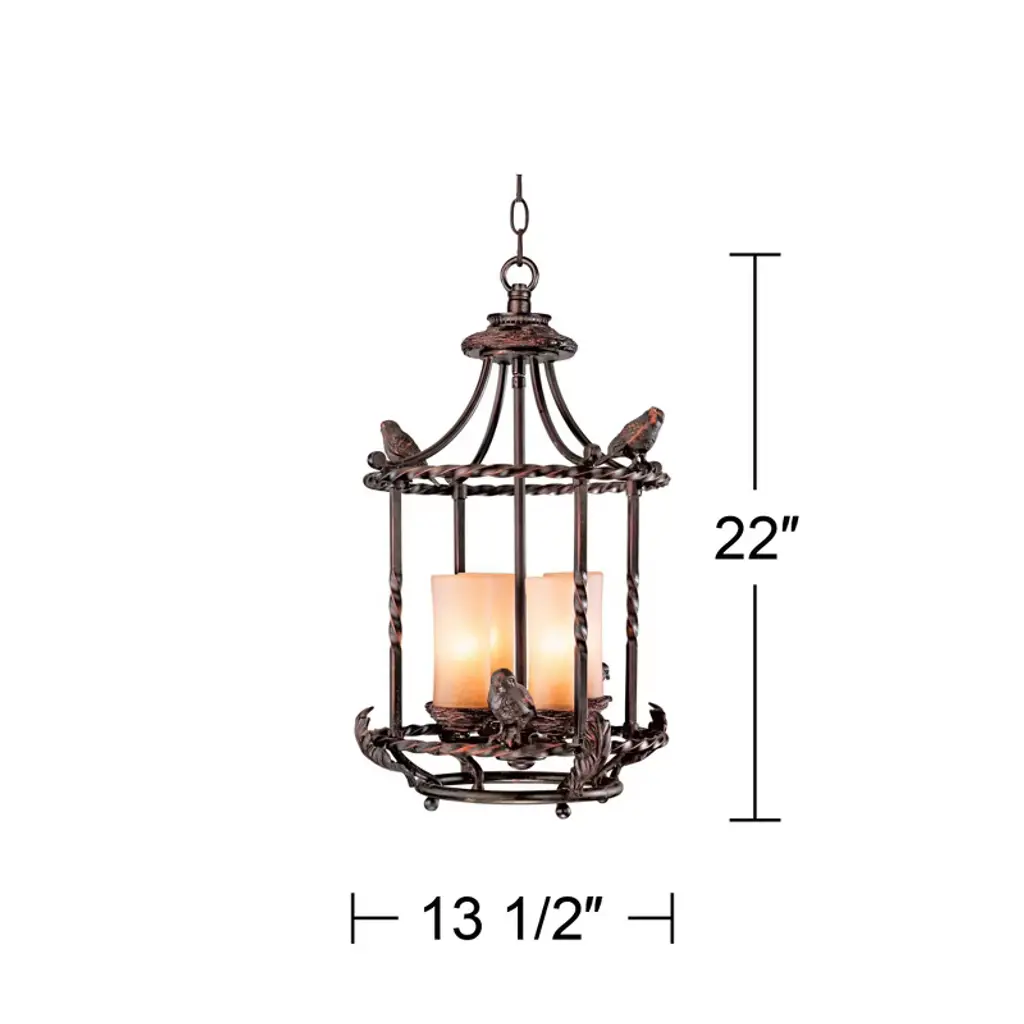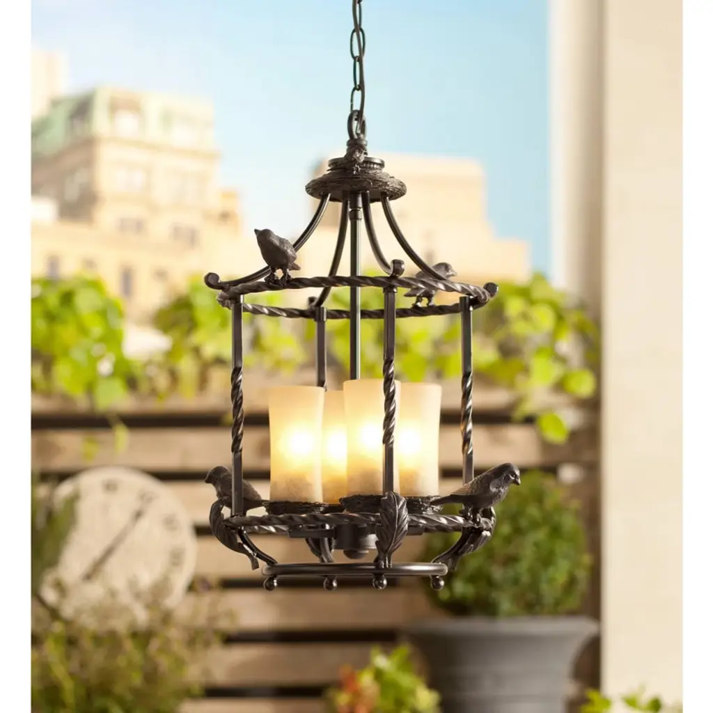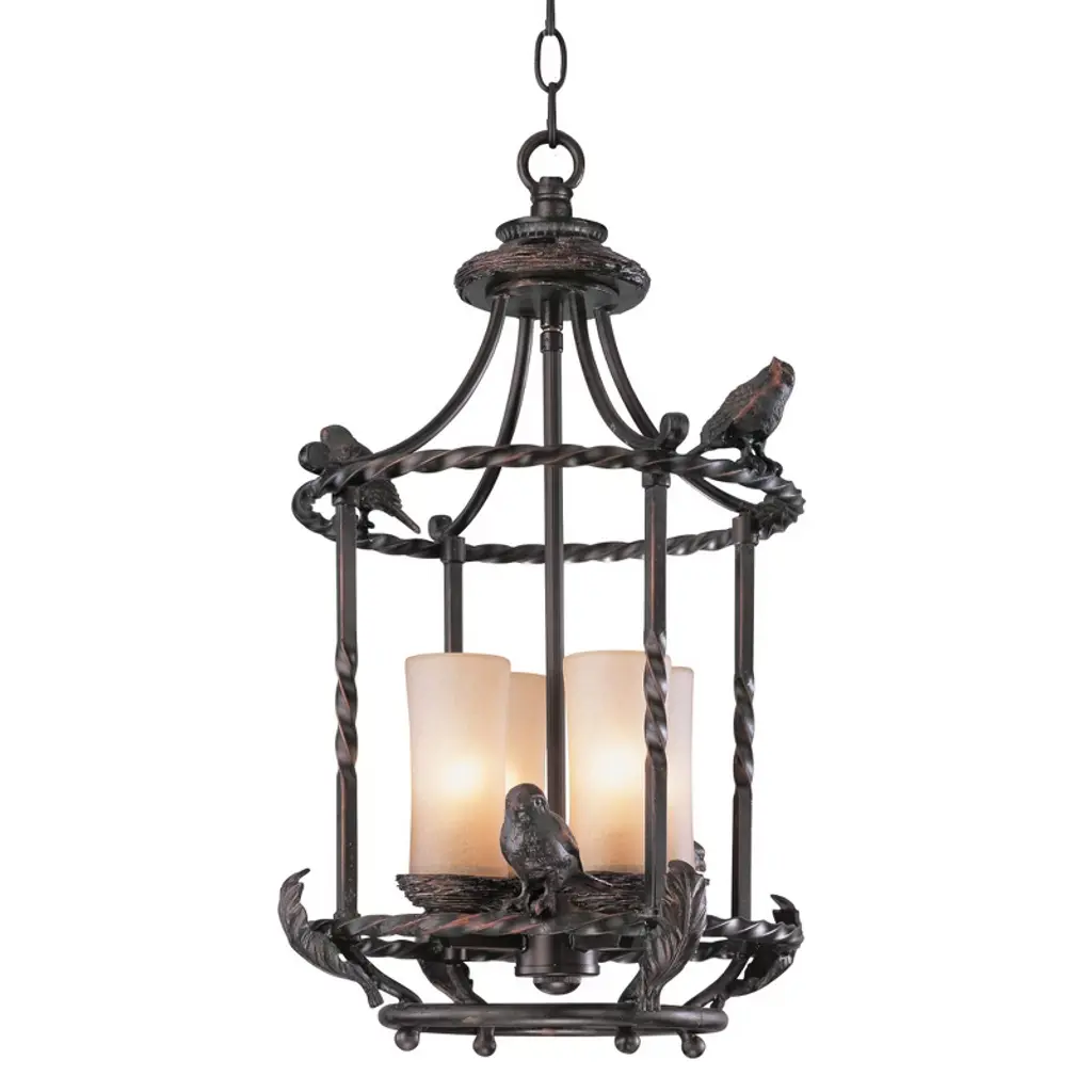 Add a magical look to entry halls, kitchens, and even covered porches or patios with this charming pendant chandelier design. The piece features a cast metal birdcage style frame with song birds. Frame is in a bronze finish and holds three candle-like lights in scavo glass. The design is damp location rated, so it can be installed indoors or outside in a covered location.