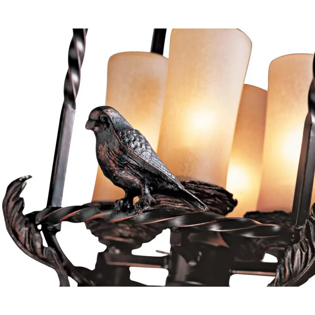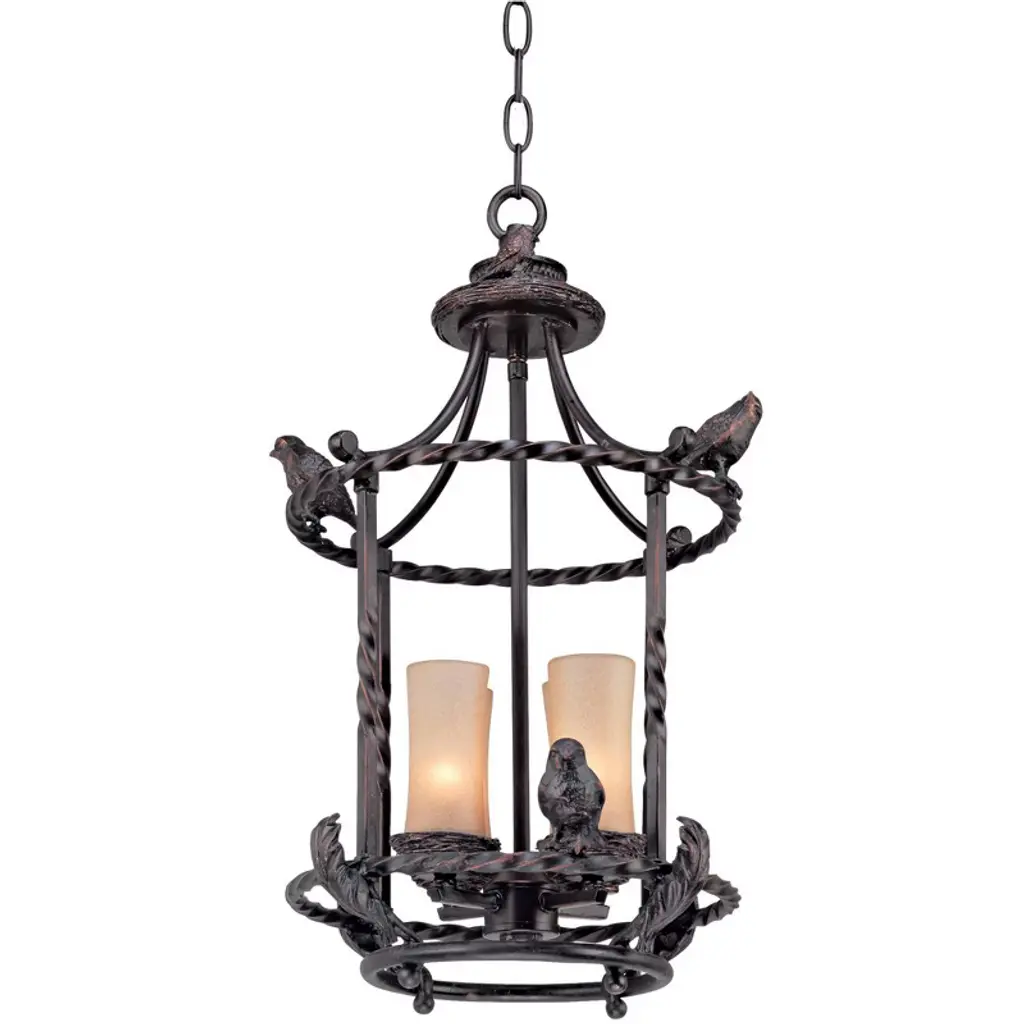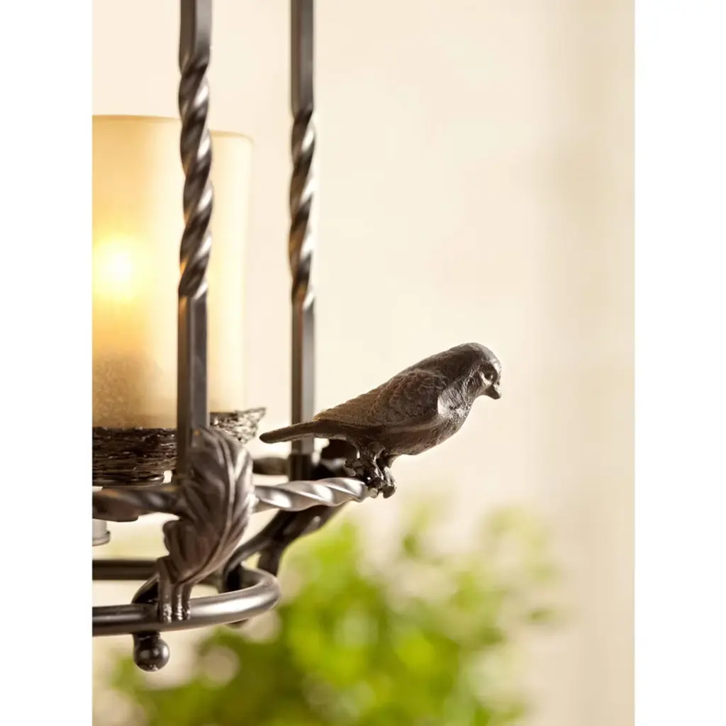 Add a magical look to entry halls, kitchens, and even covered porches or patios with this charming pendant chandelier design. The piece features a cast metal birdcage style frame with song birds. Frame is in a bronze finish and holds three candle-like lights in scavo glass. The design is damp location rated, so it can be installed indoors or outside in a covered location.