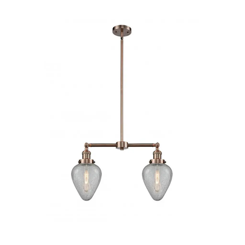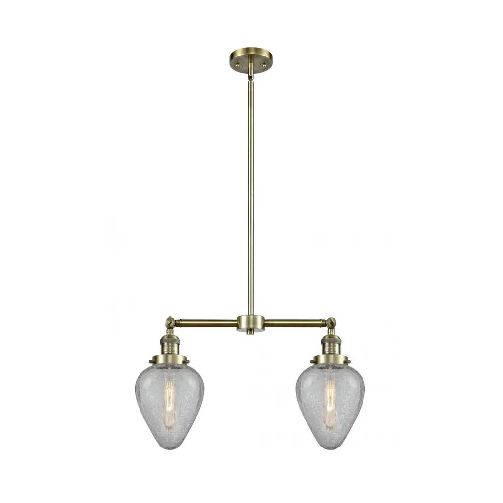 The Geneseo 2 Light Chandelier is part of the Franklin Restoration Collection. Includes 1-6 and 2-12 inch Stems. Additional Stems sold separately.. Solid Brass 180 Degree Adjustable Swivels with internal teeth that lock in at 5 degree intervals With Engraved Cast Cup. Solid Brass 90 Degree Hang Straight Swivel for Sloped Ceilings Included