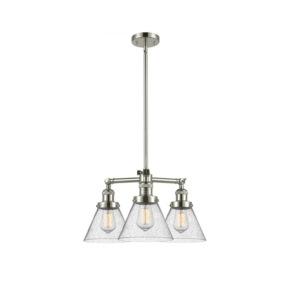 The Large Cone 3 Light Chandelier is part of the Franklin Restoration Collection. Includes 1-6 and 2-12 inch Stems. Additional Stems sold separately.. Solid Brass 90 Degree Hang Straight Swivel for Sloped Ceilings Included