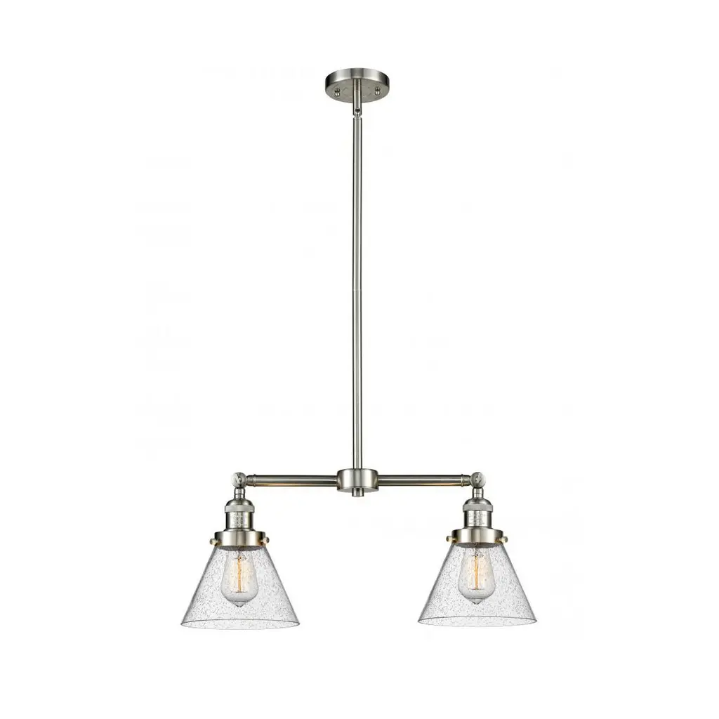 The Large Cone 2 Light Chandelier is part of the Franklin Restoration Collection. Includes 1-6 and 2-12 inch Stems. Additional Stems sold separately.. Additional Stems sold separately.. Solid Brass 180 Degree Adjustable Swivels with internal teeth that lock in at 5 degree intervals With Engraved Cast Cup. Solid Brass 90 Degree Hang Straight Swivel for Sloped Ceilings Included