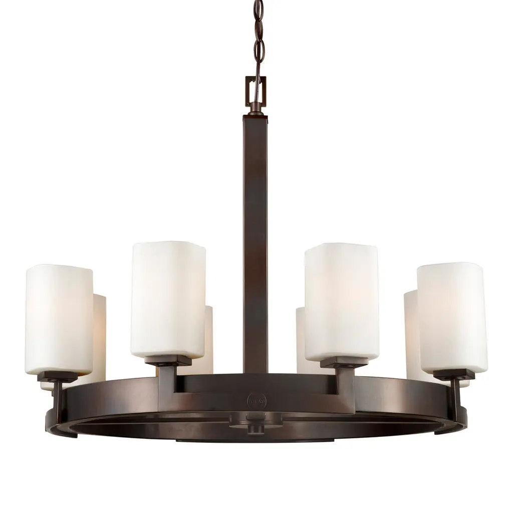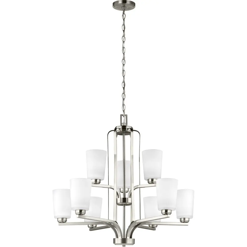 The Franport nine light multi-tier chandelier in bronze is an ENERGY STAR½ qualified lighting fixture that uses LED bulbs to save you both time and money. Modernist influences abound in the Franport Collection. Shades with sharp lines and simplified bases showcase the minimalist approach with a twist. Franport has fixtures for all parts of the property. Available in both Burnt Sienna and Brushed Nickel finish choices as well as Nickel for bath fixtures. With fixtures in various sizes and configurations, the Franport Collection will coordinate the same design theme across several different rooms. Its assortment includes three-, five-, nine- and fifteen-light chandeliers; and one- two-, three- and four- light bath vanity fixtures. The Franport collection pars wonderfully with Geary ceiling fixtures. Incandescent and ENERGY STAR-qualified LED lamping are available; all fixtures are California Title 24 compliant.