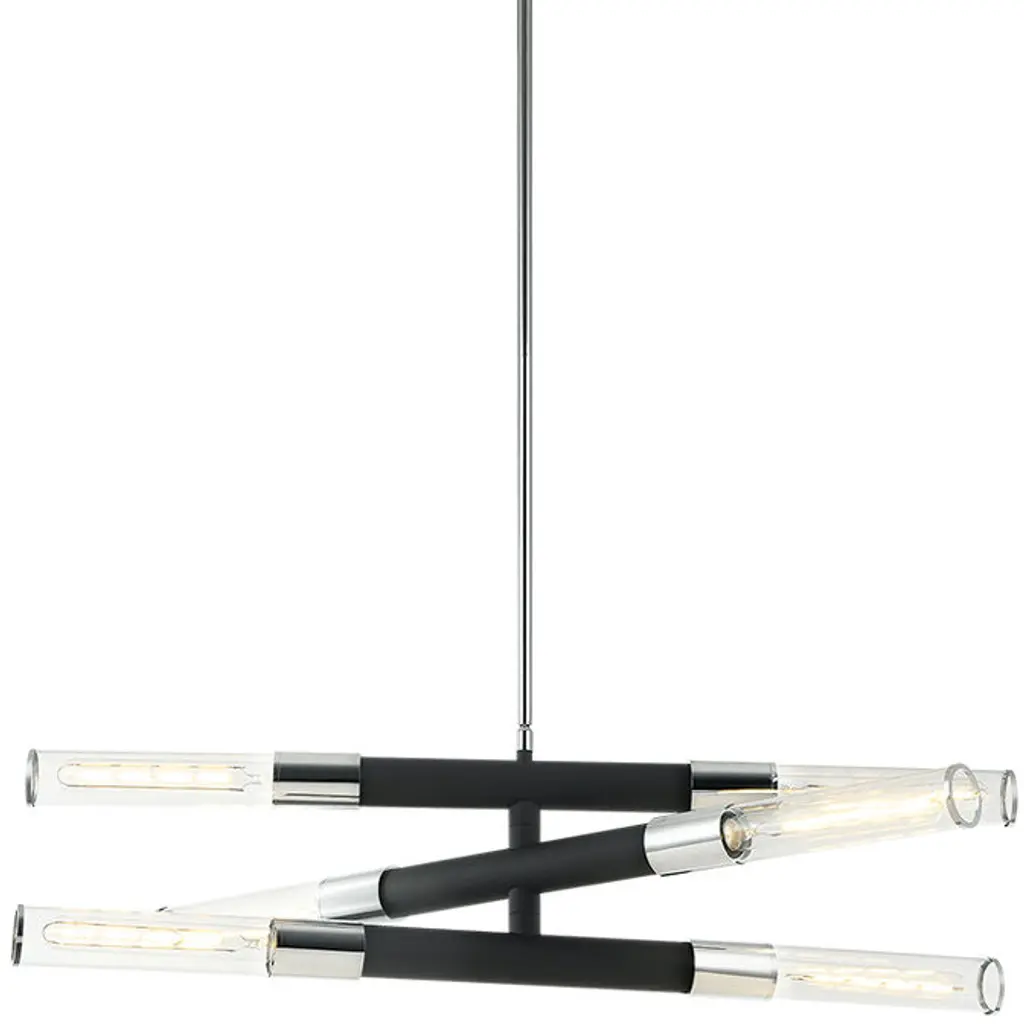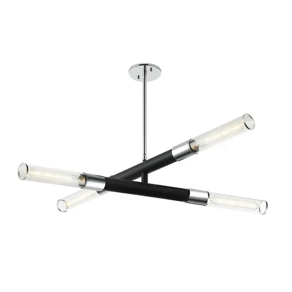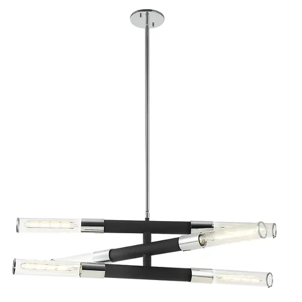 Dashes of light dance overhead with the sculptural design of the Fredo Chandelier from Huxe. It takes a page from mid-century design in its clear forms and bold finishes. The chandelier enters the room gracefully with an ultra-fine downrod suspension. From this downrod, a 2-tone composition of stems each produces a clear glass shade capped with a chic ring accent. The crispness of the glass enhances the brilliance of the bright bulbs. These bulbs face toward the room’s walls to generate a warm, encompassing aura and a memorable silhouette of lines.