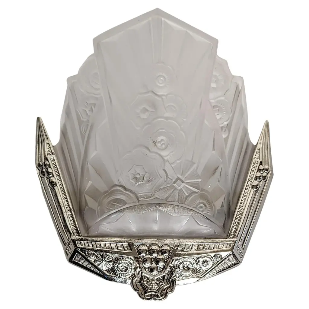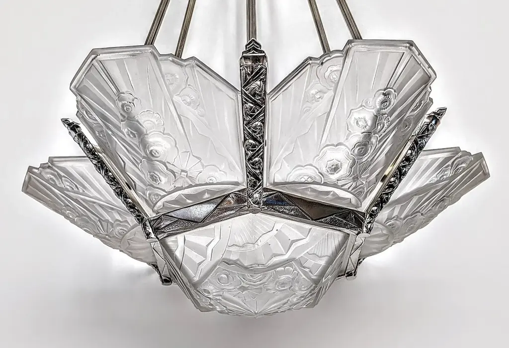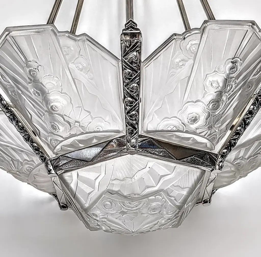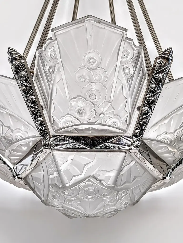A stunning French Art Deco chandelier in grand scale (26" in diameter with 36" drop adjustable) by the French Artist J. Rorobet. It is most uncommon to find two pairs of matching wall sconces, shown in the last photo (Sold separately). The fixture is decorated by Six side panels with a center coupe in clear and frosted glass shades with flower motif details mounted in geometric nickel bronze frames. Replated and rewired to U.S. standards which accommodate twelve candelabra bulbs (E-12 total of 780 watts max). Complimentary drop-off to New York City. We are the rare source that has specialized exclusively in French Art Deco for over three decades, since 1991 with restoration, repair and plaiting for any lighting period located in Long Island City, N.Y. If you are searching for a particular item, we have additional inventory in our collections that may fit your needs. Please feel free to ask any questions by pressing the " ASK THE SELLER " button so we may assist you in finding a wonderful piece that's just right for you.