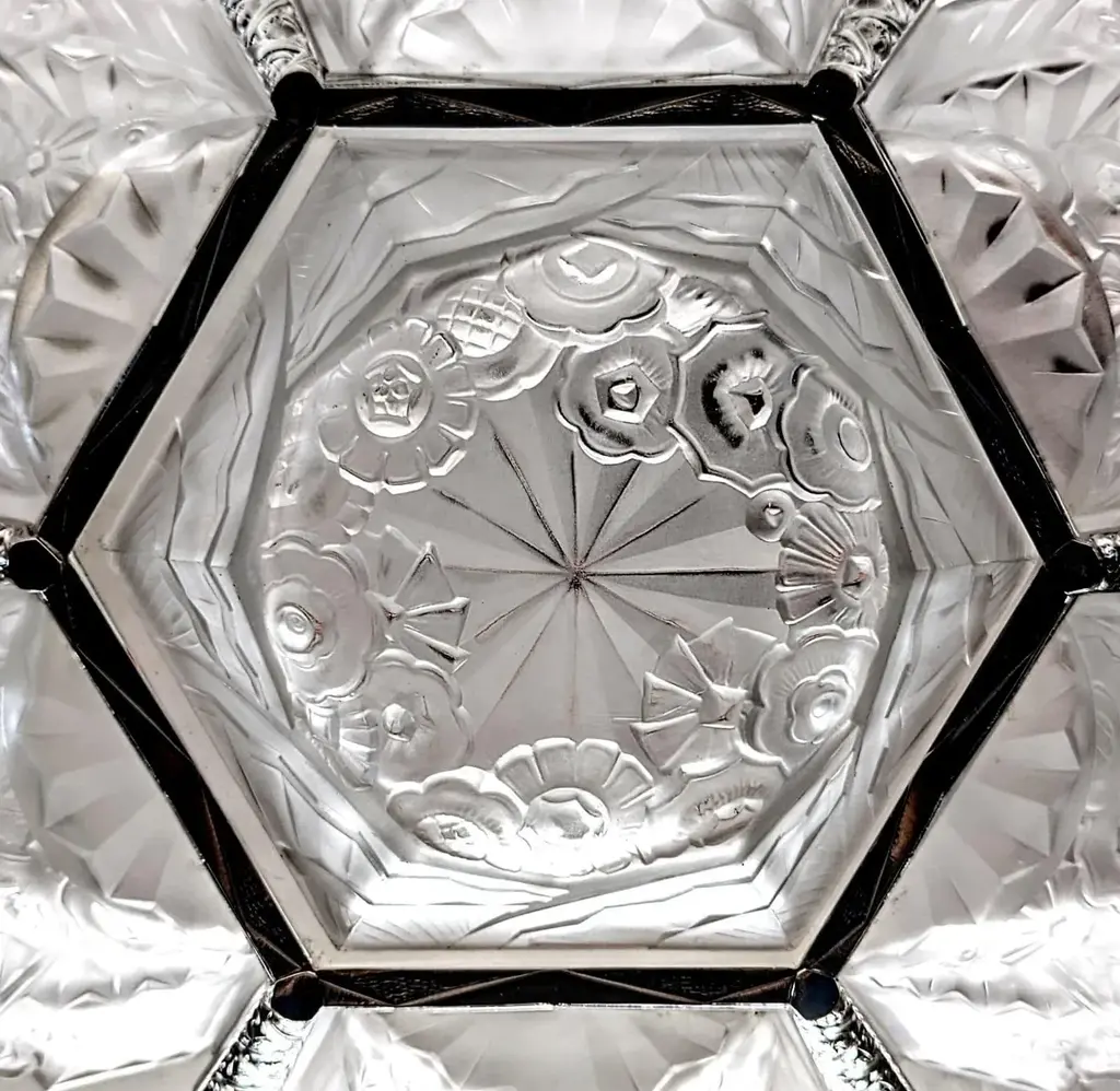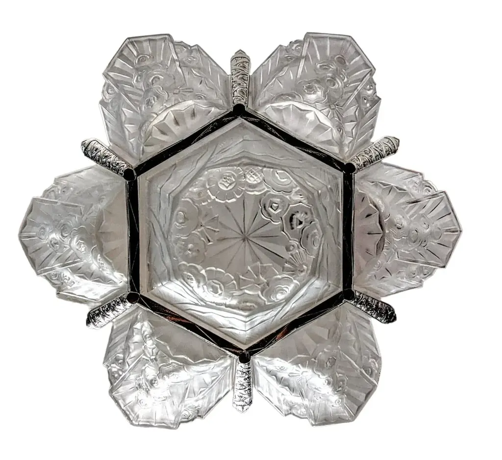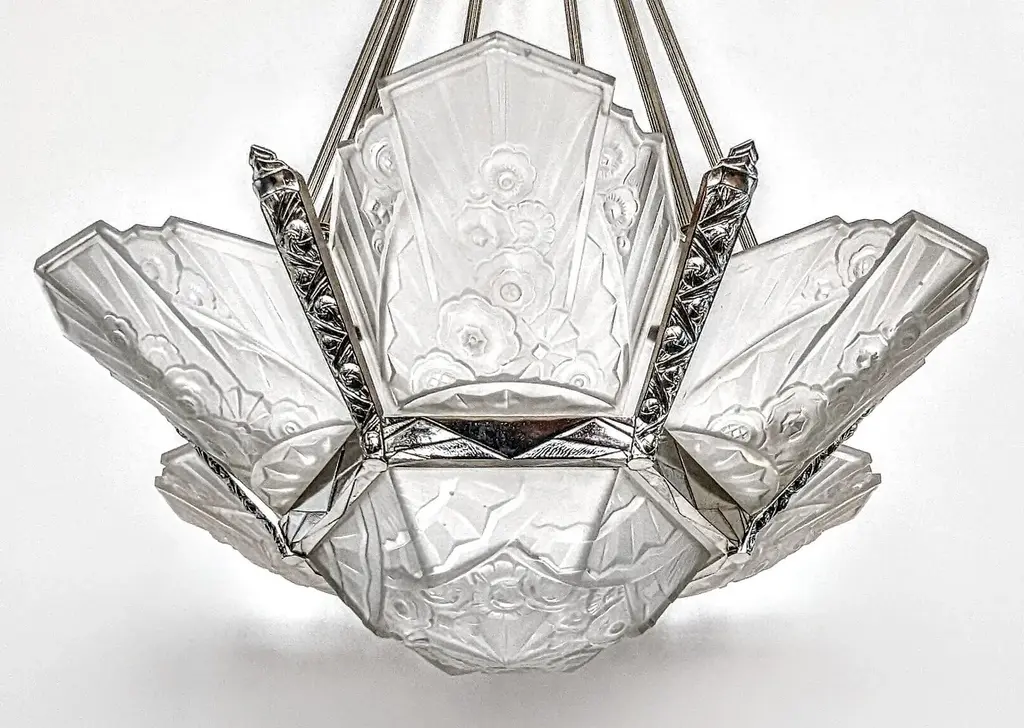A stunning French Art Deco chandelier in grand scale (26" in diameter with 36" drop adjustable) by the French Artist J. Rorobet. It is most uncommon to find two pairs of matching wall sconces, shown in the last photo (Sold separately). The fixture is decorated by Six side panels with a center coupe in clear and frosted glass shades with flower motif details mounted in geometric nickel bronze frames. Replated and rewired to U.S. standards which accommodate twelve candelabra bulbs (E-12 total of 780 watts max). Complimentary drop-off to New York City. We are the rare source that has specialized exclusively in French Art Deco for over three decades, since 1991 with restoration, repair and plaiting for any lighting period located in Long Island City, N.Y. If you are searching for a particular item, we have additional inventory in our collections that may fit your needs. Please feel free to ask any questions by pressing the " ASK THE SELLER " button so we may assist you in finding a wonderful piece that's just right for you.