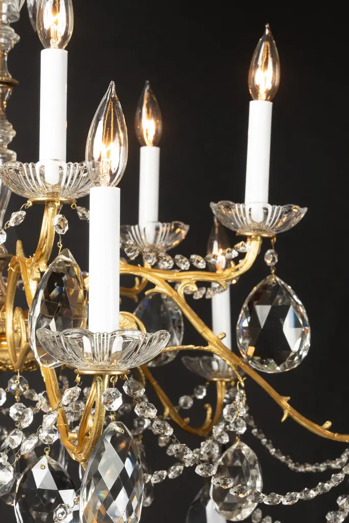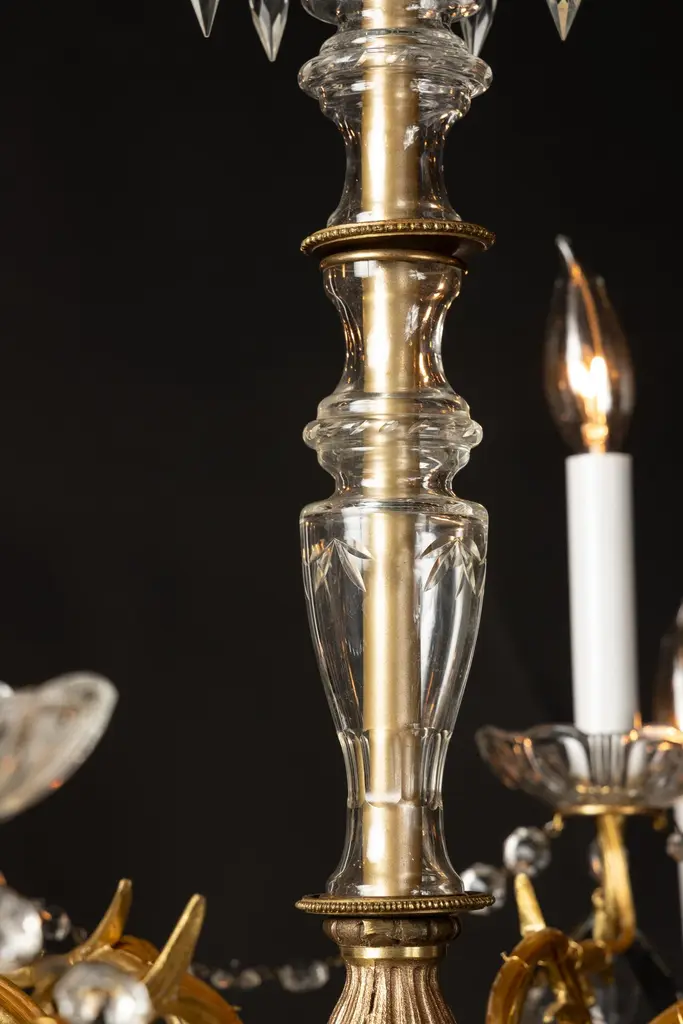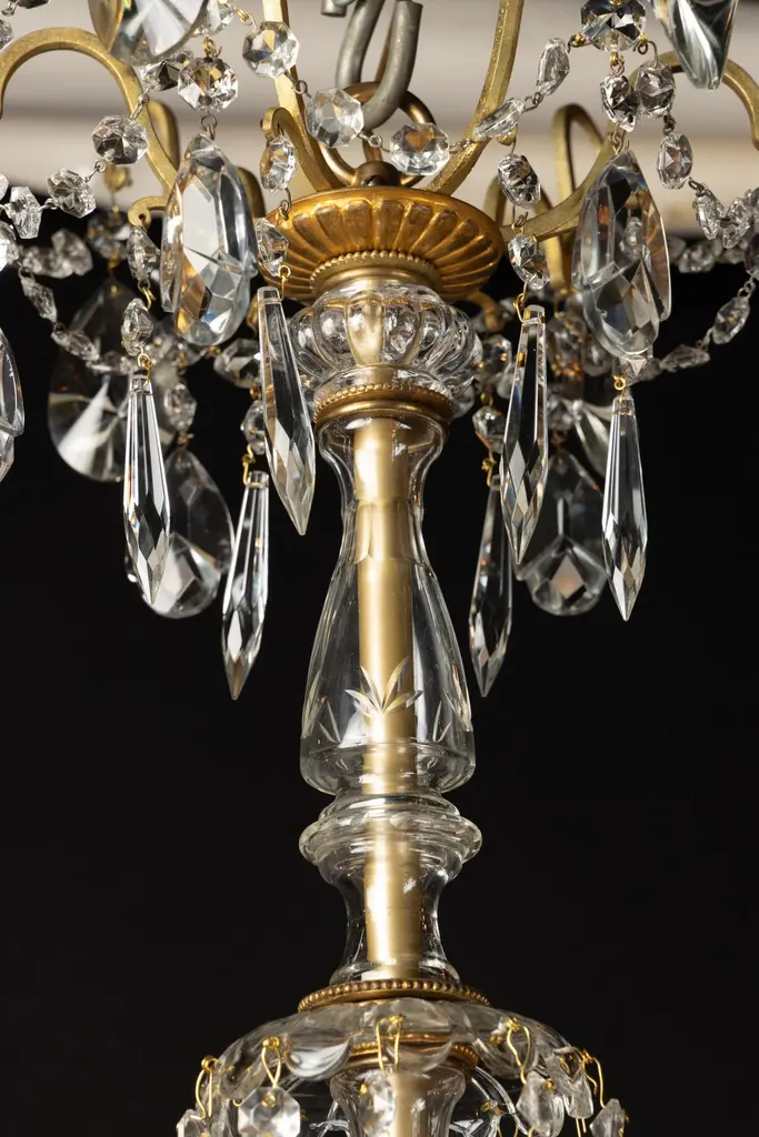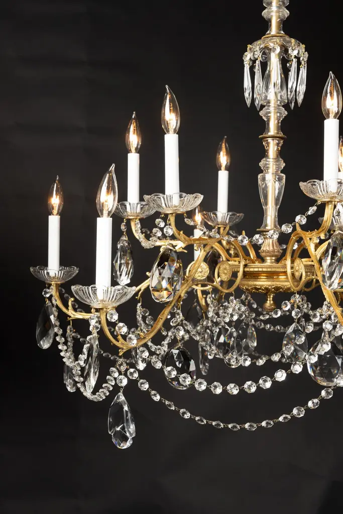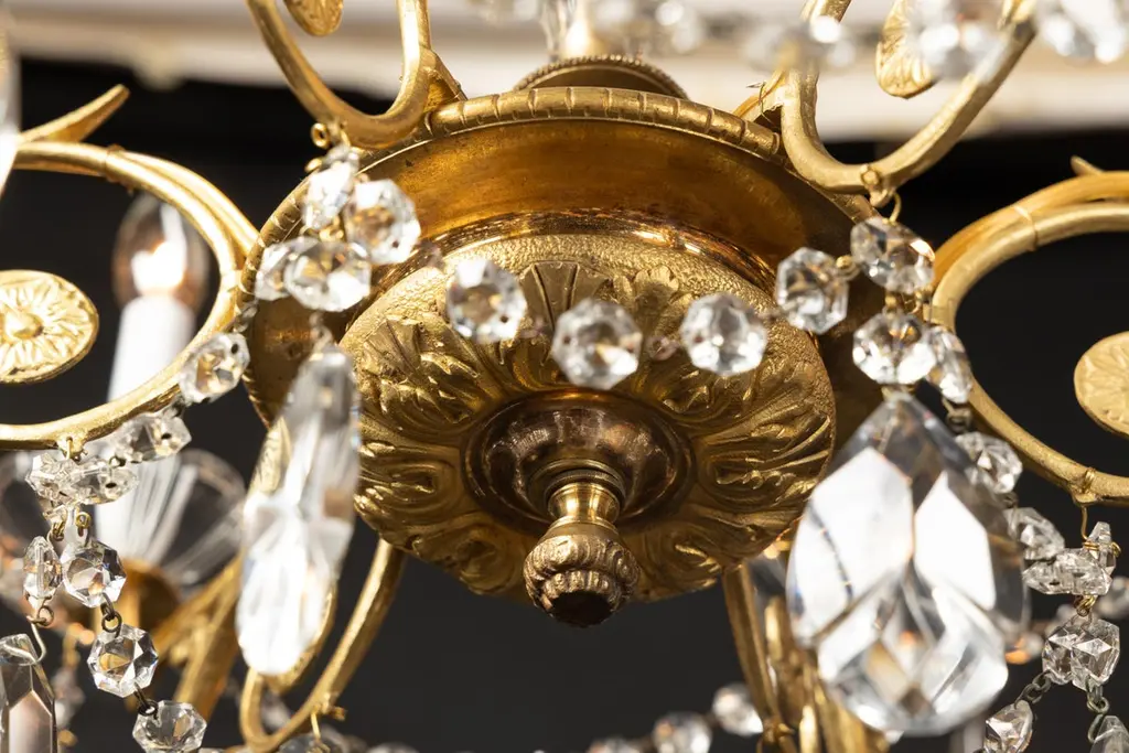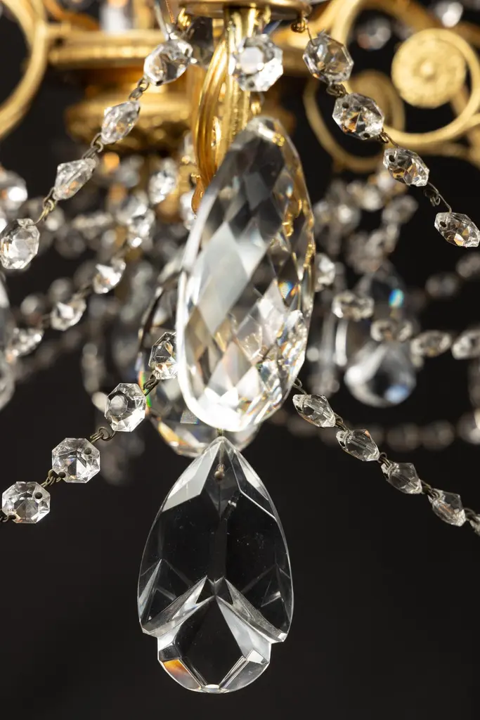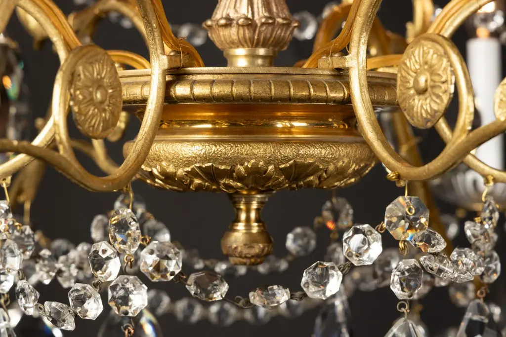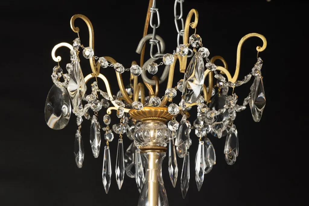 This classic Louis XVI chandelier dates back to the 19th century and features beautiful crystal surrounding the center stem. Ropes of octagonal crystal flows from the long bronze arms to give the chandelier beautiful negative space. This, combined with the long center stem and bronze elements at the crown, produces a sense of length and balance. The piece also features cut and polished crystal plaquettes as well as a delicate tulip crystal finial.Each piece in our shop is professionally rewired and in working order. They have been rewired at our fourth generation antique store in The French Quarter of New Orleans. Each chandelier and lantern comes with a vintage canopy, three feet of chain, and ample wire, and each sconce comes with all materials needed to mount. Each piece is newly wired with UL approved wire and sockets and is fully operable.This piece is a collection of a fourth generation, family owned business in New Orleans called The French Antique Shop. The store was first opened by Marie and Marcel Granet in Paris when they married in 1927. A jewish family, they came to the United States before the outbreak of the Second World War, leaving on the last boat out of Paris' port, Le Havre. When they reached New Orleans, they fell in love with the Vieux Carre as it reminded them of home. Their first shop here in New Orleans was located on Chartres Street in the French Quarter and was stocked originally with pieces they had brought with them from Paris. They moved to Royal Street and settled in their present expanded location at 225 Royal Street in 1947. Today, the shop is run by the third and fourth generation, Marc, and his two sons Michael and Brian. By purchasing from our shop, you're supporting a family run business which focuses on artisan made, high quality craft with an emphasis on quality. Thank you for helping