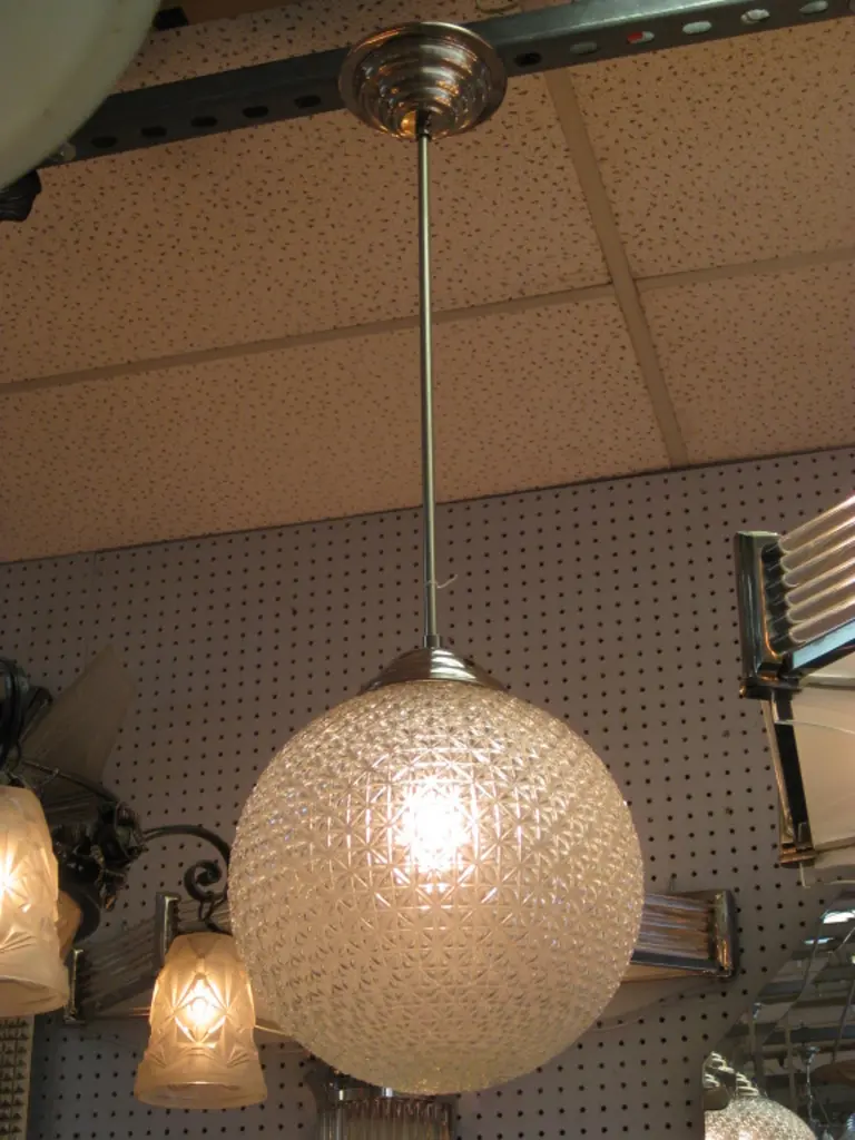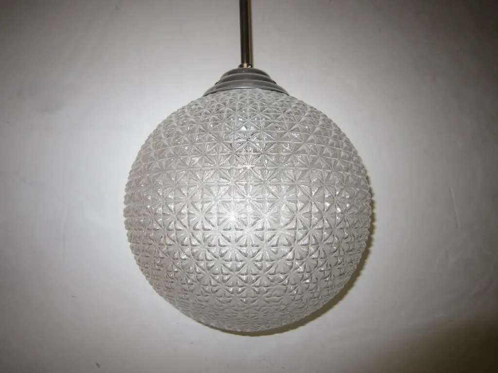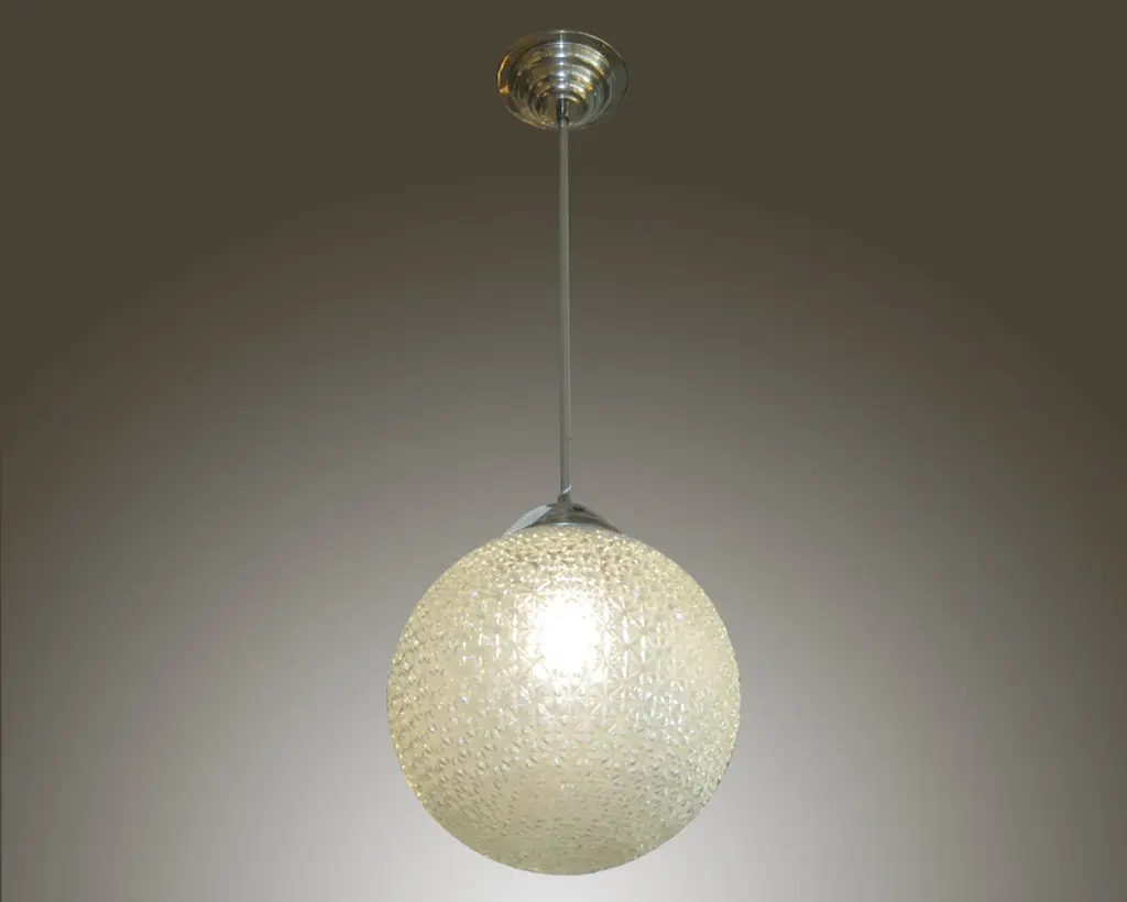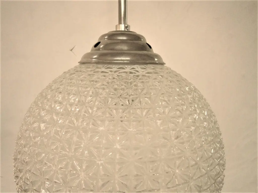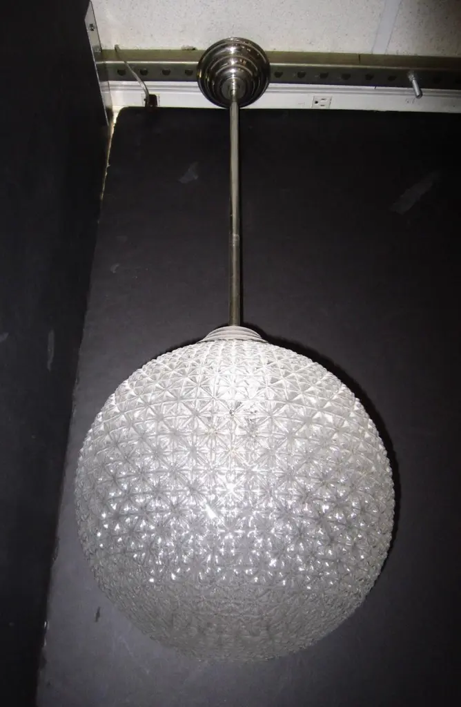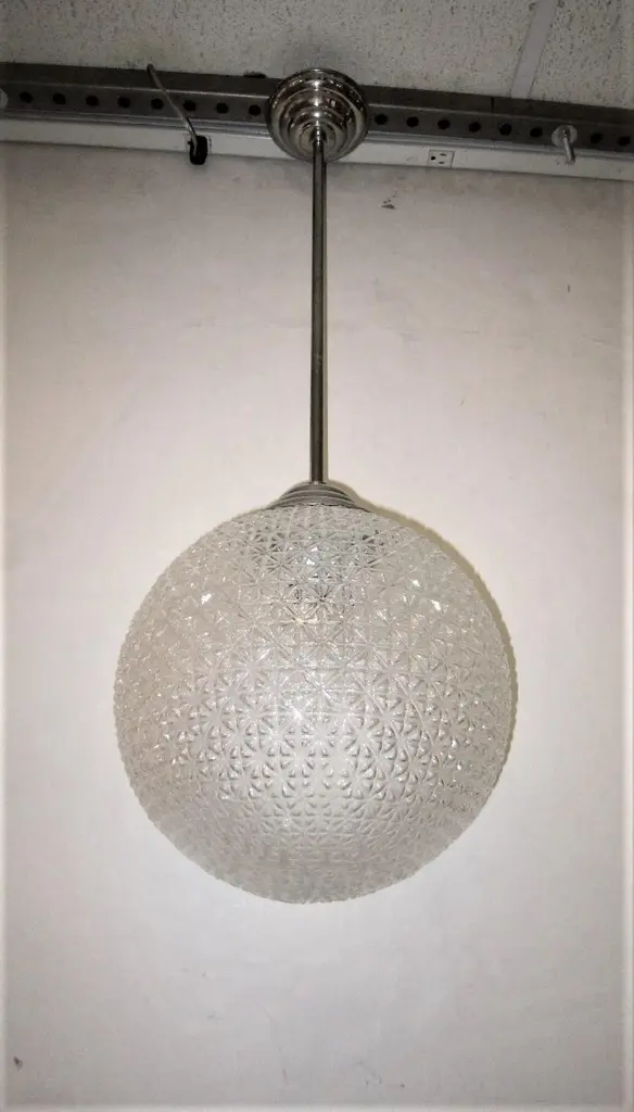 A modernist sphere of molded art glass eleven inches in diameter with diamond patterning gives the impression of finely cut crystal. Dropped from the ceiling on a single stem, from a simple concentrically round canopy; this chandelier is reminiscent of the Swarovski crystal ball that drops on Times Square marking New Year’s Eve. Buying the set, a trio of single stem drop chandeliers would highlight the room with the elegance of fine jewelry.Great over a kitchen island or long hallway, gallery, foyer...Price is for each globe, several available.Can be shortened, lengthened and/ or plated for a surcharge.Round ball shape, warmer color differences are due to the variance from the camera's flash.