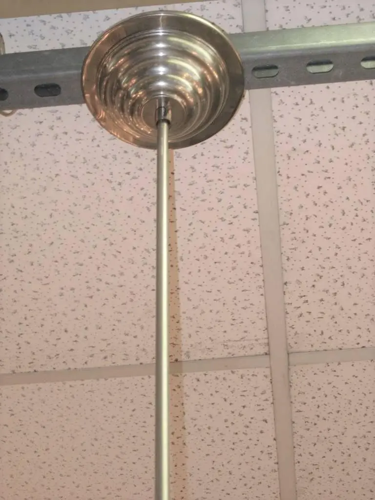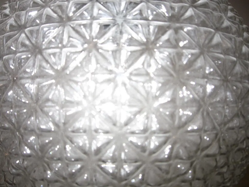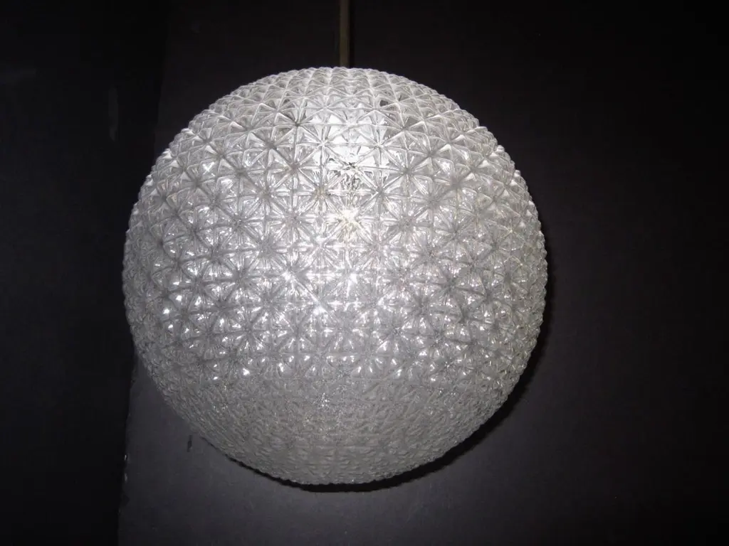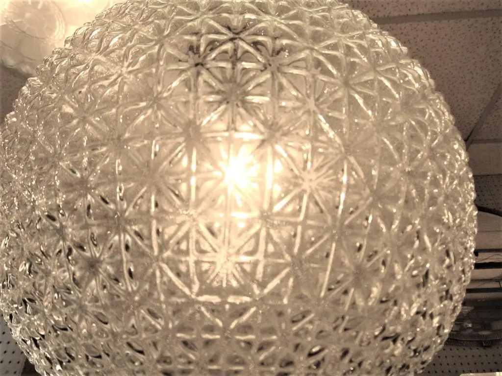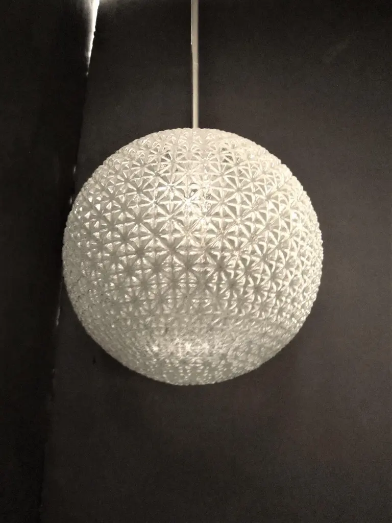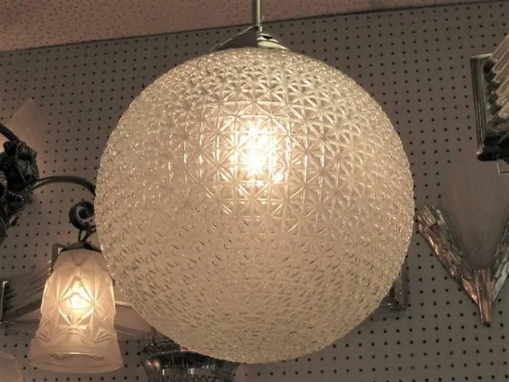 A modernist sphere of molded art glass eleven inches in diameter with diamond patterning gives the impression of finely cut crystal. Dropped from the ceiling on a single stem, from a simple concentrically round canopy; this chandelier is reminiscent of the Swarovski crystal ball that drops on Times Square marking New Year’s Eve. Buying the set, a trio of single stem drop chandeliers would highlight the room with the elegance of fine jewelry.Great over a kitchen island or long hallway, gallery, foyer...Price is for each globe, several available.Can be shortened, lengthened and/ or plated for a surcharge.Round ball shape, warmer color differences are due to the variance from the camera's flash.