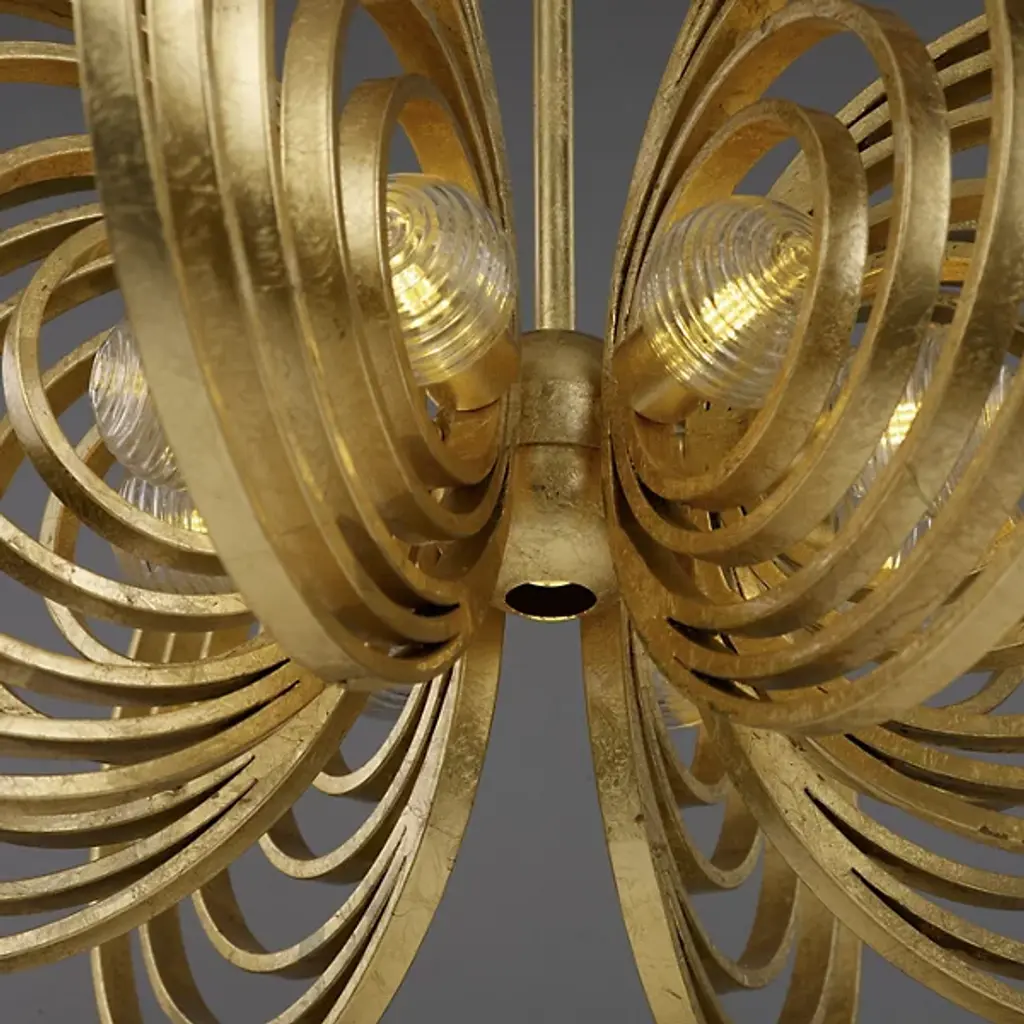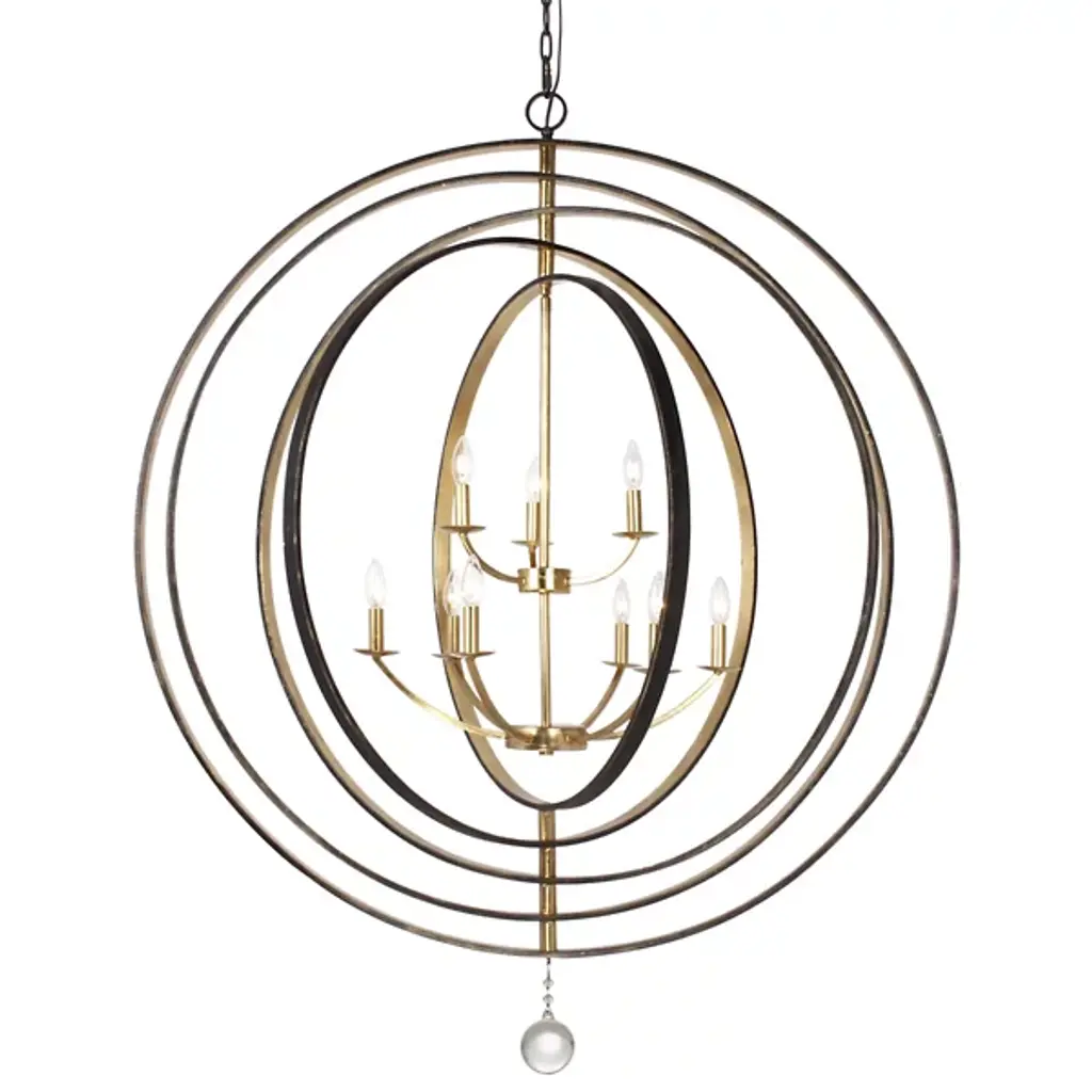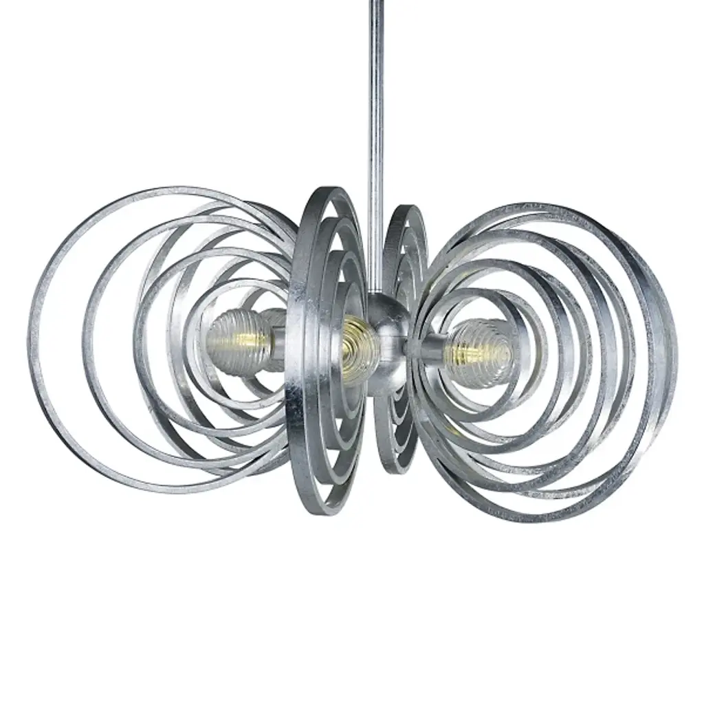 Could you repeat that? Sorry, I couldn’t hear you over the Frequency LED Chandelier by Studio M. Its beautiful avant-garde design is quite booming, what with its groups of concentric Steel circles that each emanate from a central Clear Glass shade which itself has a grooved, rippling design. The LED lighting is really something though, isn’t it, shining through the glass for a beautiful underwater distortion that complements the natural warmth of the finish. What? Just nod if you understand what I’m saying.