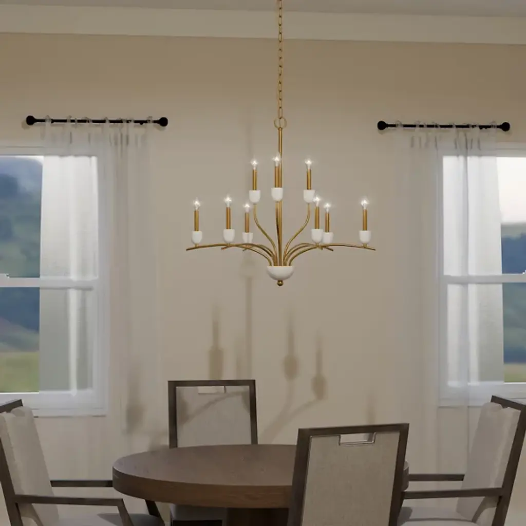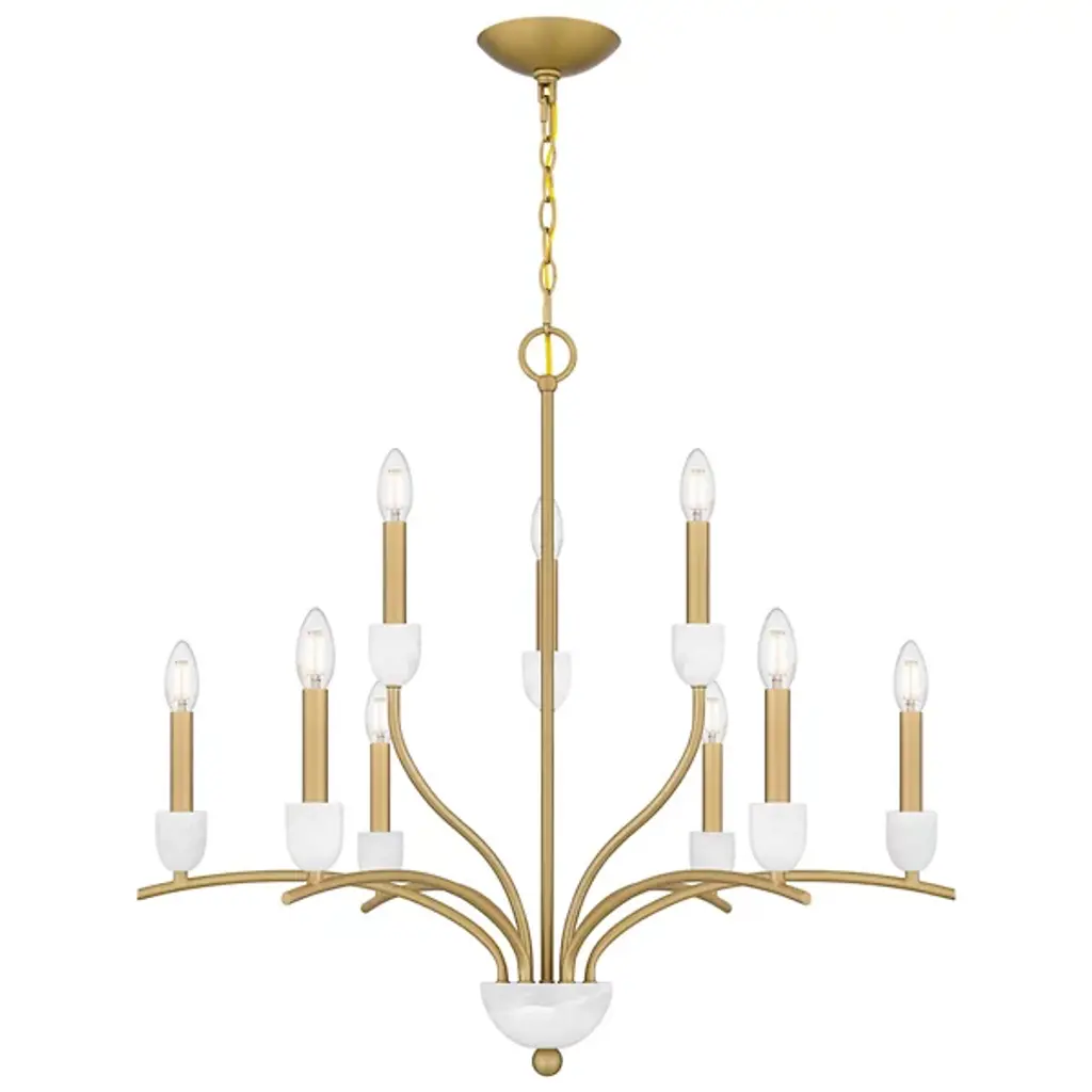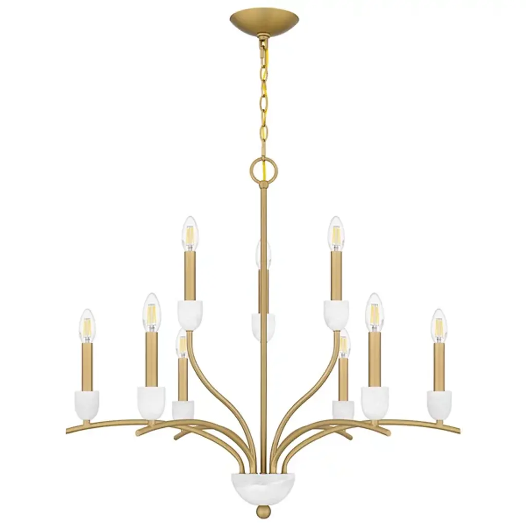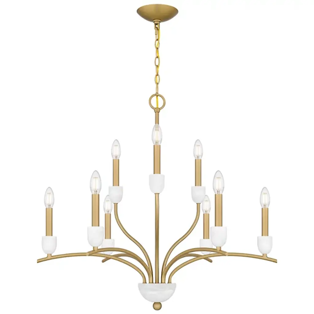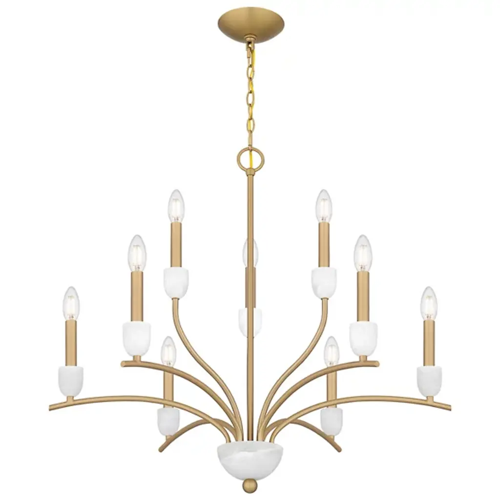 The Frida Chandelier from Quoizel is crafted with exquisite attention to detail. It features candle cups made from luxurious onyx stone, adding a touch of opulence to your space. Its transitional design seamlessly blends charm and stylistic flair, a focal point. Made from durable steel, this chandelier boasts a 2-tiered design with graceful, wending arms that elegantly support the candle cups. A ring and linked chain keep the chandelier securely suspended from a ceiling canopy.