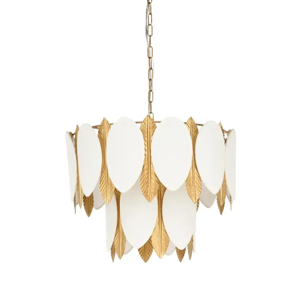 Hand crafted in Italy, frondeggiare chandelier features two layers of antique gold and off white fabric leaves. This five light chandelier provides ample lighting for living areas, entryways and bedrooms. Comes with 6' chain and 4.5" antique brass canopy.
