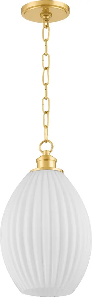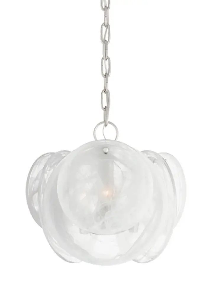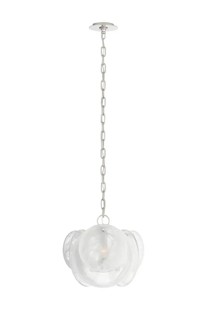 This dainty and elegant chandelier features frosted glass discs with white vein detailing, suspended from the ceiling by an antique brass chain. Loire's unique shape turns a simple pendant light into an intriguing style statement and can be hung along or in multiples above a kitchen island or dining table.