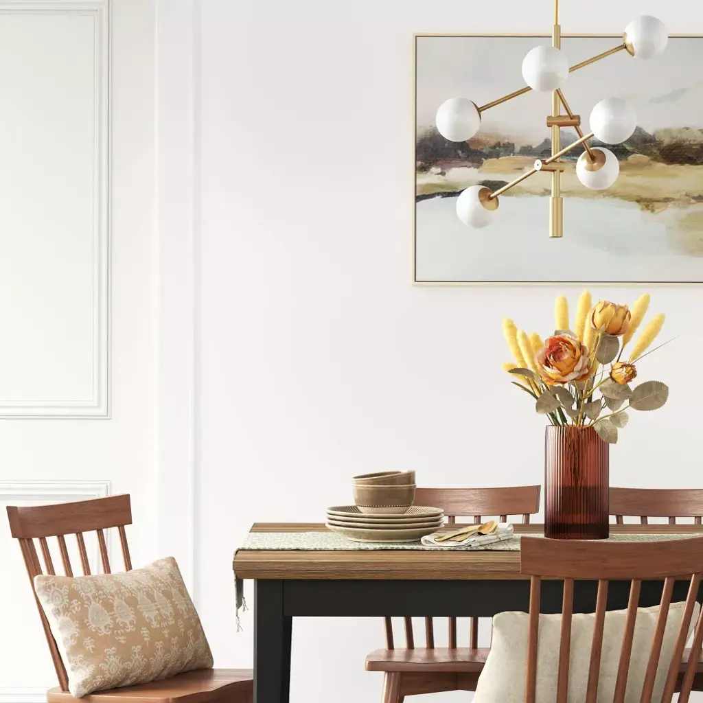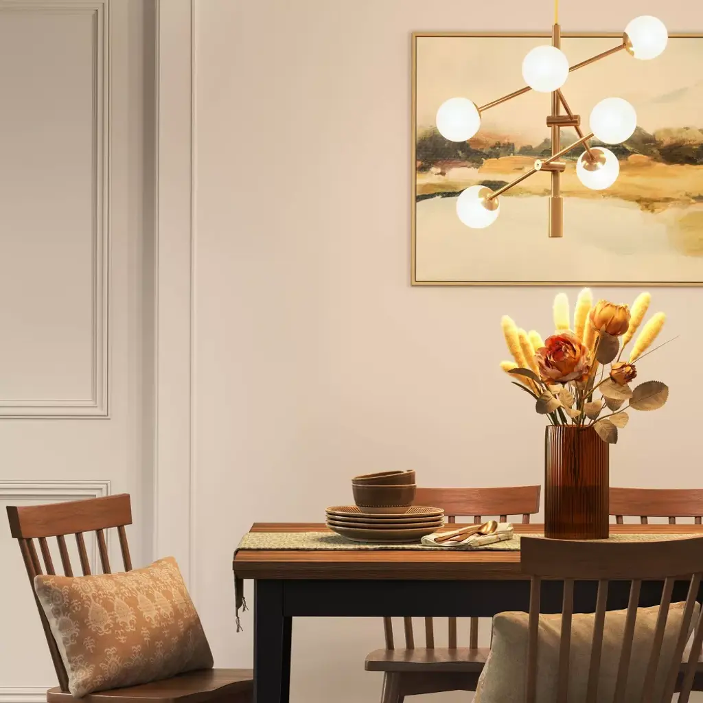 Add a dash of glowing appeal to your indoor space with this Frosted Glass Geneva Globe Chandelier from Threshold™. Crafted from solid metal with a glossy brass finish, this chandelier showcases a sleek body with 6 frosted glass geneva globes attached to the arms to create a focal point in your space, while adding the perfect amount of light to your space. Plus, the included dimmable LED bulbs allow you to customize lighting ambiance and mood. Whether hung in the living room or above a dining table, this chandelier makes the perfect choice to beautifully illuminate any space.Overall Height of Lamp: 18.25 inchesOverall Width of Lamp (Diagonal): 22.25 inchesHeight of Stem: AdjustableDiagonal Length Between Bottom Lights: 22.25 inchesDiameter of Mounting Plate: 5.0 inchesHeight of Mounting Plate: 1.0 inchesDiameter of Glass Shade: 4.0 inches