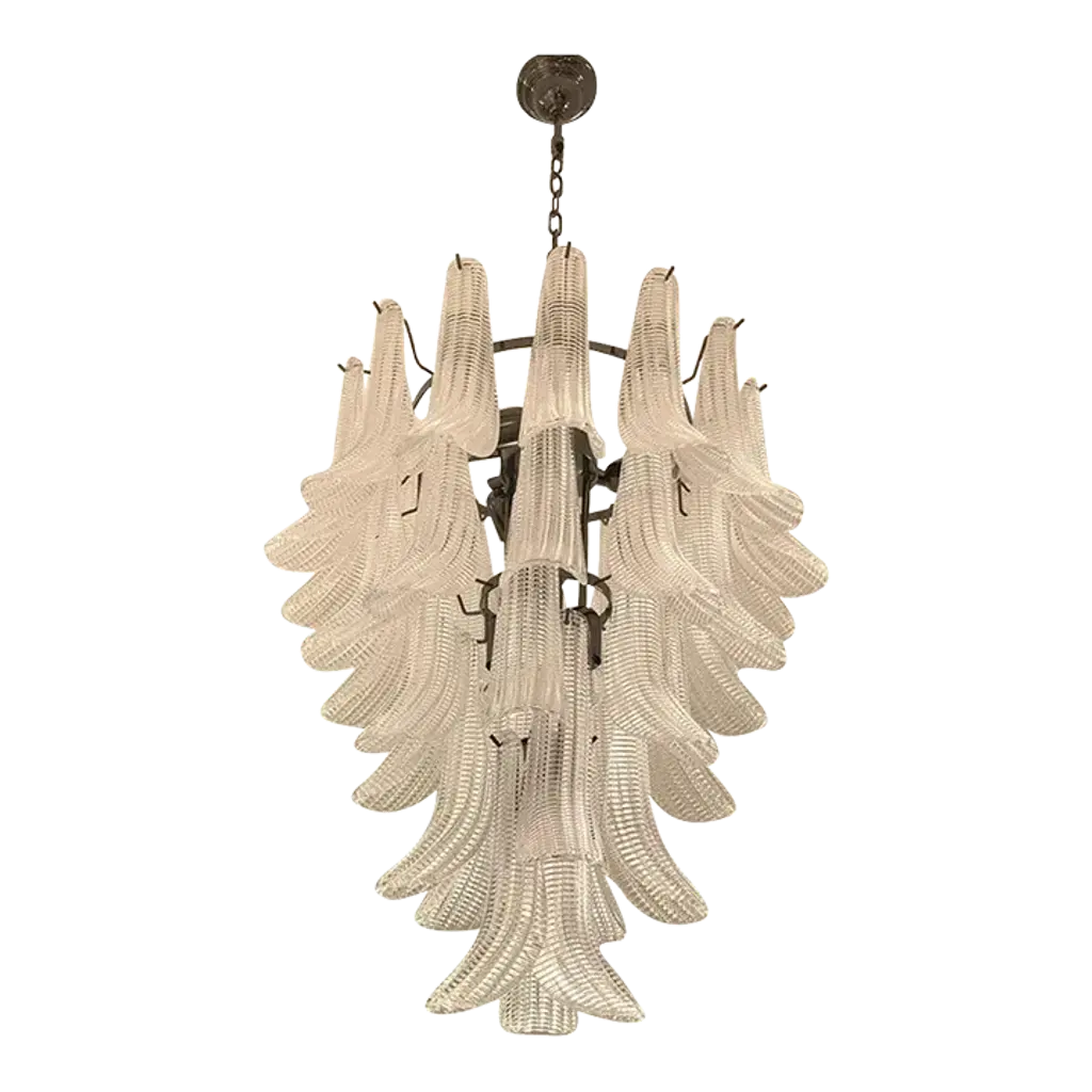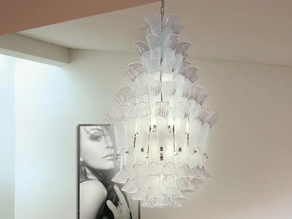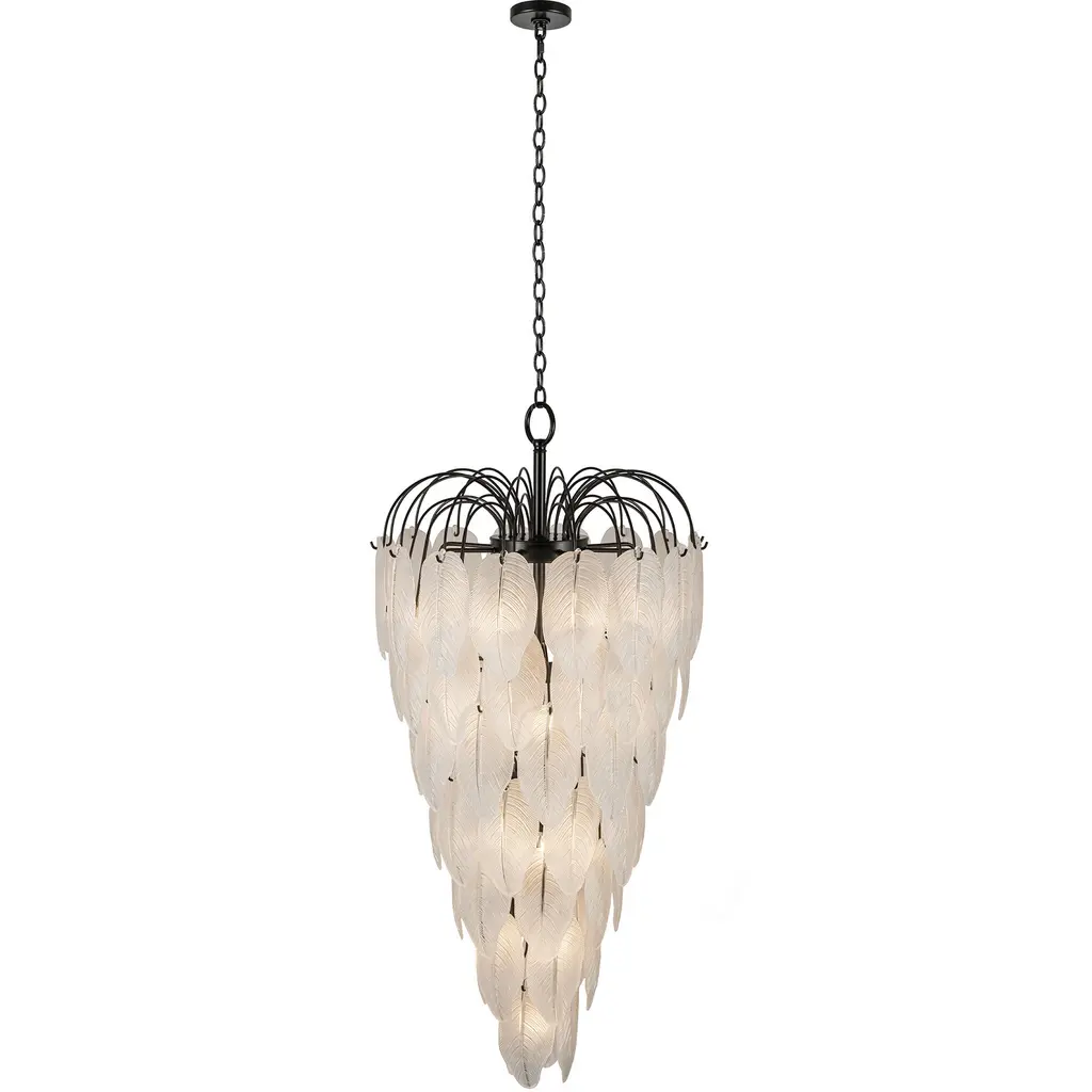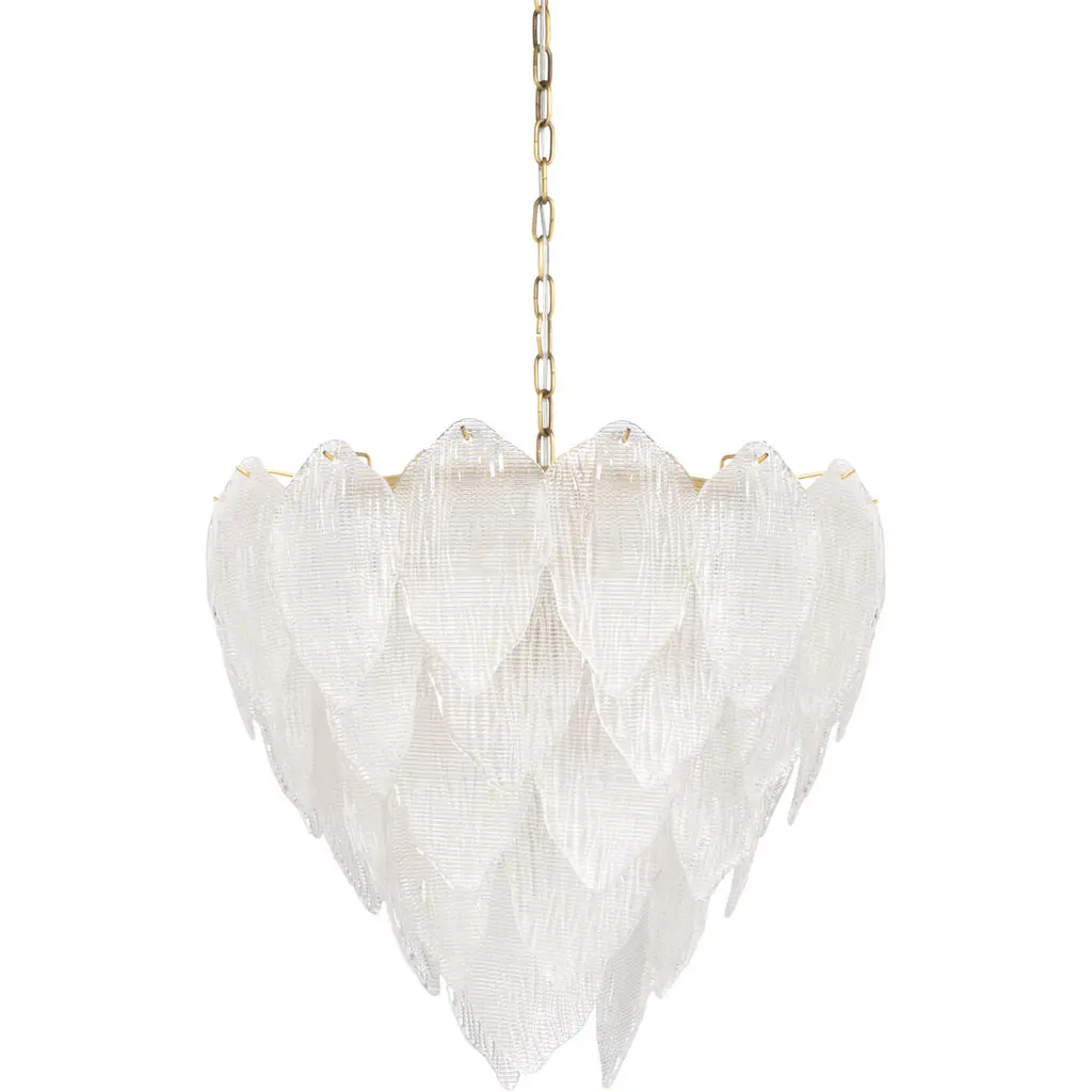 A nine-light chandelier in antique gold leaf with three layers of frosted glass petals. Candelabra Base, 25 Watt Max, 9 Type B Bulbs, Canopy: 6", Chain: 10'