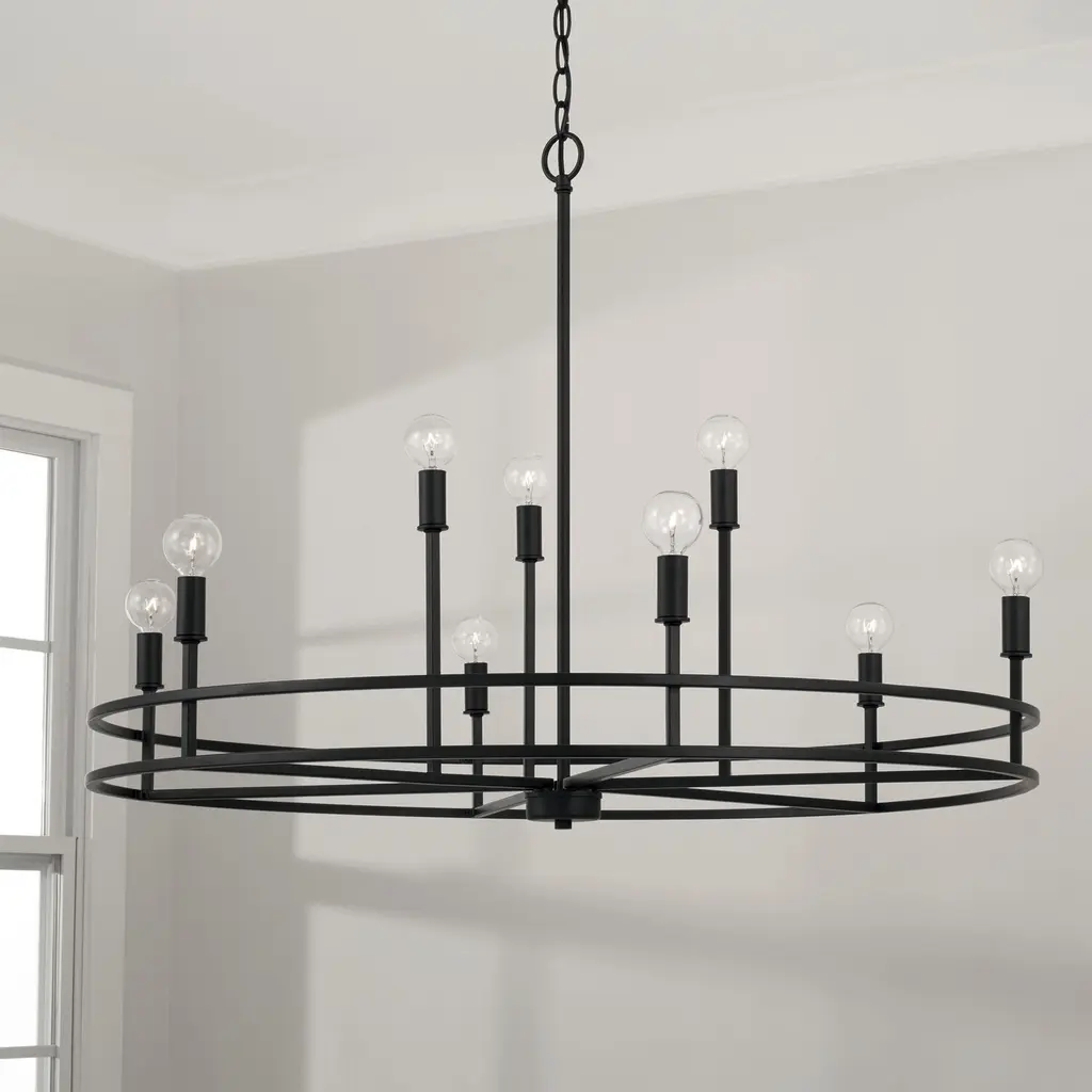 Sleek lines and a contemporary shape create the Fuller 9-Light Chandelier for HomePlace. Staggered tiers of light illuminate the circular form, while the Matte Black finish brings modern sophistication to any space.