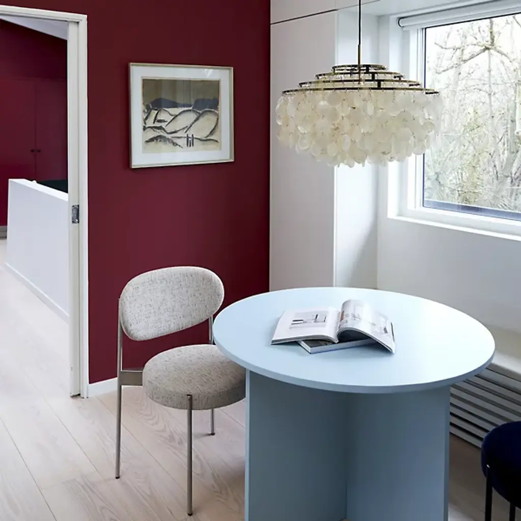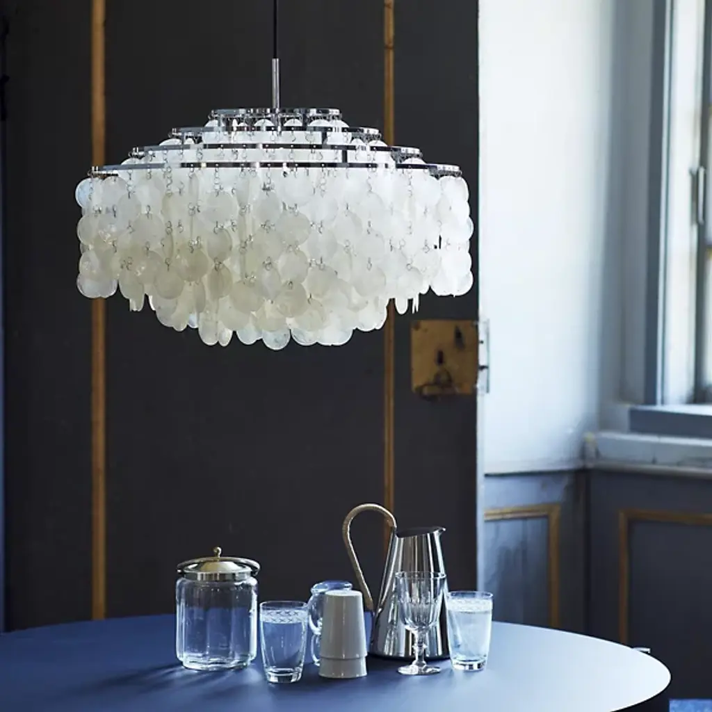 The Fun 10DM Chandelier from Verpan is an opulent lighting solution designed by Verner Panton. It features a plethora of beautiful seashell discs that careen around a collection of steel rings arranged in tiers positioned in proximity to one another for a refined, contemporary look. A downrod is secured by a ceiling canopy, letting Fun maintain its suspension in midair. Your chandelier emits bright LED light from above that enhances the visibility of your living space.