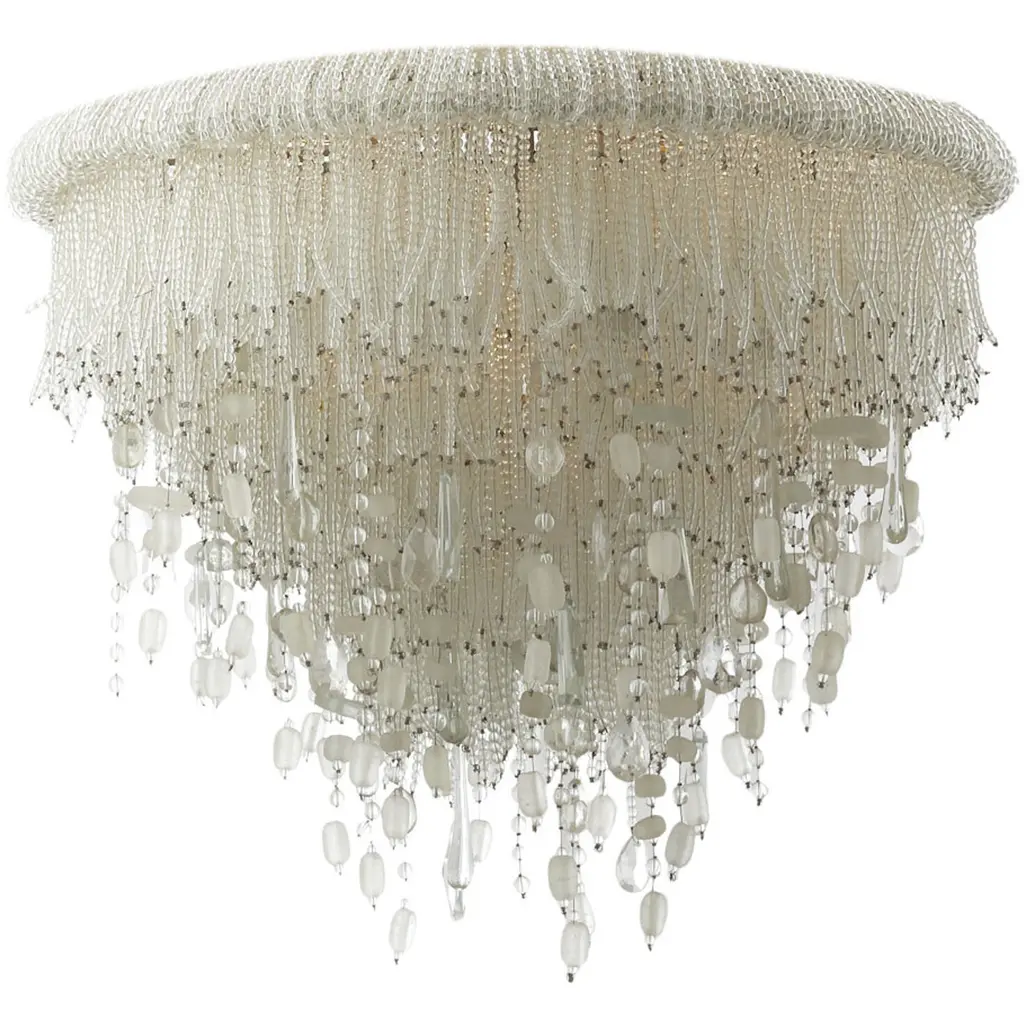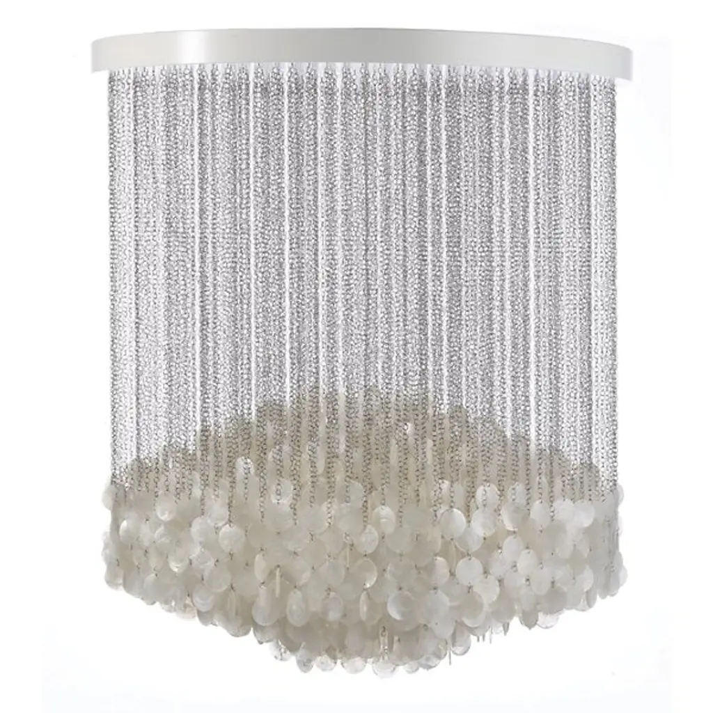 The Fun 7DM Chandelier from Verpan enlivens ceilings with a billowing cloudlike form that sheds generous radiant light all around it. An inspired creation from the mind of renowned designer Verner Panton, it started in 1964 and has been going strong since. Fine chains and a circular canopy give the fixture a retro feel while a shade made of seashell discs ensure that no two are exactly identical, creating individual pieces. The shade structure appears to float, transmitting a radiant warmth around the fixture that burnishes the metalwork above.