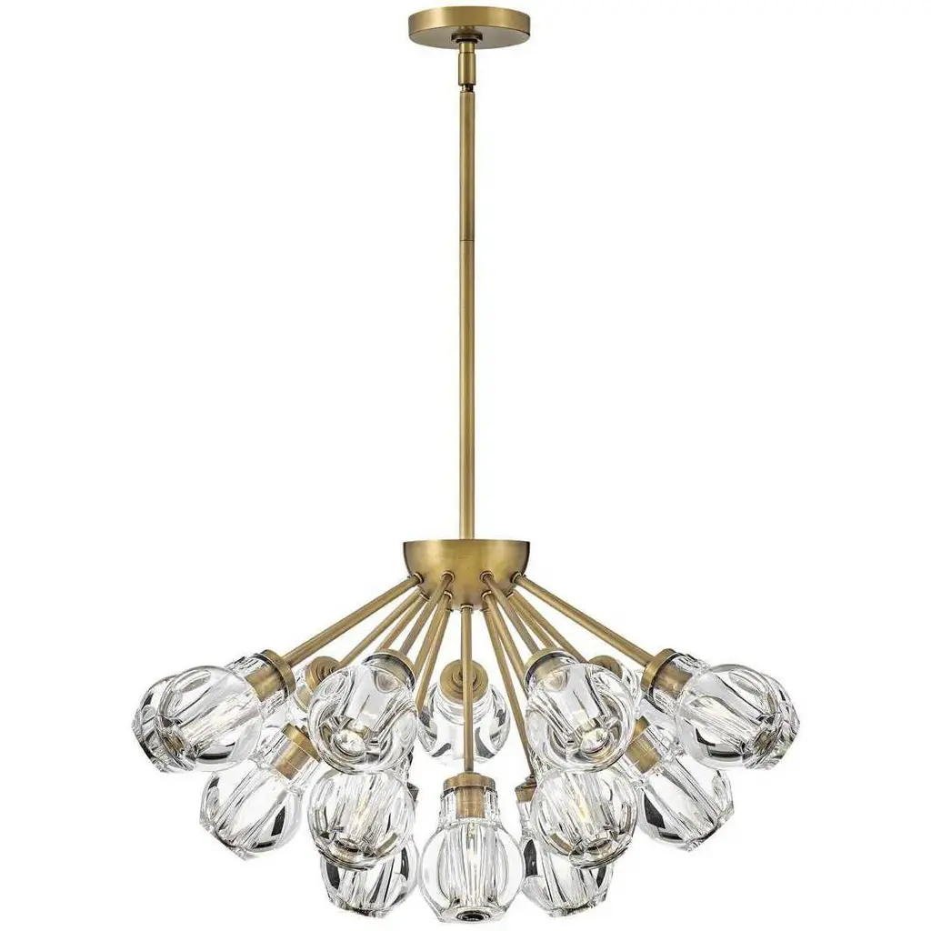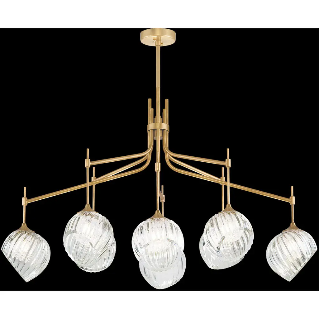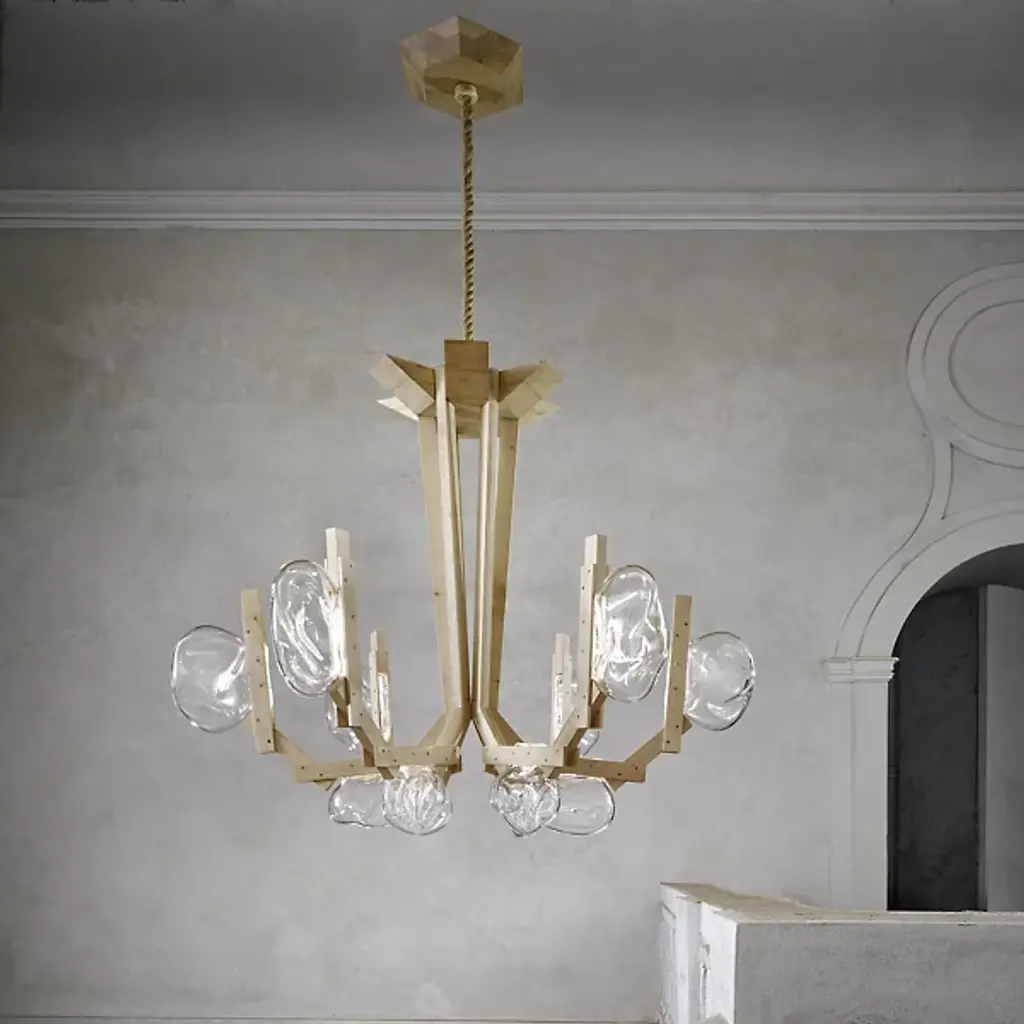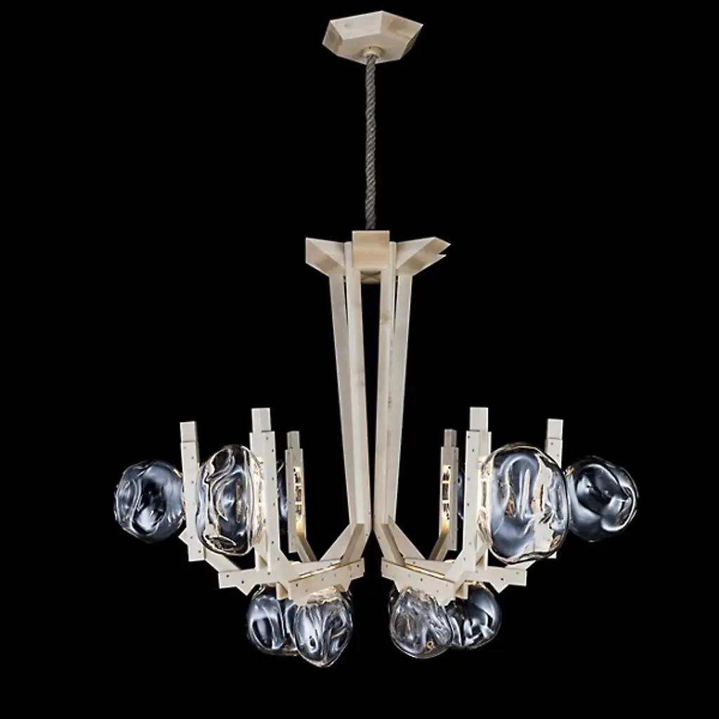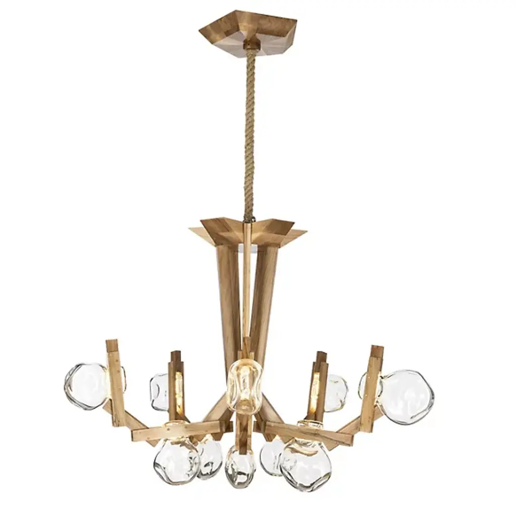 Lend a pleasant character to inside spaces with the playful, abstract structure of the Fungo LED Chandelier from Lasvit. A striking creation of angular ash wood planes, it extends down from a beveled, hexagonal canopy along a slender cable, using slender arms reaching down and then upward from a central hub to add a constructed style while seating LED lamping between wooden bars. The direct light is gentled by curving fins of clear blown glass that sweep out around the lamping, contrasting with the natural grain of the wood while spilling a warm ambiance around the fixture.