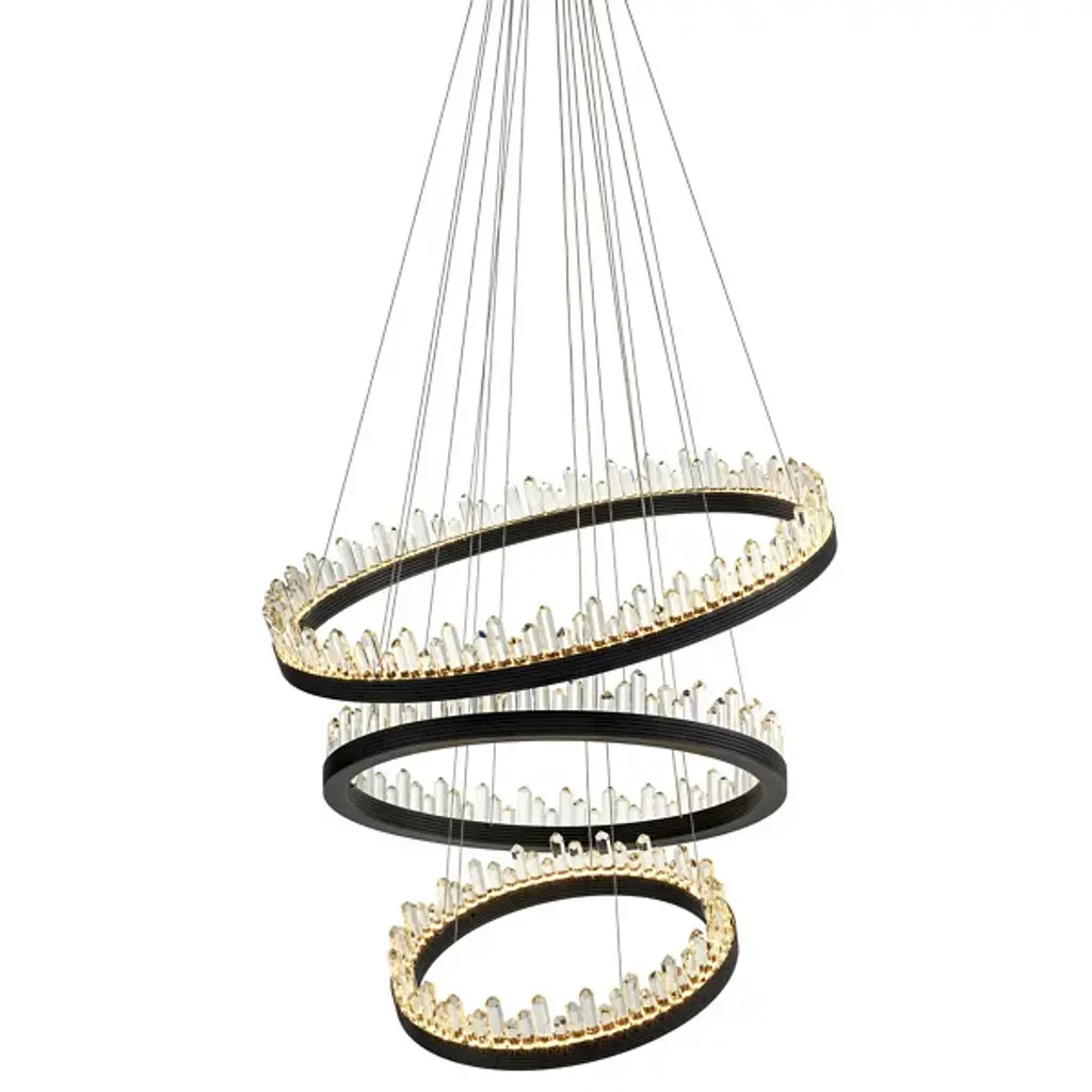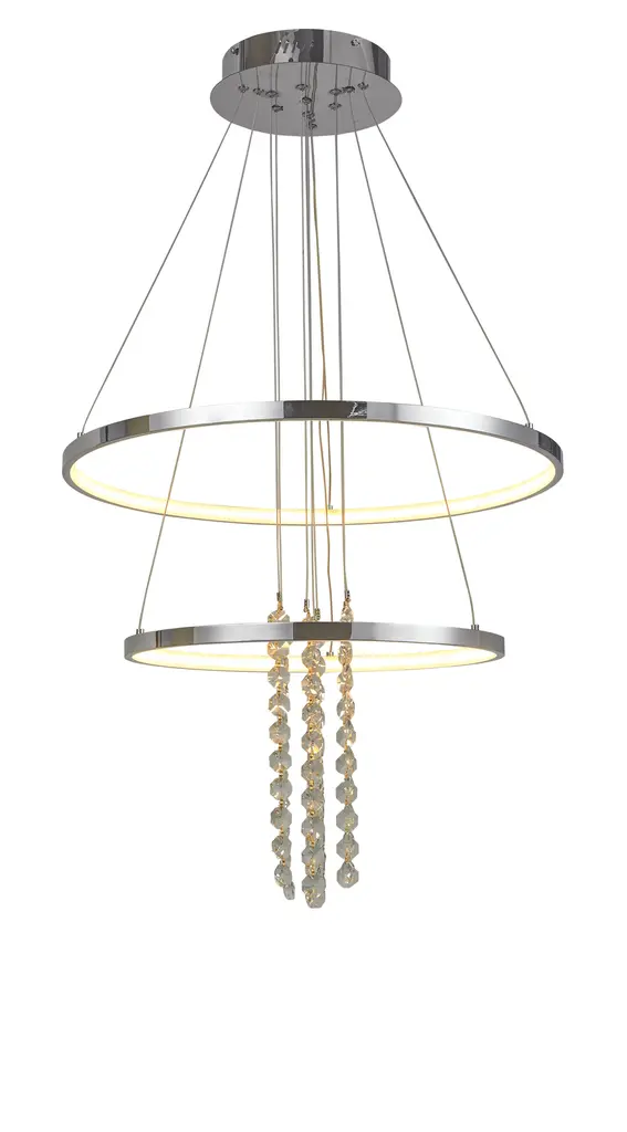 Fusion collection with Chrome, two tiers illumined with faux crystal accents, with 80W LED, 3000K integrated bulbs 80+ CRI, 7200 Lumens. Adjustable heights upon installation, dimmable with Triac dimmers. 5 year warranty.