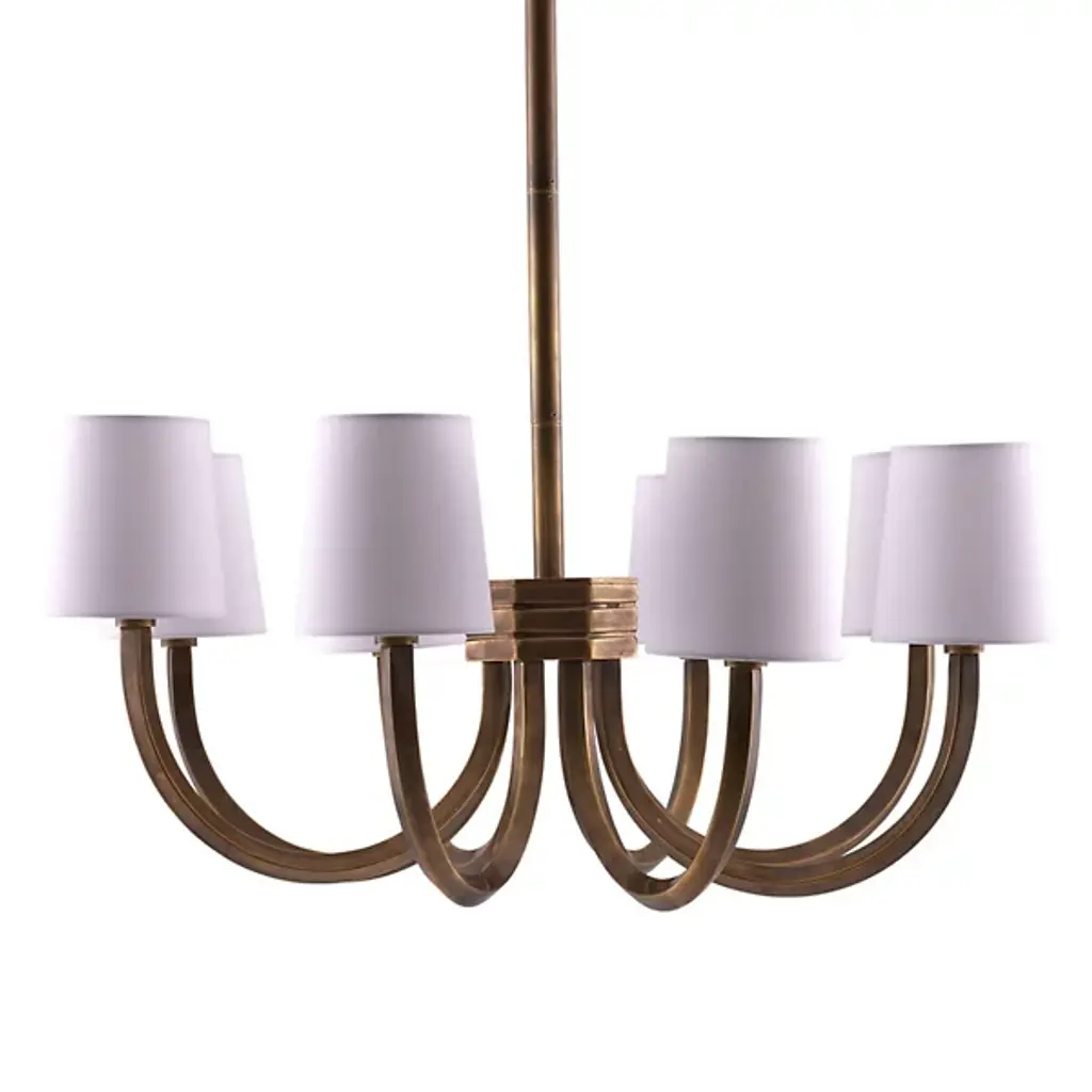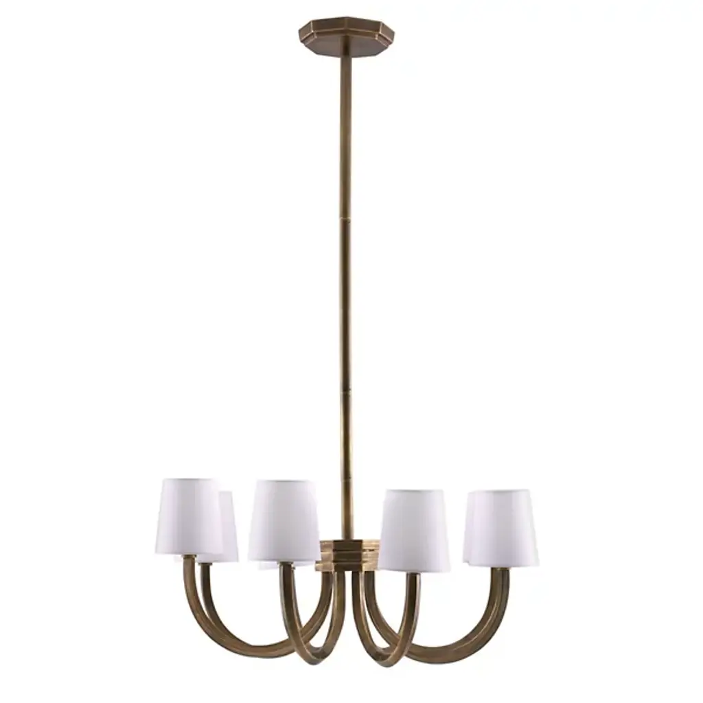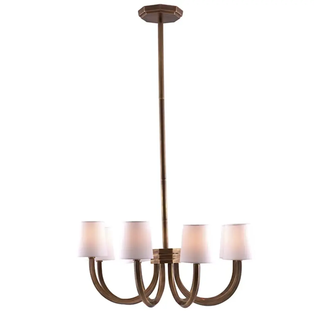 The Gaetano Chandelier from Arteriors goes bold with a composition of clean outlines. This modern design lets the room feel open and inviting with minimal decoration. This refined look makes it a great choice in the foyer, dining room, or living room. Crafted in metal, the contoured piece streams down with a slender rod. Similarly slender arms radiate out in deep curves with sharp edges. The bold hues of the arms pop against the clean neutral hues of the microfiber shades. These familiar tapered cylindrical shades transform into golden vessels as they send out a filling aura.