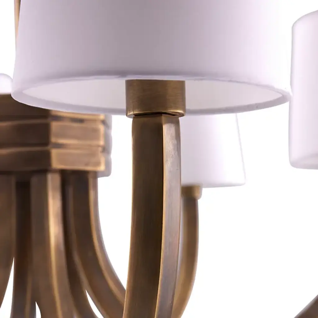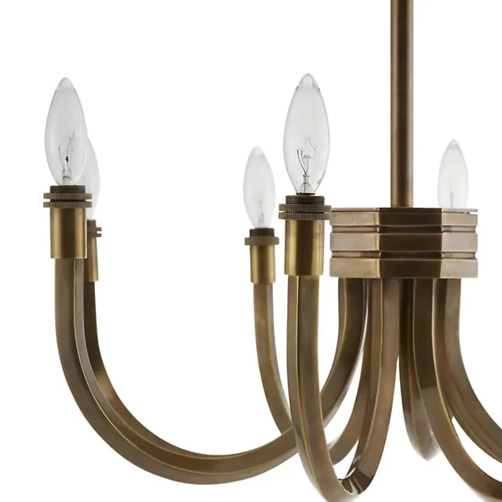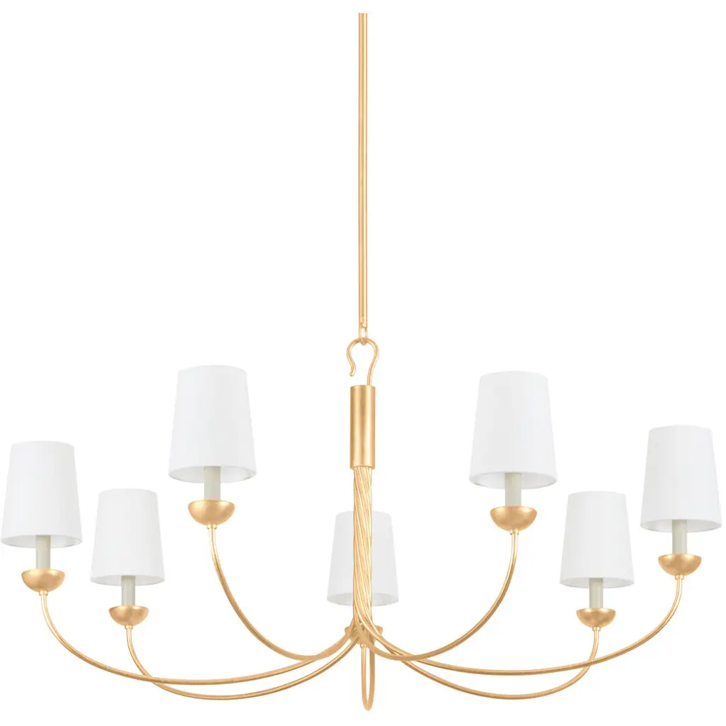The Gaetano Chandelier from Arteriors goes bold with a composition of clean outlines. This modern design lets the room feel open and inviting with minimal decoration. This refined look makes it a great choice in the foyer, dining room, or living room. Crafted in metal, the contoured piece streams down with a slender rod. Similarly slender arms radiate out in deep curves with sharp edges. The bold hues of the arms pop against the clean neutral hues of the microfiber shades. These familiar tapered cylindrical shades transform into golden vessels as they send out a filling aura.