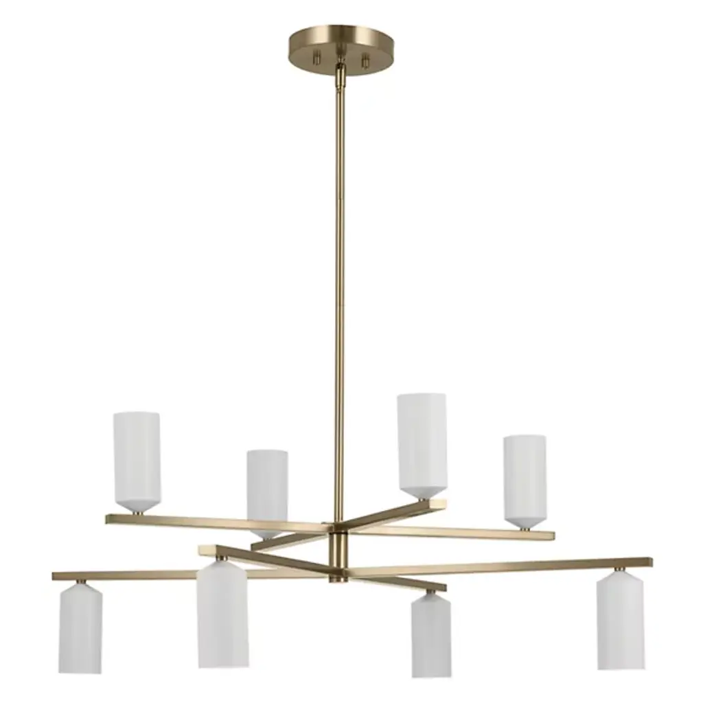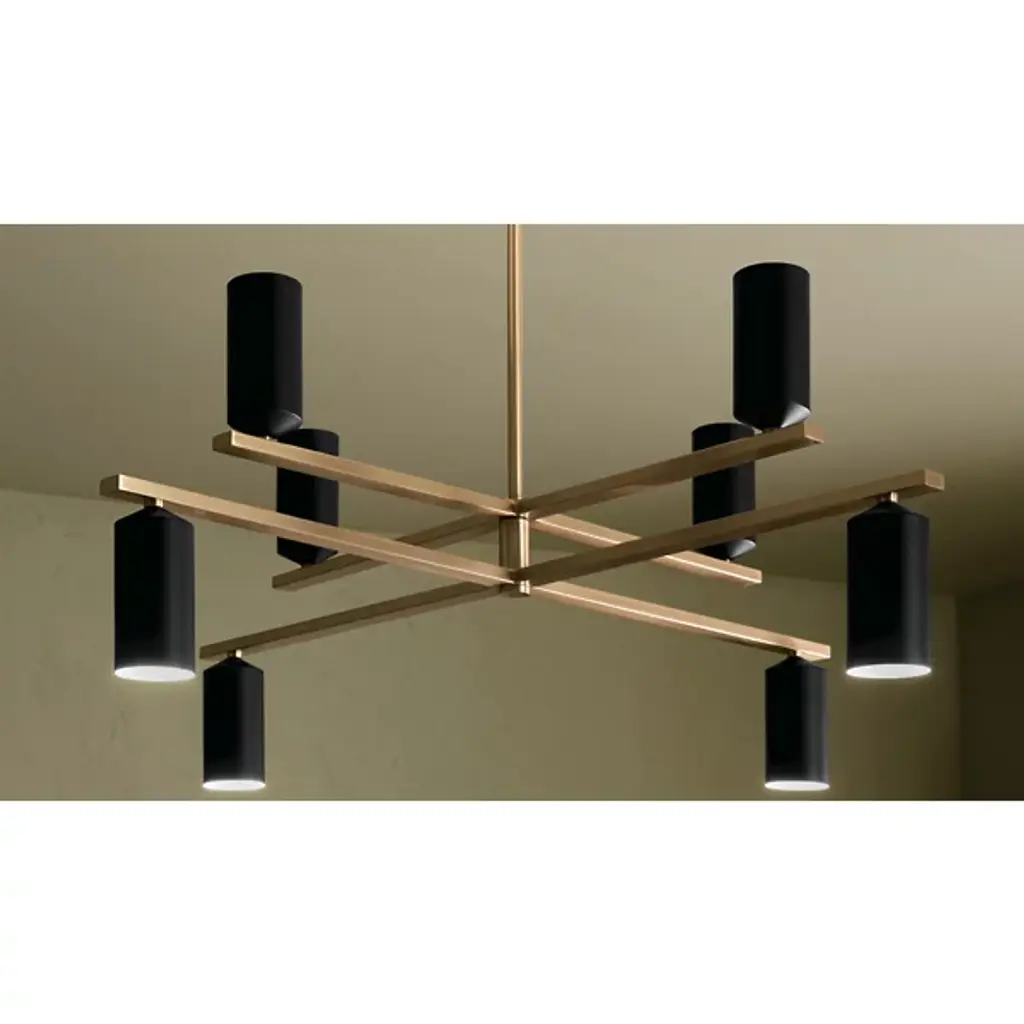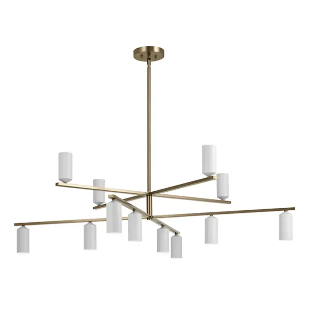 The Gala Chandelier from Kichler presents a memorable sculptural design that commands immediate attention. Retained by a circular canopy, it transmits a slender stem to dual crossbar forms below, each end extending lamping within a cylindrical shade. The top and bottom clusters rotate independently of each other, allowing for an incredible variety of configurations. The top cluster faces up for indirect uplight that reflects from the ceiling, while the bottom cluster transmits a constellation of focused direct downlight.