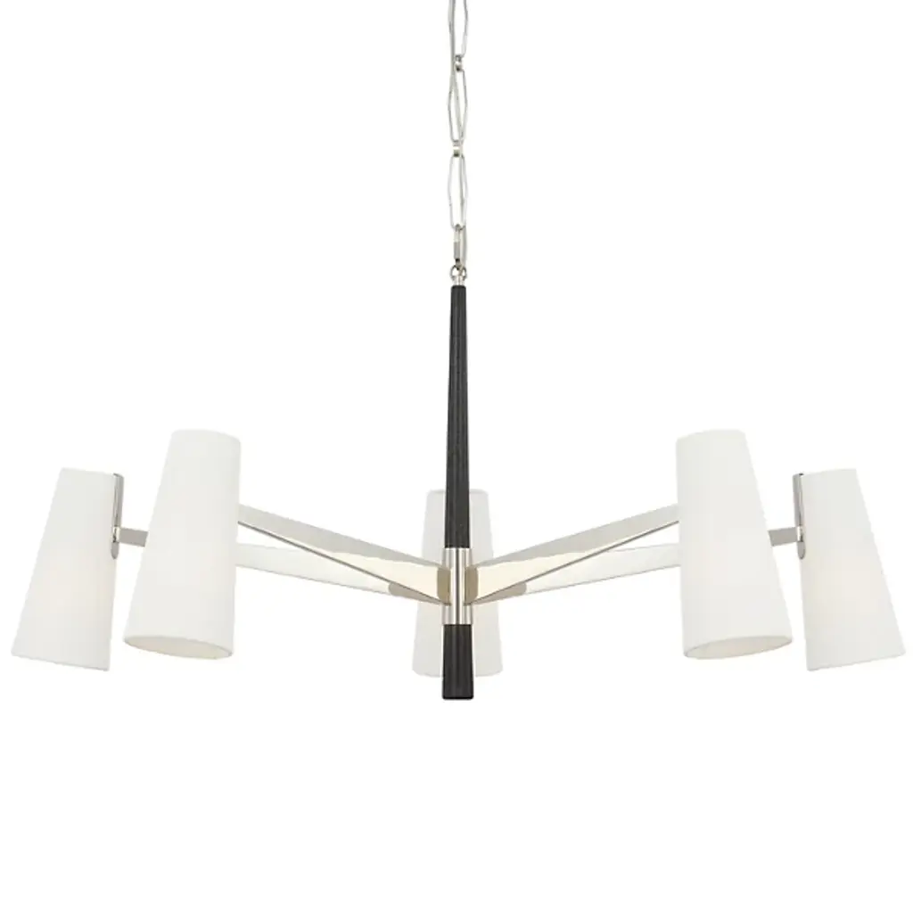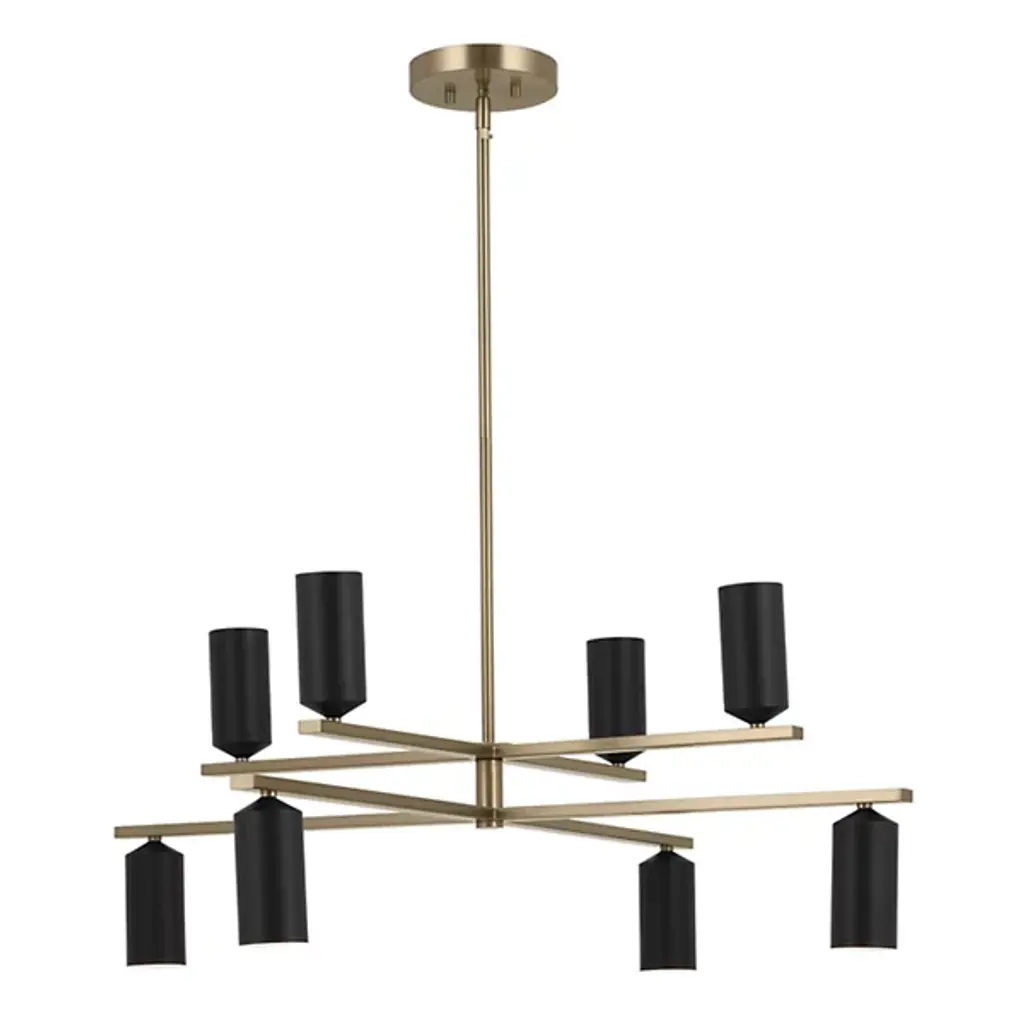 The Gala Chandelier from Kichler presents a memorable sculptural design that commands immediate attention. Retained by a circular canopy, it transmits a slender stem to dual crossbar forms below, each end extending lamping within a cylindrical shade. The top and bottom clusters rotate independently of each other, allowing for an incredible variety of configurations. The top cluster faces up for indirect uplight that reflects from the ceiling, while the bottom cluster transmits a constellation of focused direct downlight.