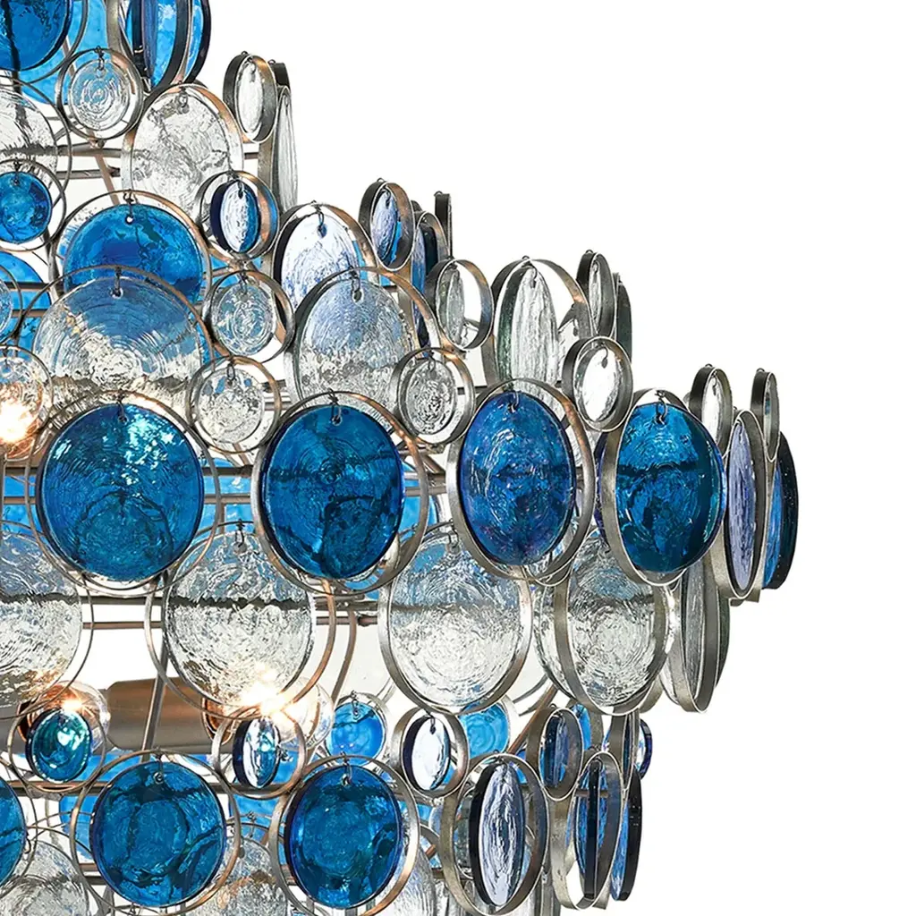 The Galahad Blue Chandelier has recycled glass and recast glass discs that are individually attached by hand to hang from its immense wrought iron frame finished in contemporary silver leaf. The size of this chandelier with its intermingling of clear and blue glass discs is impressive, as are the reflected hues that glint through the circlets that make up the shade. Adjustable from 47.5" to 130" with use of included chain/rod kit/cable. If your space calls for a longer drop, additional chain/rods/cable is available for purchase. Ships In 7-10 Business Days This image is for illustrative purposes only. The colors shown are accurate within the constraints of lighting, photography, and the color accuracy of your screen.