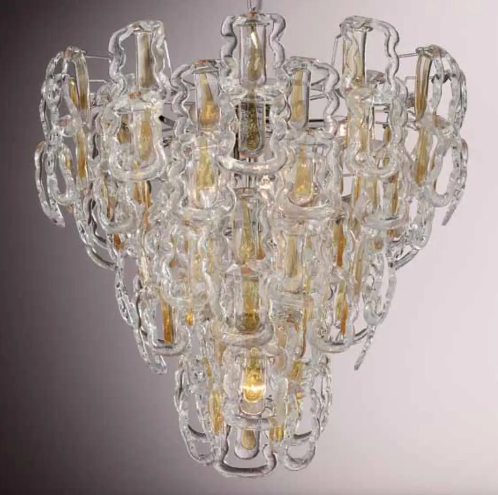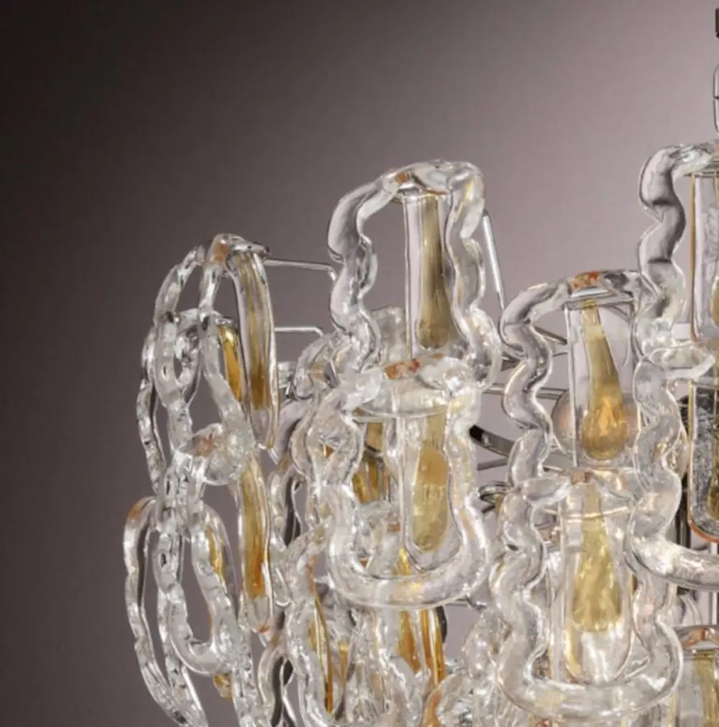 Italian chandelier shown with clear Murano glass hooks decorated with amber stripes in the center, mounted on chrome finish metal frame / Made in Italy7 lights / E12 or E14 type / max 40W eachMeasures: Diameter 25.5 inches / height 25.5 inches plus chain and canopyOrder only / This item ships from ItalyOrder reference #: FABIOLTD C285
