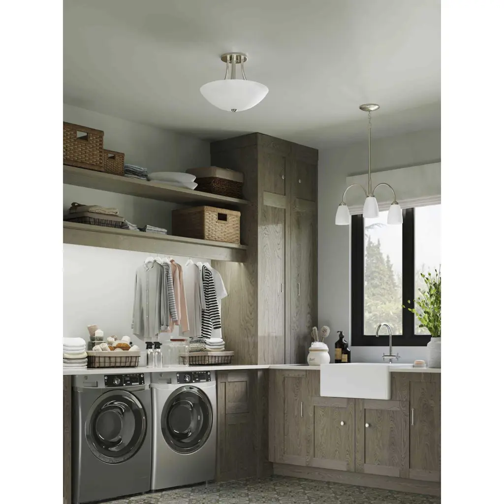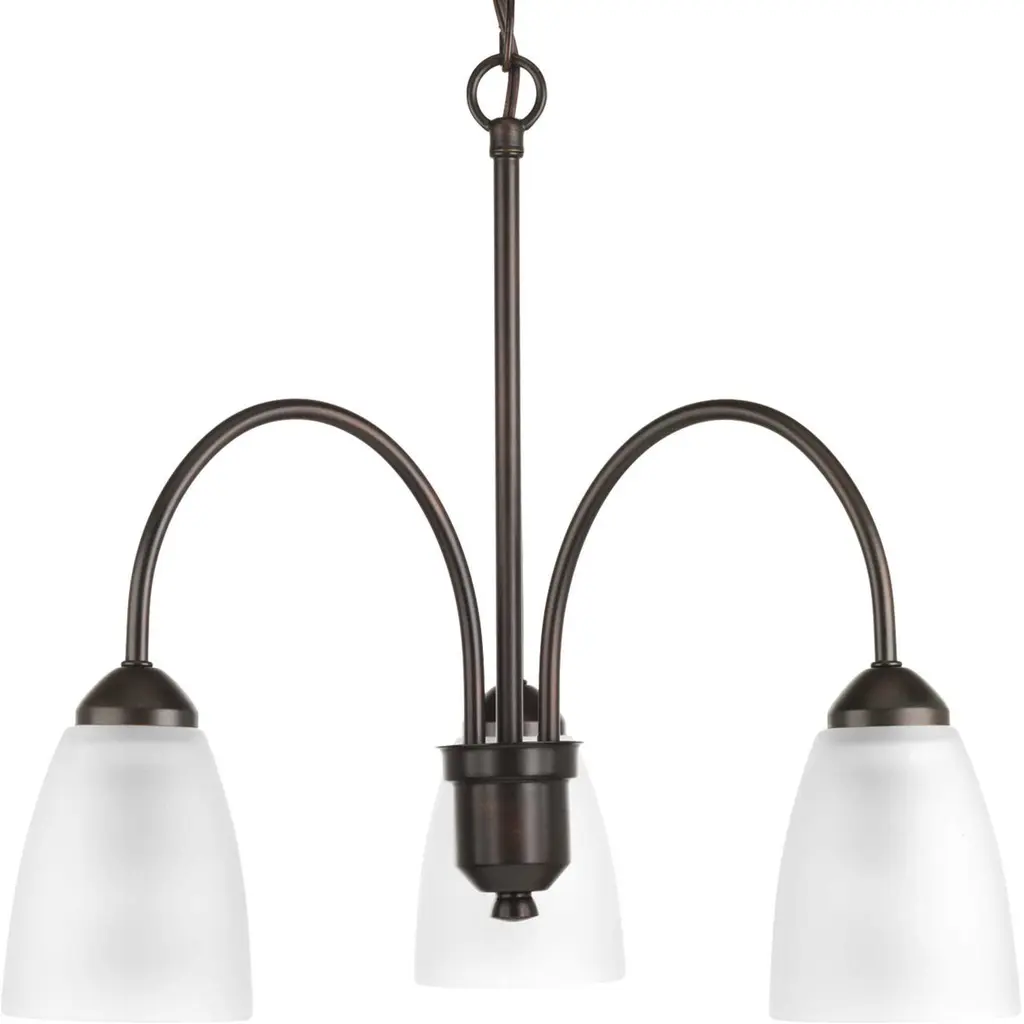 Three-light chandelier from Gather possesses a smart simplicity to complement today's home. Brushed Nickel metal arms descend downwards and curve sharply to prop white etched glass shades. Etched glass add distinction and provide pleasing illumination to your room. Coordinating fixtures from this collection let you decorate an entire home with confidence and style.