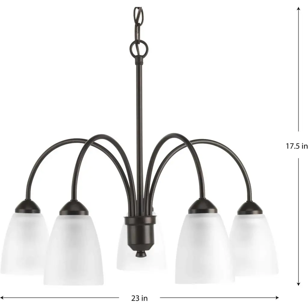 Five-light chandelier from Gather possesses a smart simplicity to complement today's home. Antique Bronze metal arms descend downwards and curve sharply to prop white etched glass shades. Etched glass add distinction and provide pleasing illumination to your room. Coordinating fixtures from this collection let you decorate an entire home with confidence and style.