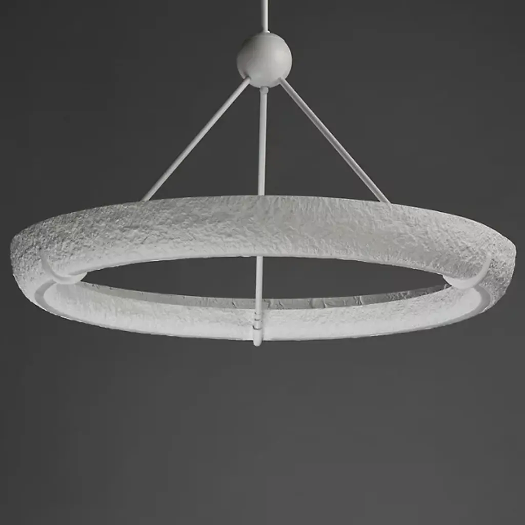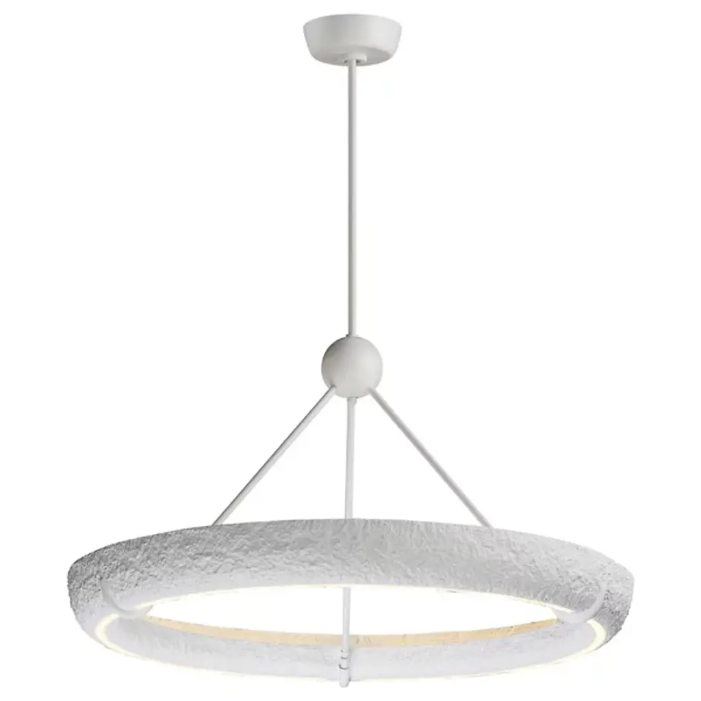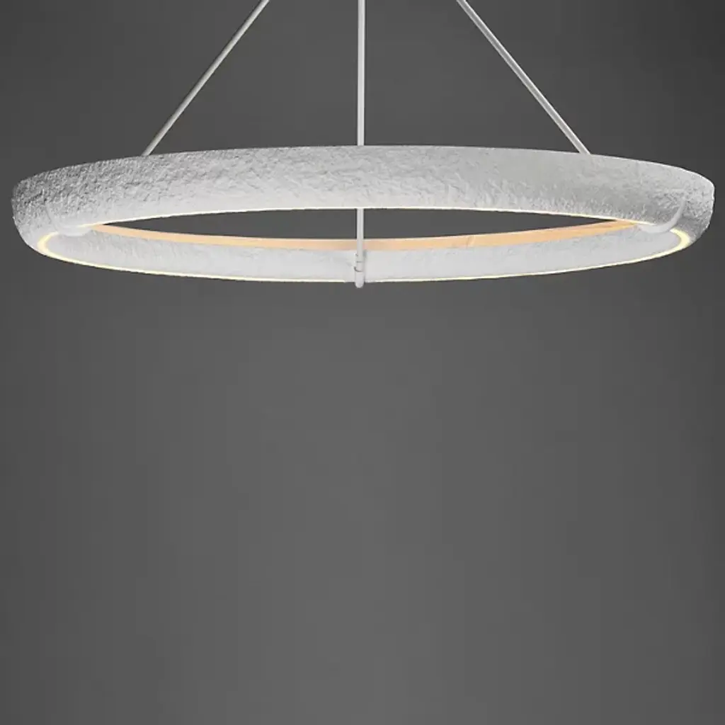 The Geist LED Chandelier from ET2 Lighting draws on historical plaster work while bringing it into the present day. The gypsum ring contains hidden lighting that shines both upward and downward, creating multiple layers of illumination from a single source. Unlike traditional chandeliers with multiple arms, this piece takes a minimalist approach with its circular form. This suspension works wonderfully above dining tables or in living spaces where you want lighting that feels artistic without being showy.