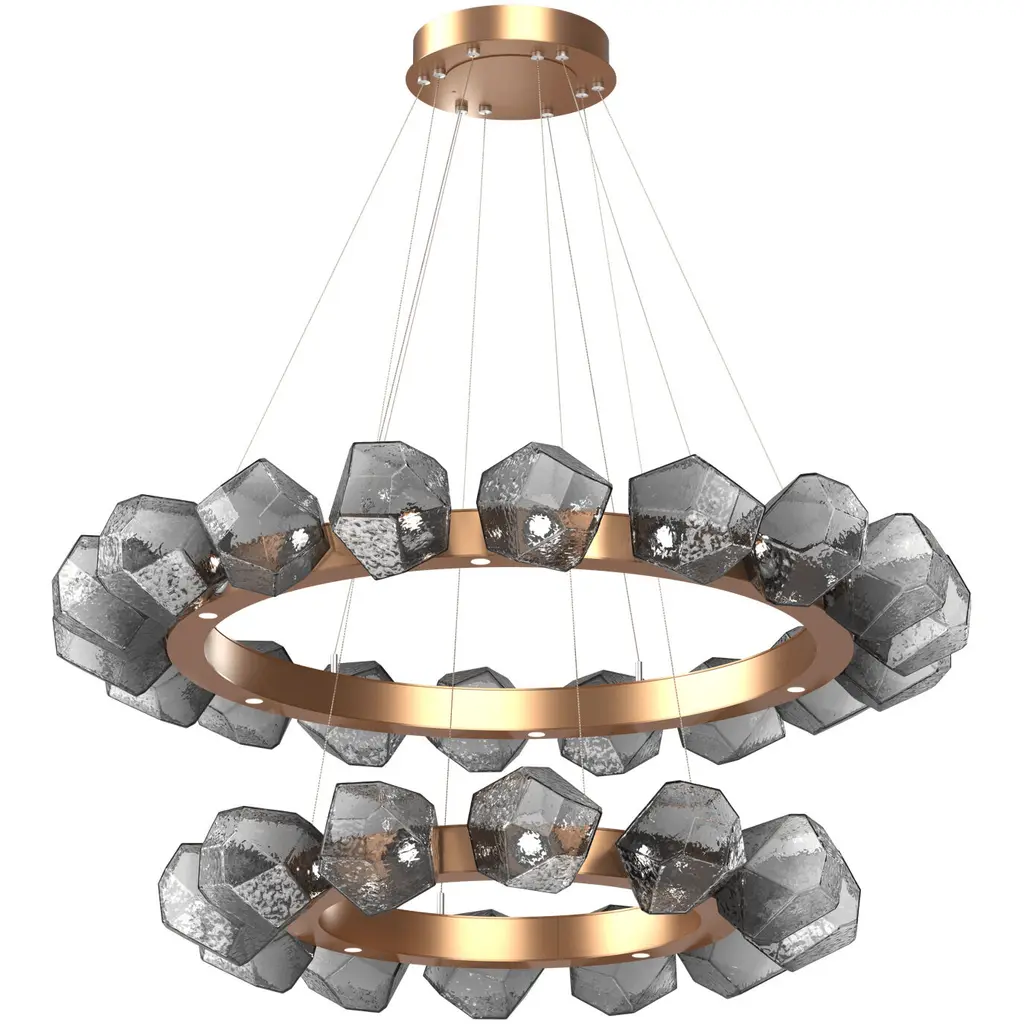 Gem Radial Ring Two Tier - 36/48-Gilded Brass-Blown Glass Gem - Smoke-Stainless Steel Cable-LED