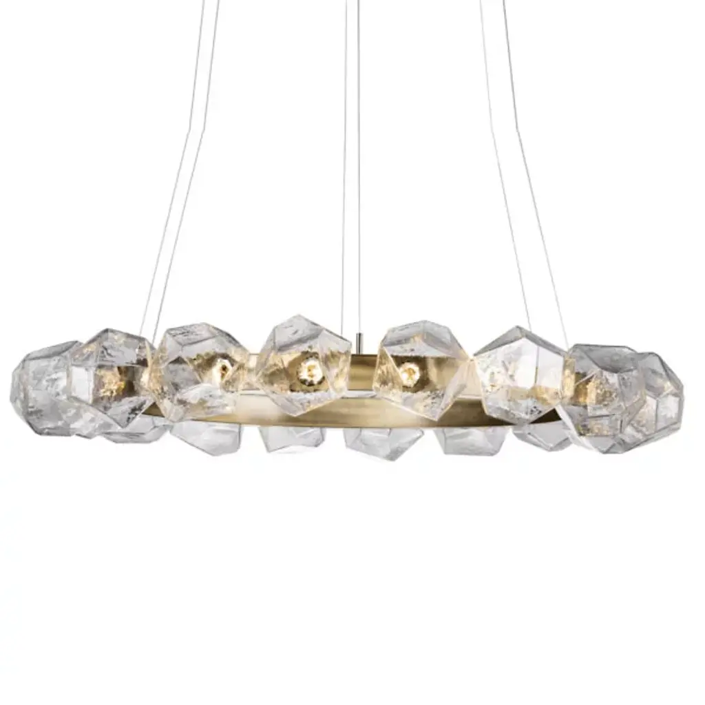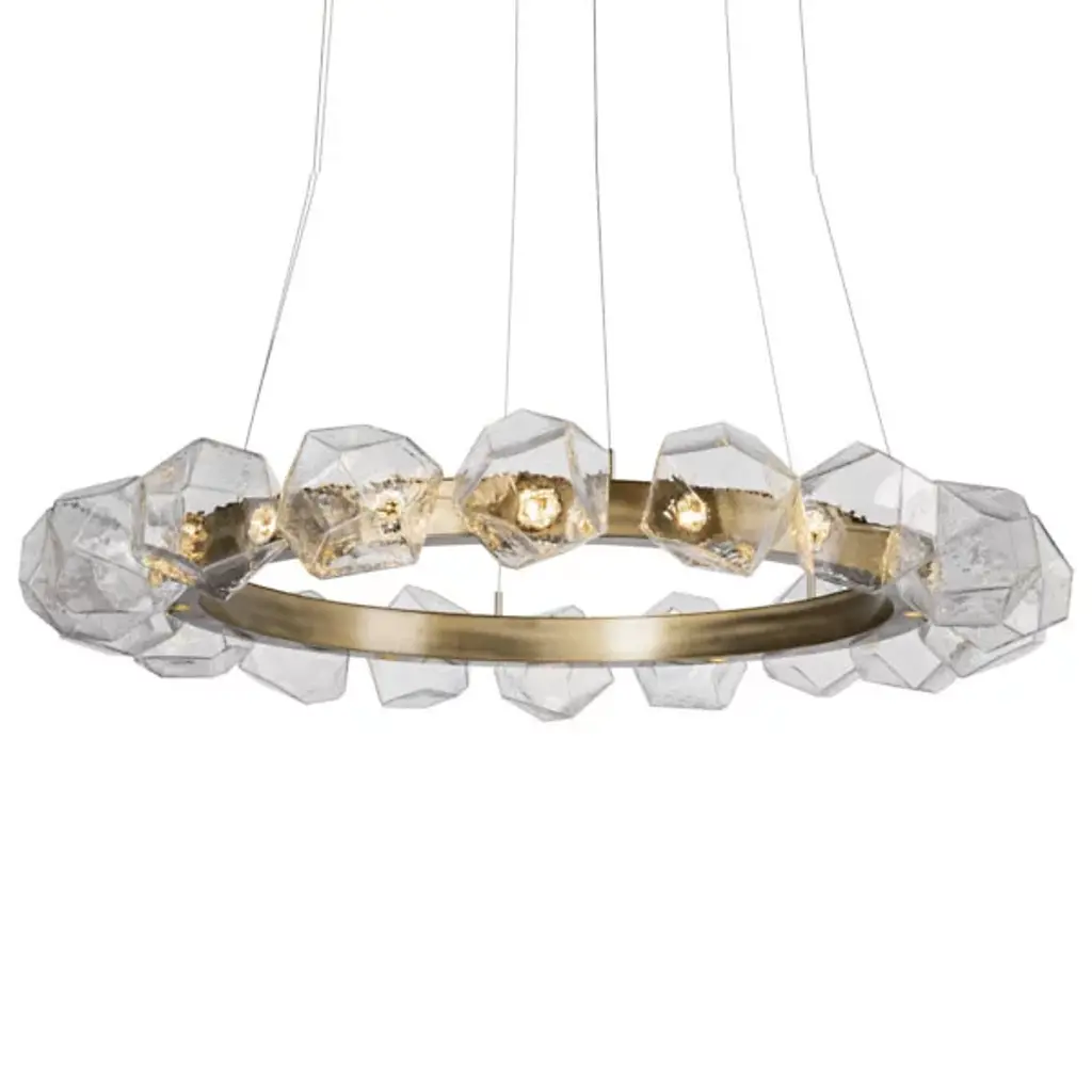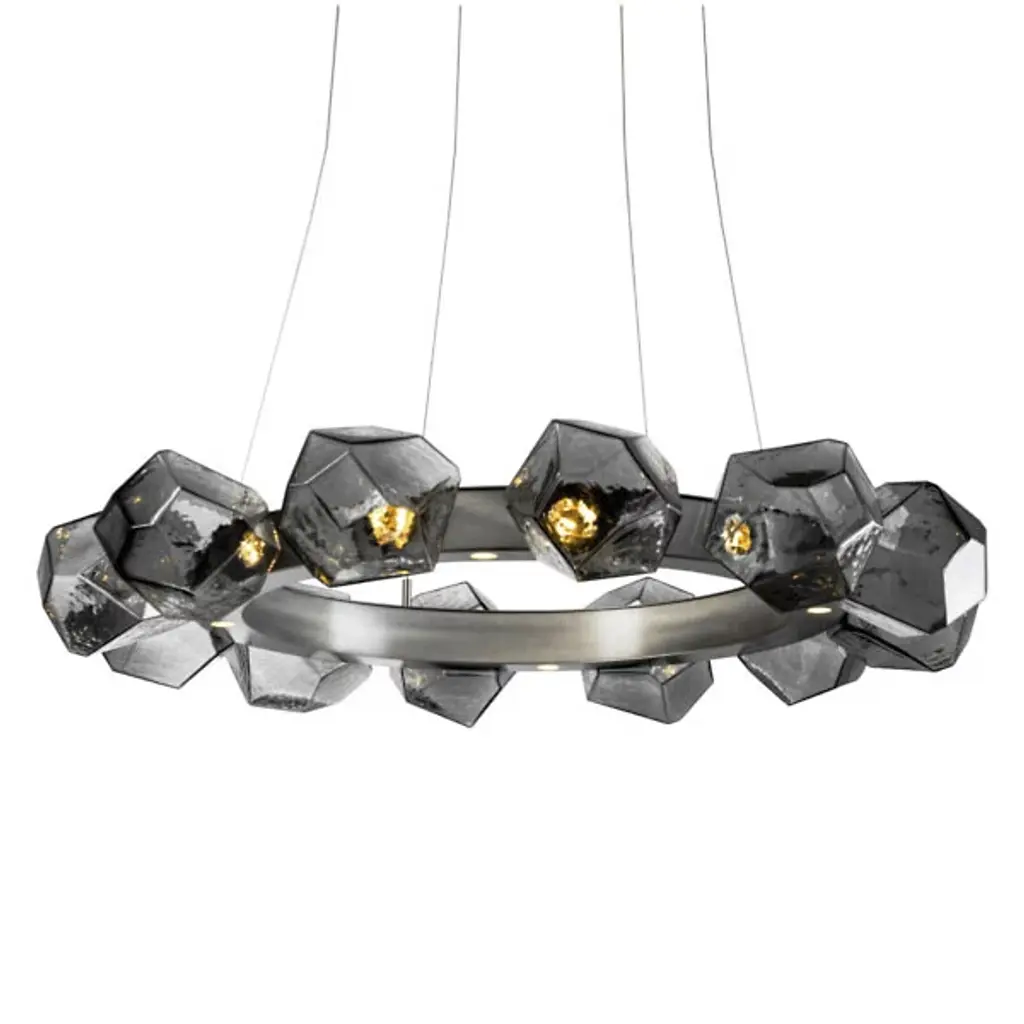 Like an oversized band for an elegant ring, the Gem Radial Ring LED Chandelier from Hammerton Studio is a unique, eye-catching piece that instantly elevates your modern home. Four thin wires uphold the clean ring body. Along the perimeter of the piece rest gems of handblown glass, each one containing an integrated, energy-efficient LED module that brings a sparking life to the piece as they spread a warm, inviting illumination throughout the home.