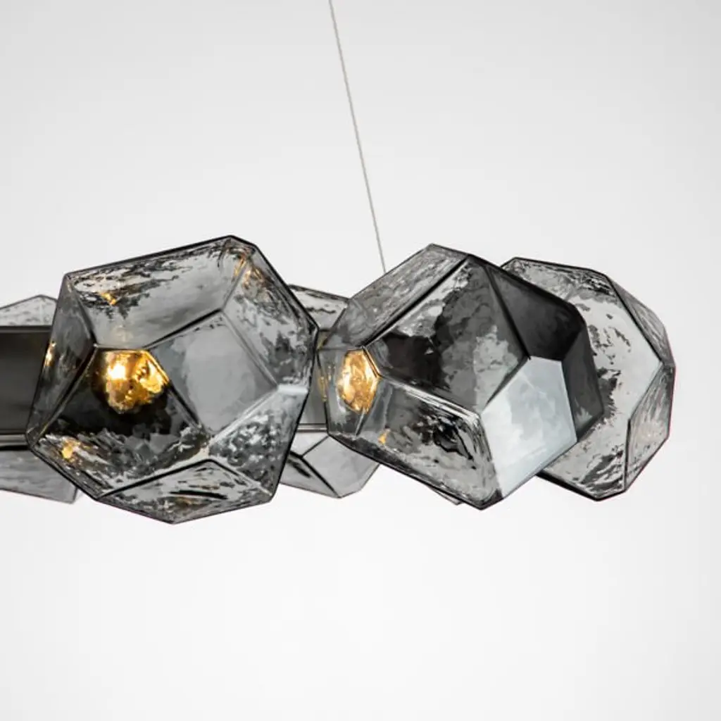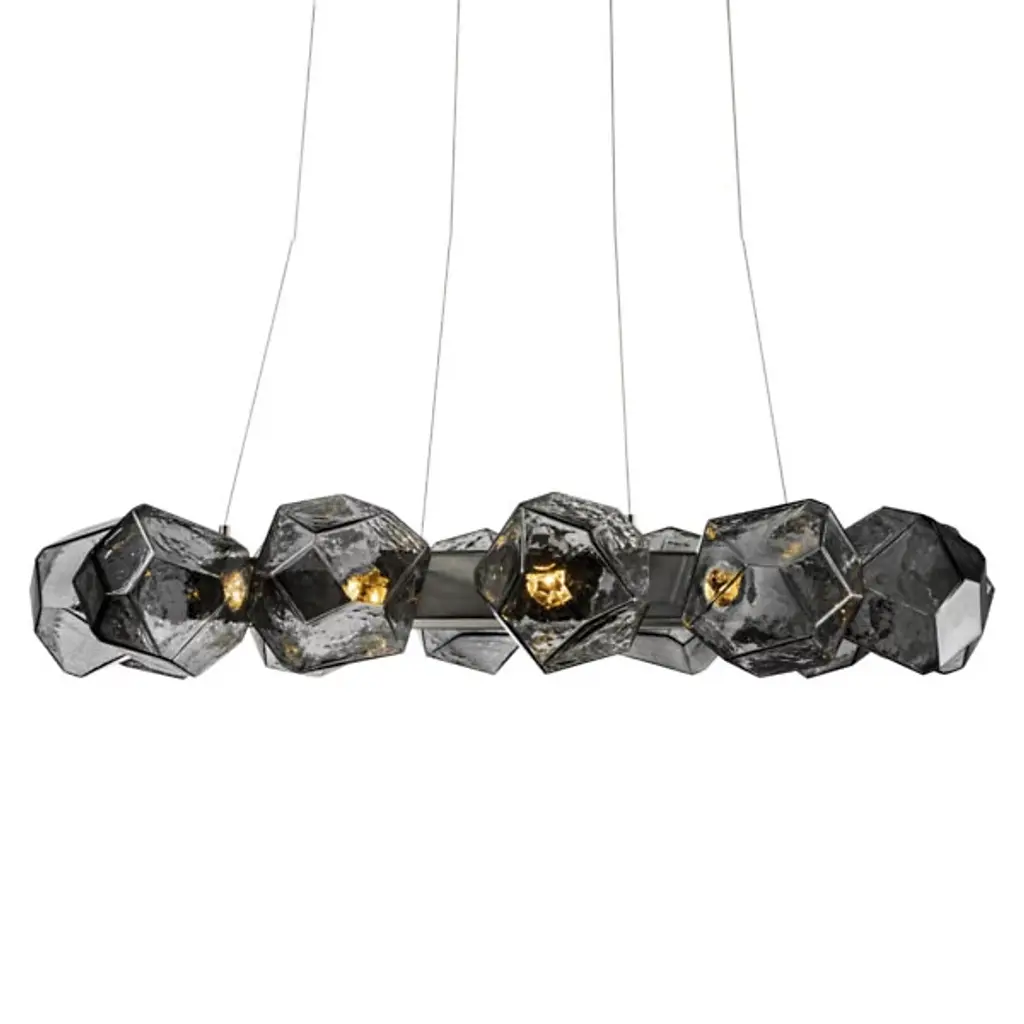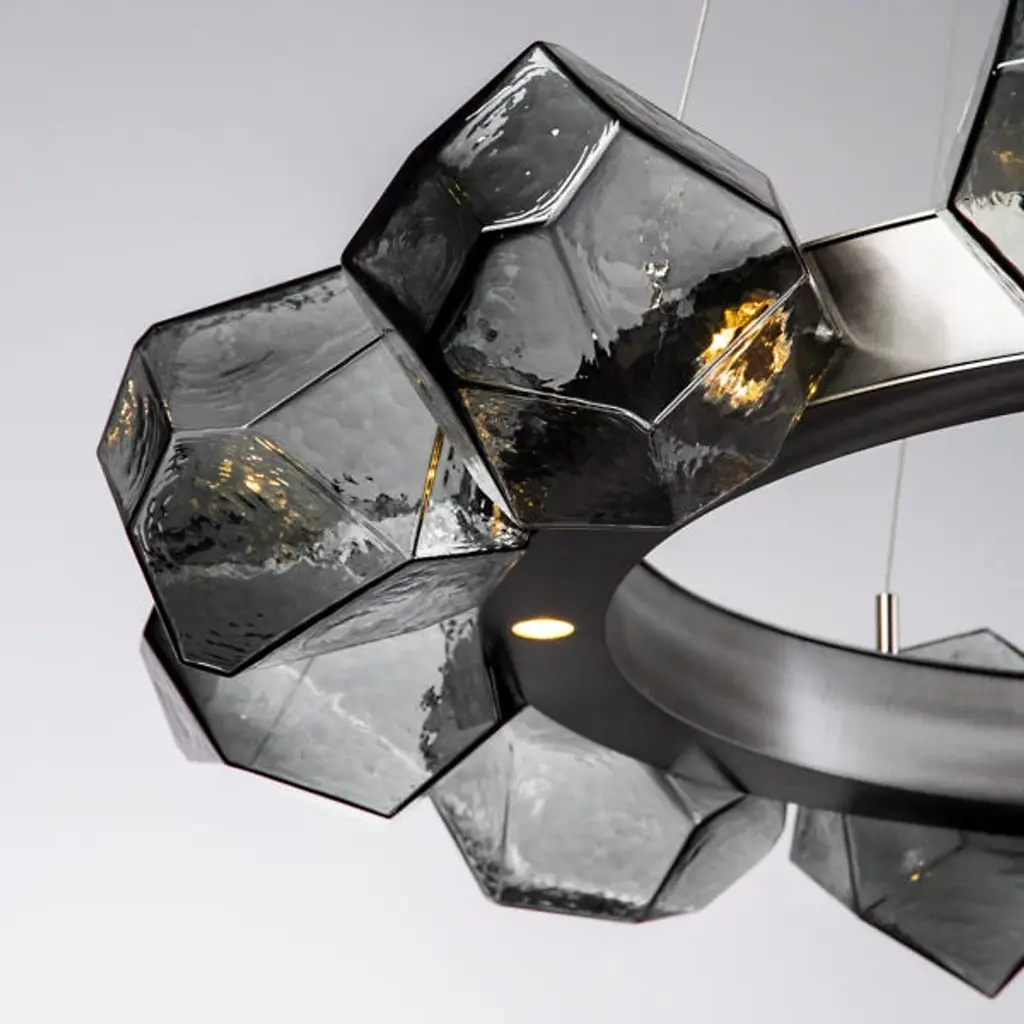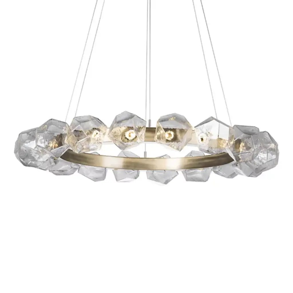 Like an oversized band for an elegant ring, the Gem Radial Ring LED Chandelier from Hammerton Studio is a unique, eye-catching piece that instantly elevates your modern home. Four thin wires uphold the clean ring body. Along the perimeter of the piece rest gems of handblown glass, each one containing an integrated, energy-efficient LED module that brings a sparking life to the piece as they spread a warm, inviting illumination throughout the home.