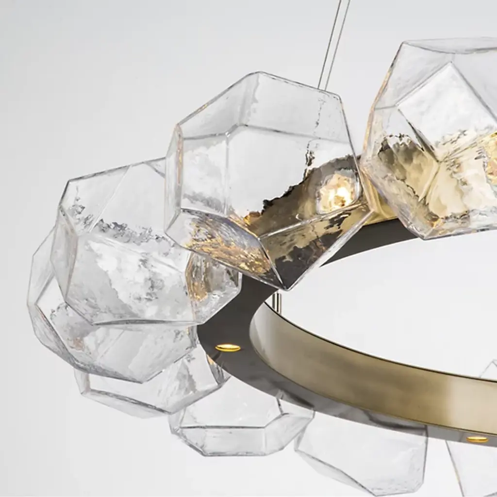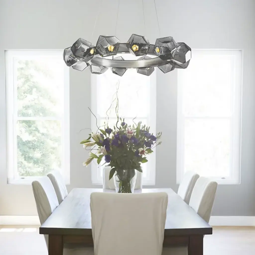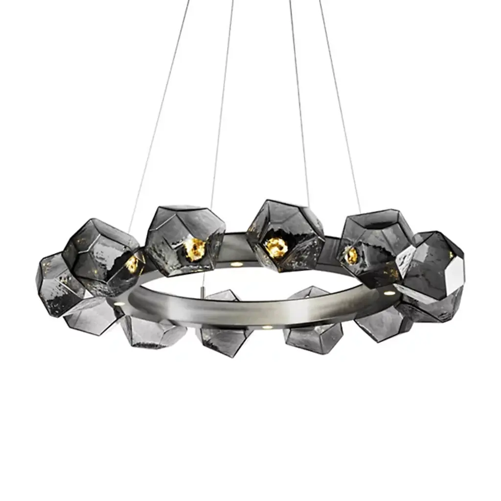 Like an oversized band for an elegant ring, the Gem Radial Ring LED Chandelier from Hammerton Studio is a unique, eye-catching piece that instantly elevates your modern home. Four thin wires uphold the clean ring body. Along the perimeter of the piece rest gems of handblown glass, each one containing an integrated, energy-efficient LED module that brings a sparking life to the piece as they spread a warm, inviting illumination throughout the home.