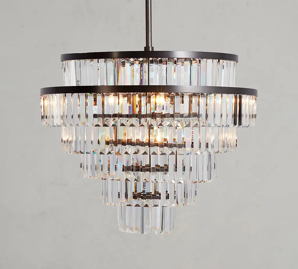Tiers of clear, faceted crystals are suspended from antique bronze or vintage brass-finished bands in our stunning Gemma chandelier, bringing a contemporary look to a classic design. Place it over a dining table, in an entryway or bedroom for lighting that sparkles and adds drama.