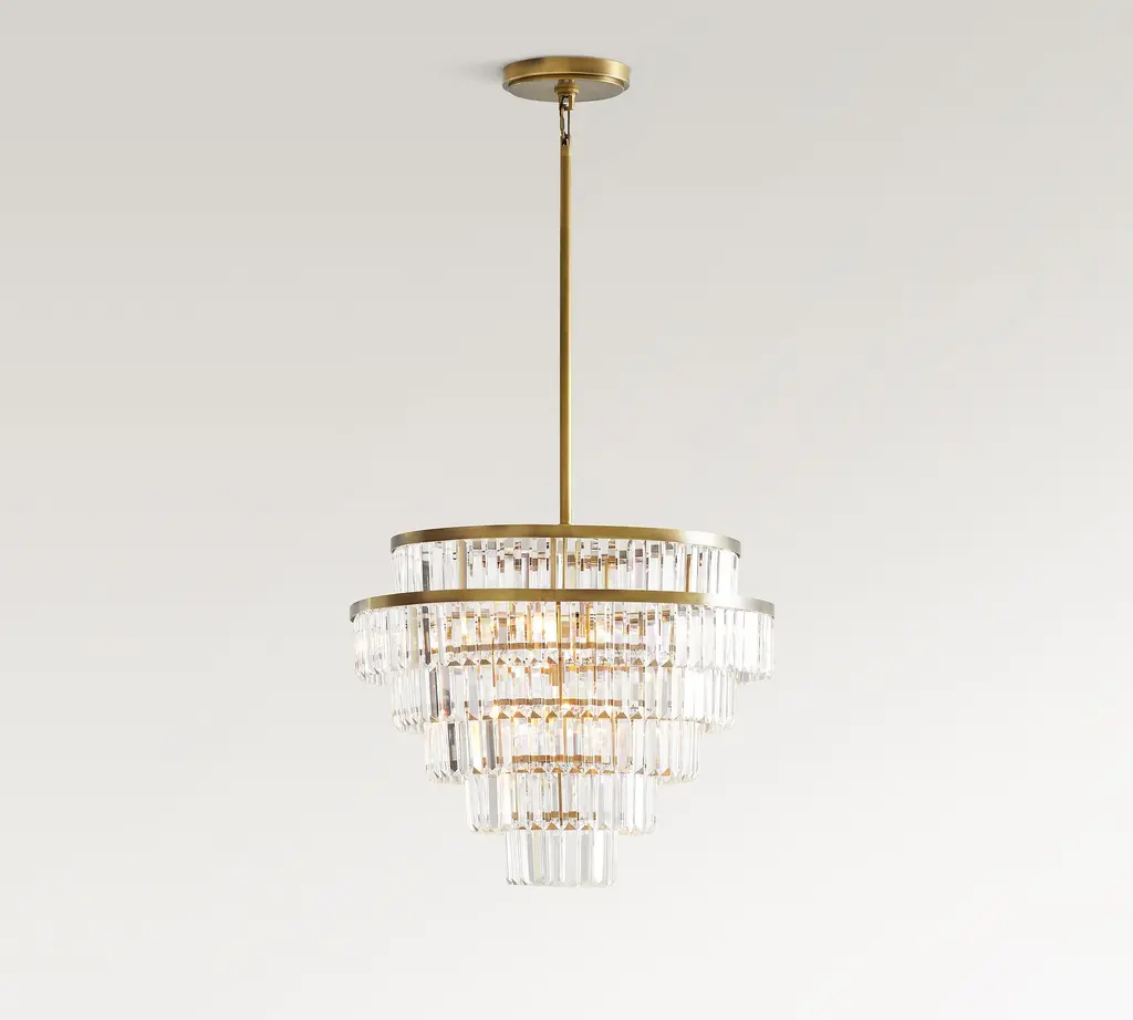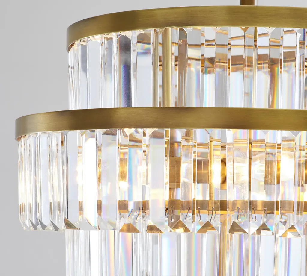 Tiers of clear, faceted crystals are suspended from antique bronze or vintage brass-finished bands in our stunning Gemma chandelier, bringing a contemporary look to a classic design. Place it over a dining table, in an entryway or bedroom for lighting that sparkles and adds drama.