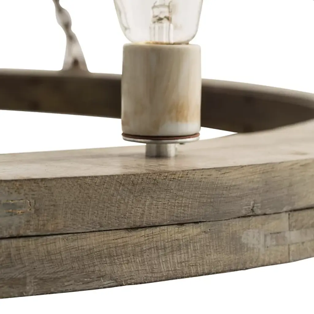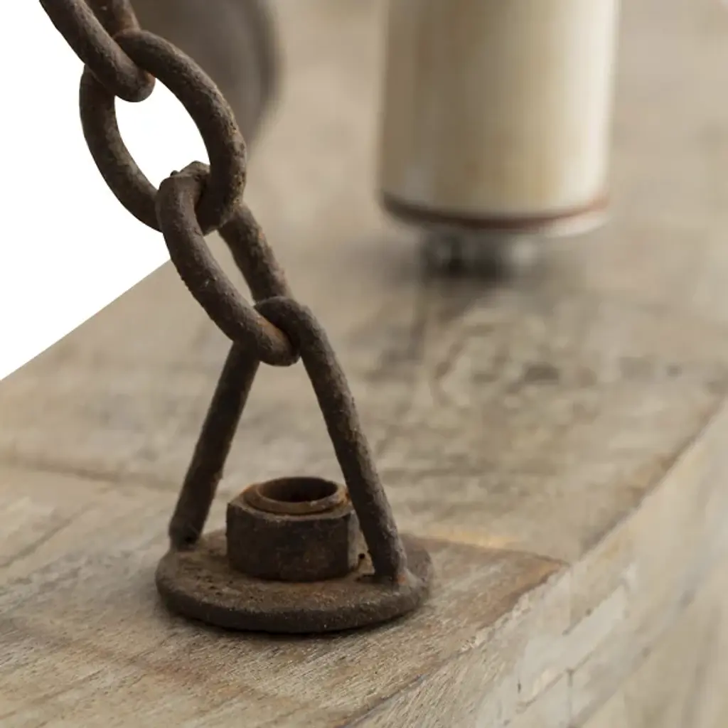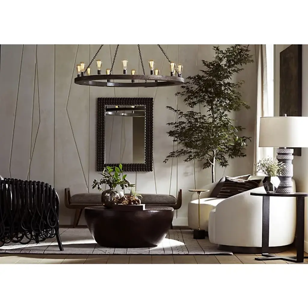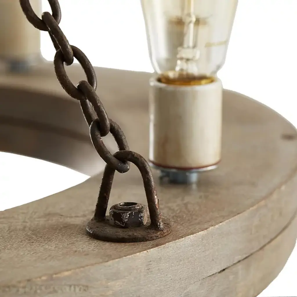 A suspended ring of natural wood is complimented with rusted chains in the Geoffrey Chandelier by Arteriors. The exposed bulbs sit in their metallic sockets along the wooden ring, providing an ample amount of illumination. This beautiful design fits well in Rustic Modern interiors, but can also make a statement in a range of other decor styles.