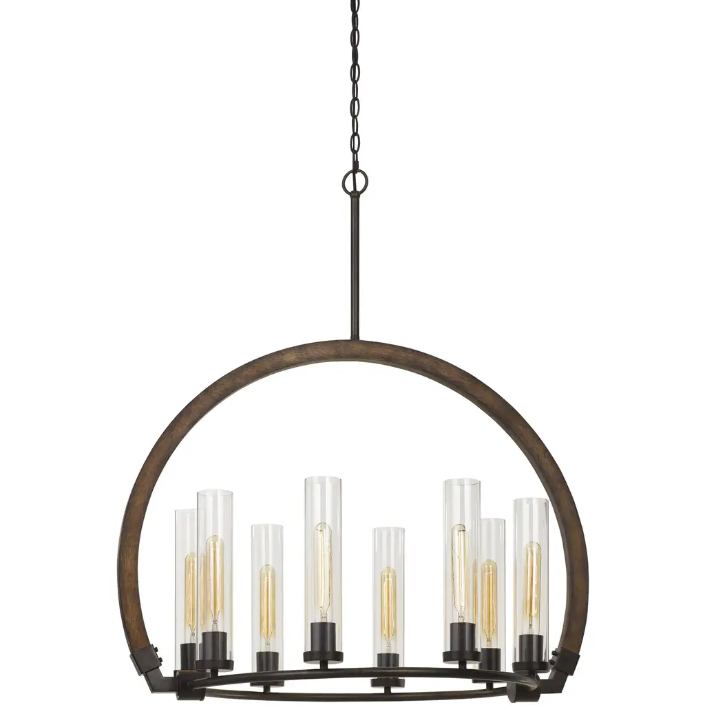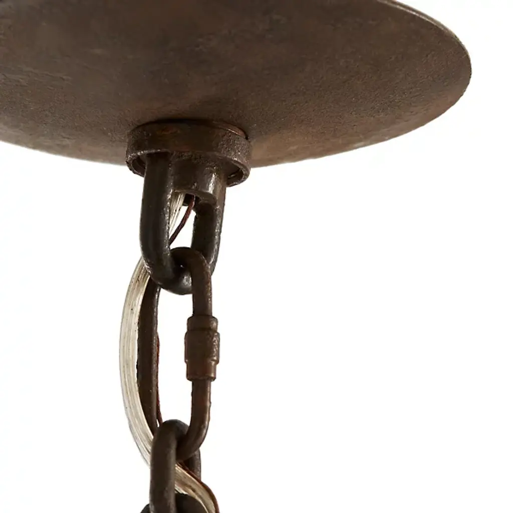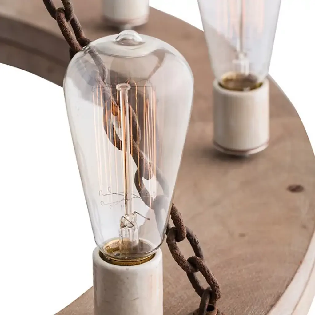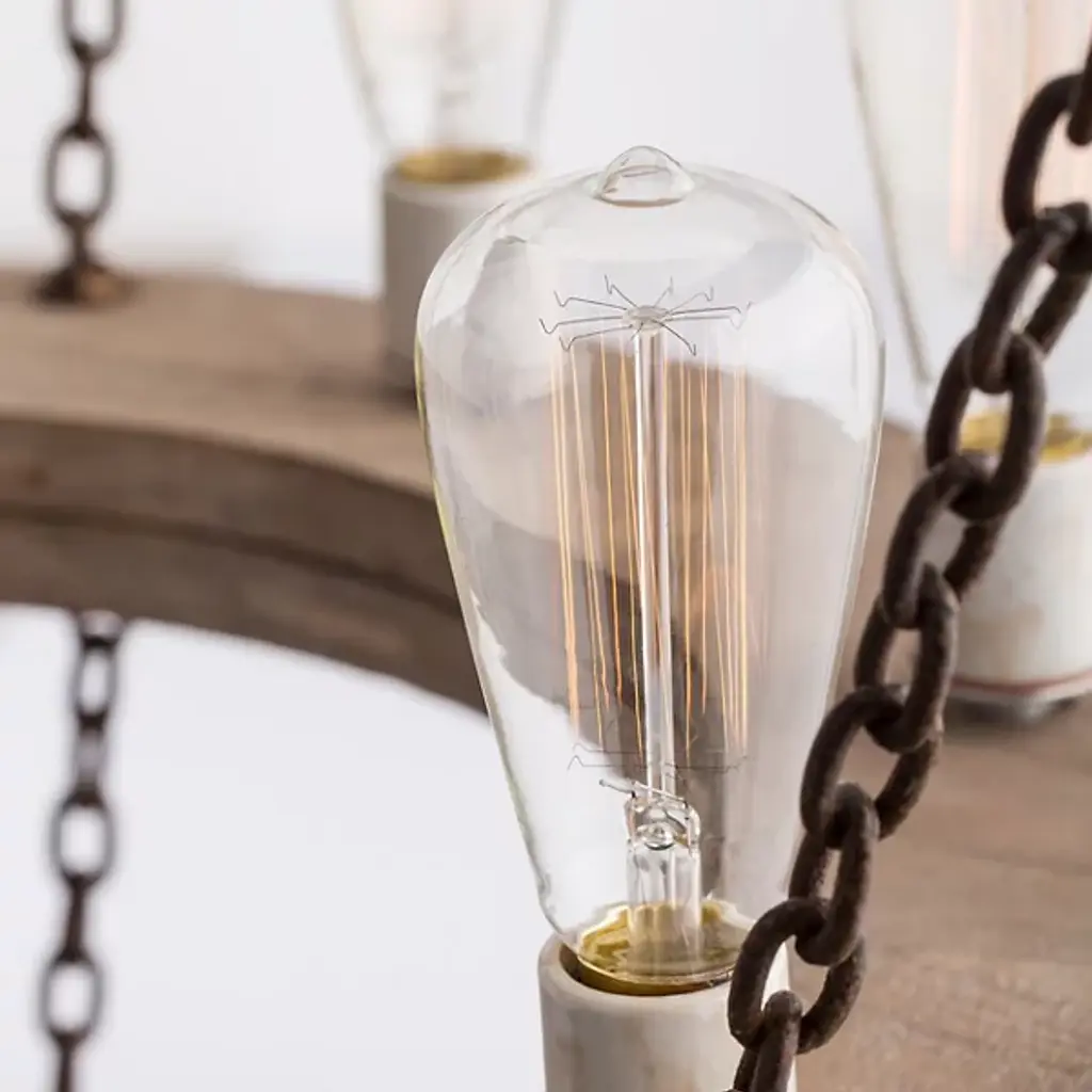 A suspended ring of natural wood is complimented with rusted chains in the Geoffrey Chandelier by Arteriors. The exposed bulbs sit in their metallic sockets along the wooden ring, providing an ample amount of illumination. This beautiful design fits well in Rustic Modern interiors, but can also make a statement in a range of other decor styles.