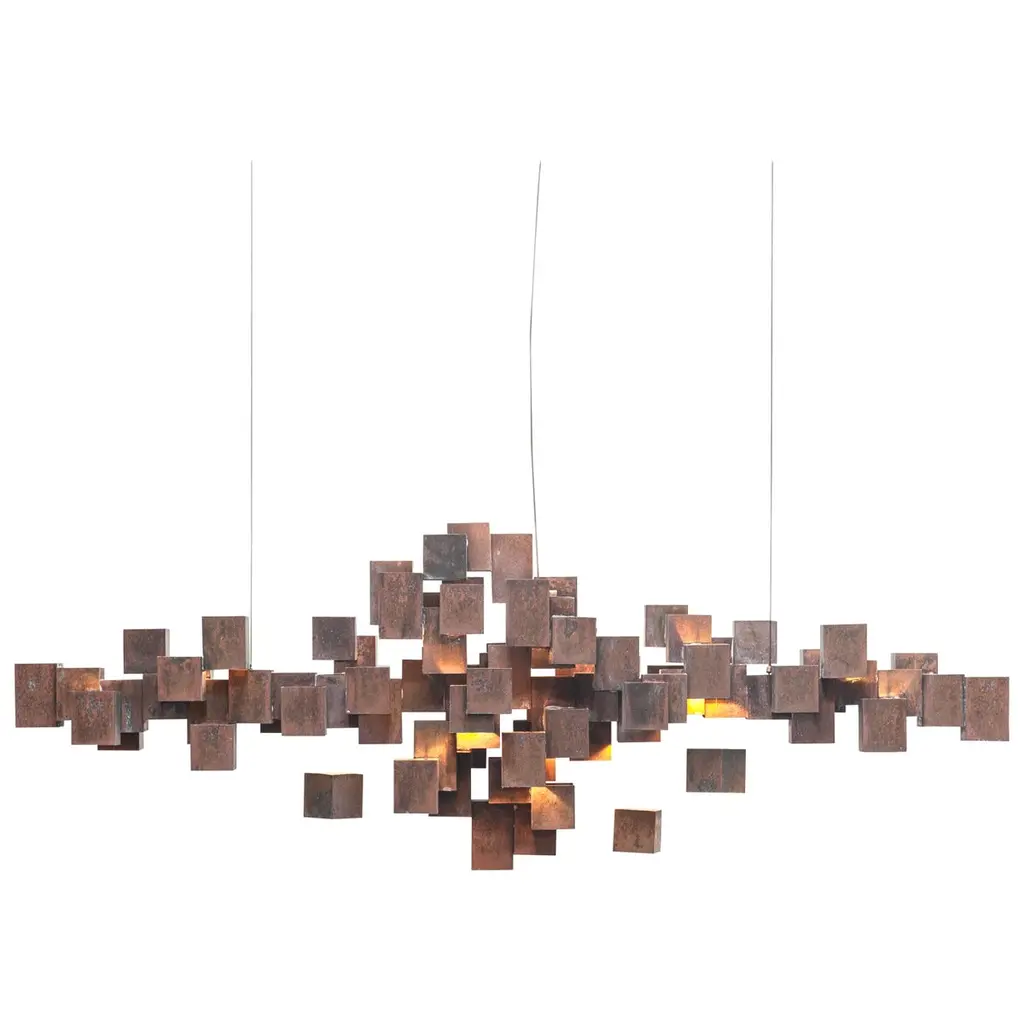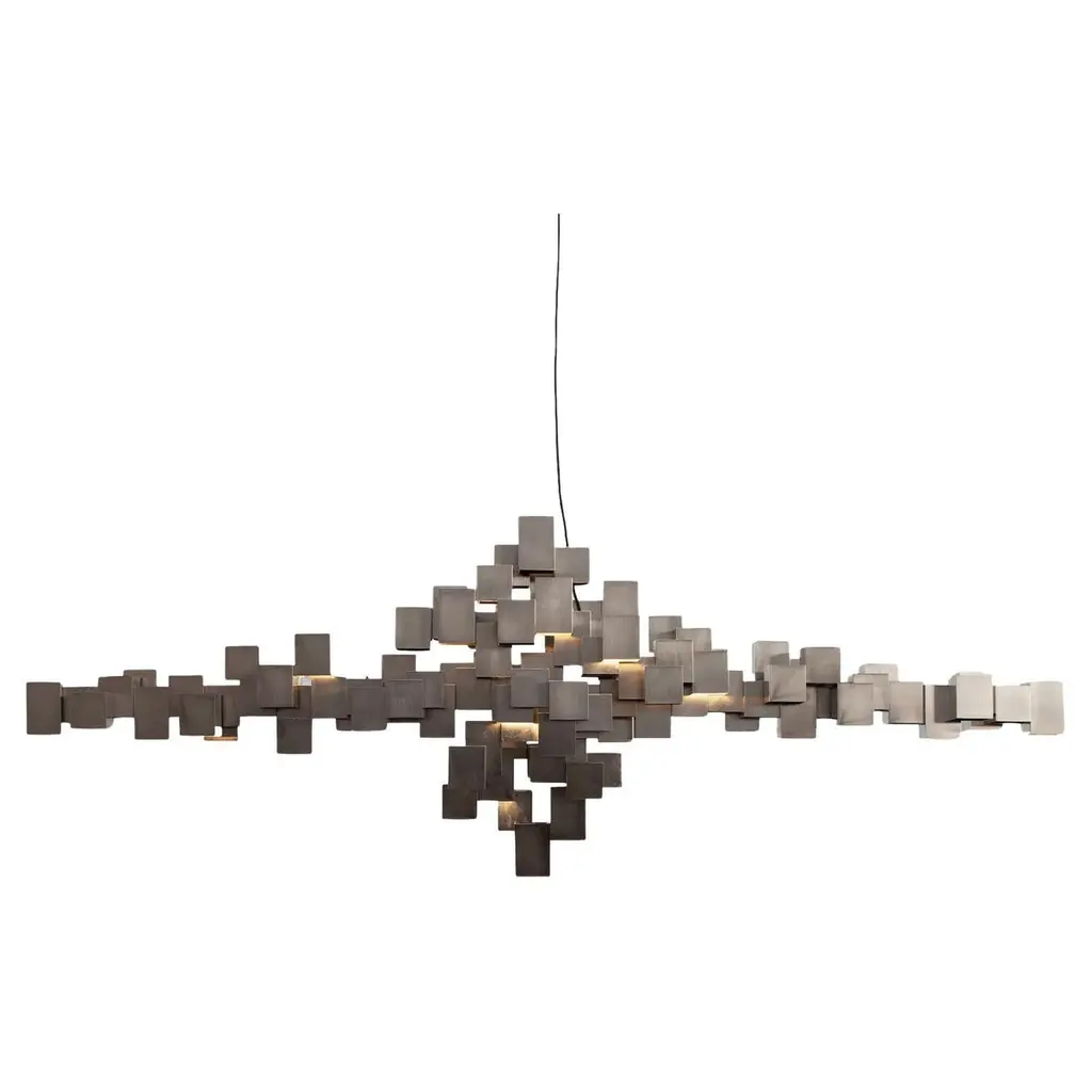 This Italian contemporary chandelier is designed by HP Sommer for the Italian design company Morghen Studio. This piece is entirely manufactured and assembled in Milan in an artisanal way in which every step of the process is carefully executed. It's design takes inspiration from the cloud’s shape which is converted in a kind of pixel.The chandelier have 21 led bulbs which create a wonderful effect reflecting the light on the different sides of the brass cubes. This piece is exclusively made for Rossana Orlandi Gallery. This beautiful piece is made in satin brass and LED light. The standard version comes with a cord/cable length: 5 meters steel cable - 5 meters power cable and a driver input: AC 110-220v/ output: DC 12v.It's standard dimensions are : 135x42x50h cm.Light source is n.22 G4 led light - 2.700 kThis chandelier is customizable in shapes, dimensions and finishes, for example is available also in rusty brass.