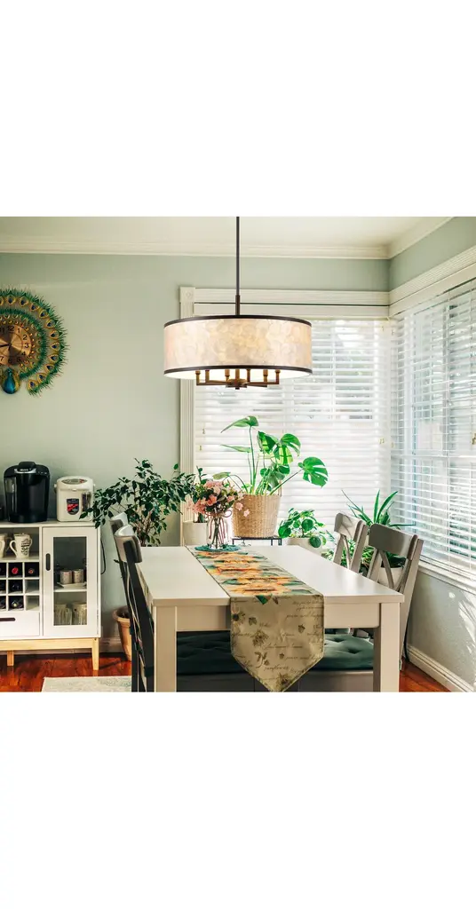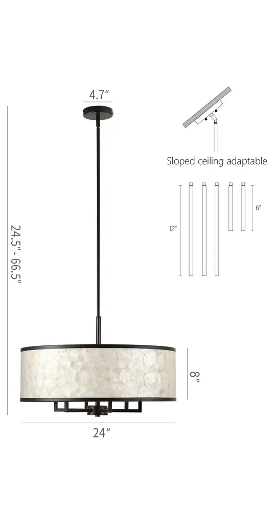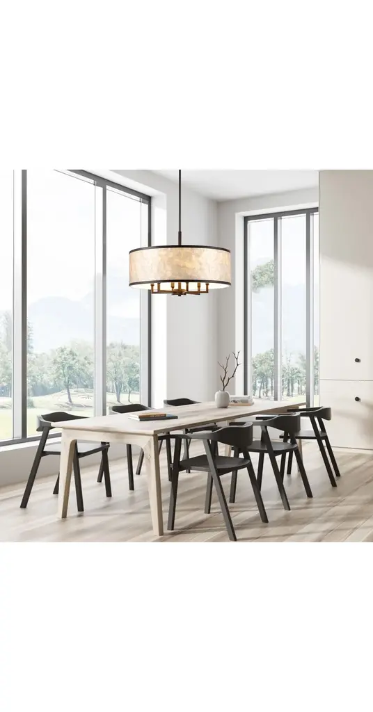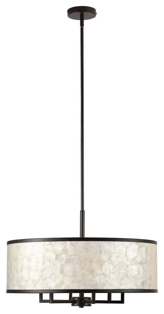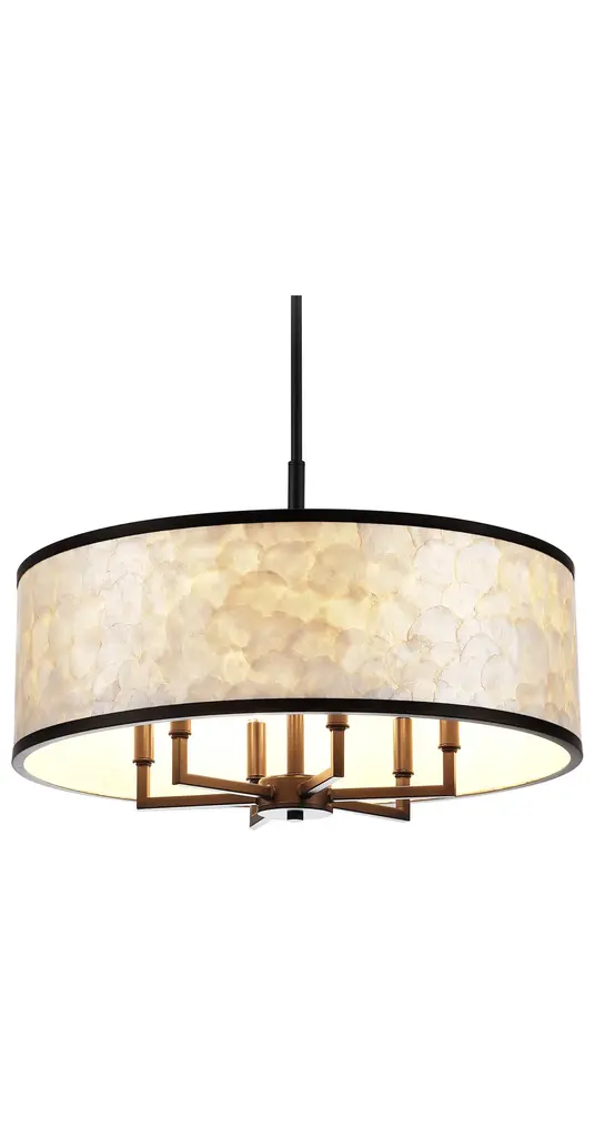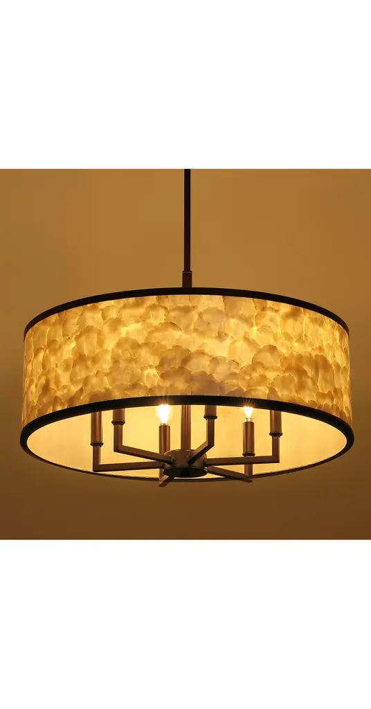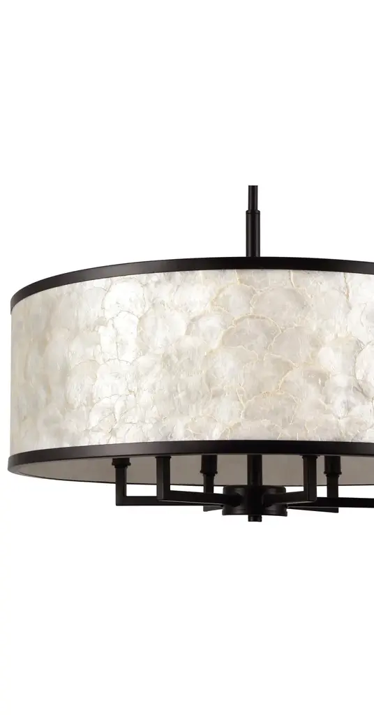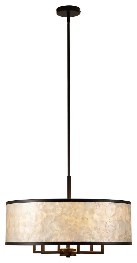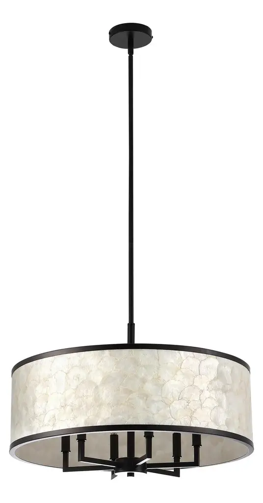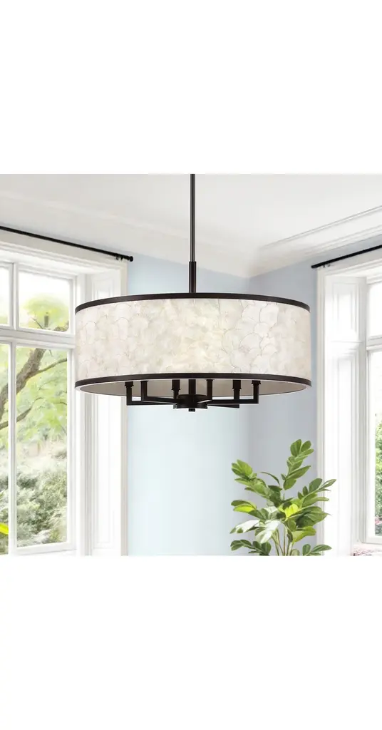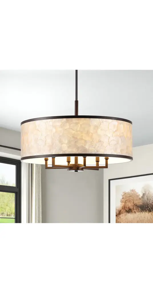 Make a bold statement with this 6-Light Drum Chandelier, where art meets illumination. The hand-assembled capiz shell shade brings a unique texture to your home while casting a soft, diffused light. Its versatile design pairs beautifully with modern, eclectic, or coastal décor styles. Crafted with premium materials and an adjustable hanging rods, this chandelier enhances your home’s ambiance and aesthetic.Features:Perfect for dining rooms, living rooms, bedrooms, or even foyers;Features hand-assembled, pearlescent capiz shells that shimmer beautifully;Crafted with premium metal accents in a bronze or gold finish for a sophisticated touch;Equipped with six E12 candelabra bulb sockets (60W max per bulb) for optimal illumination;Comes with five adjustable rods, accommodating various ceiling heights and ensuring perfect placement;