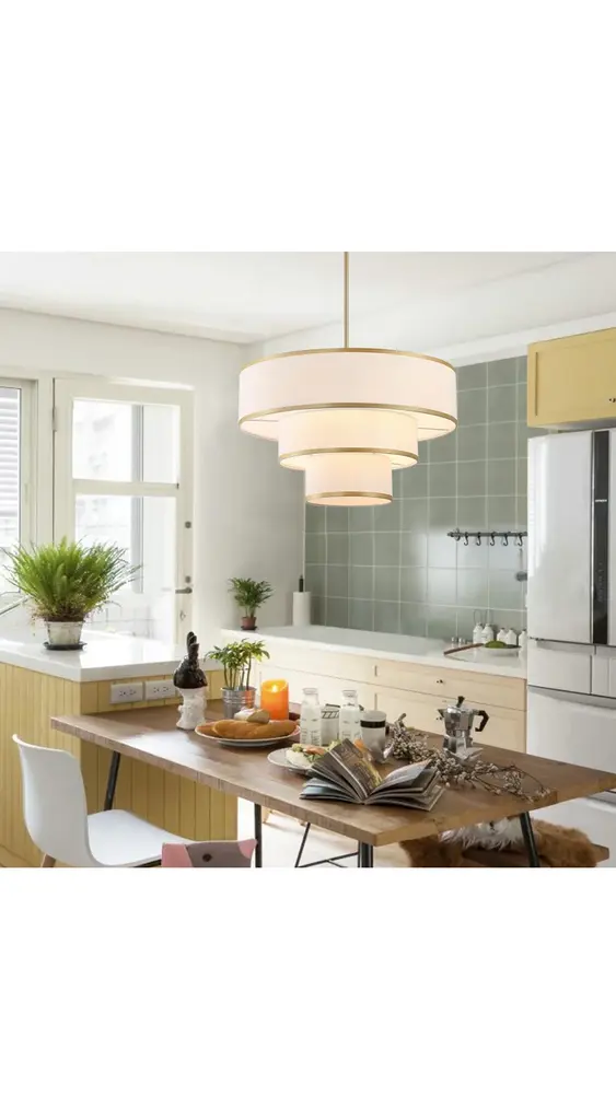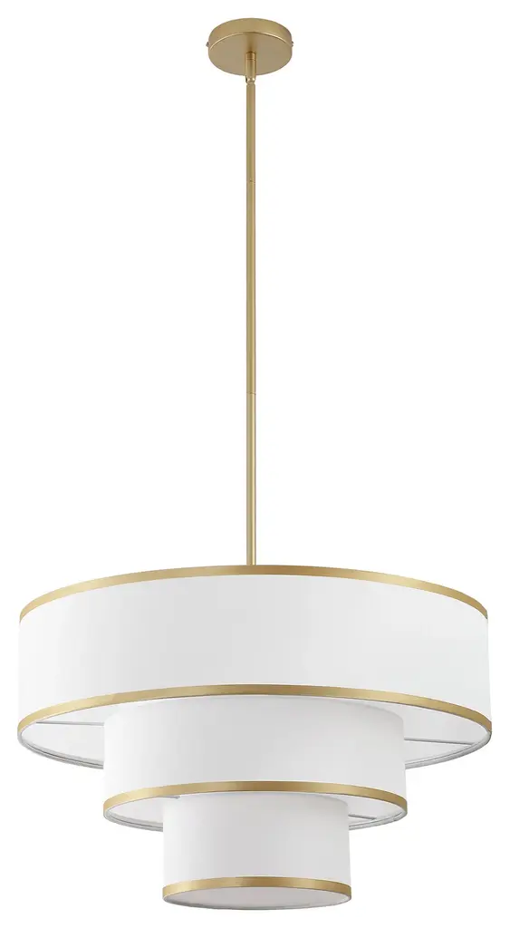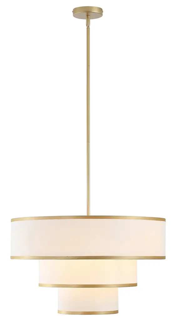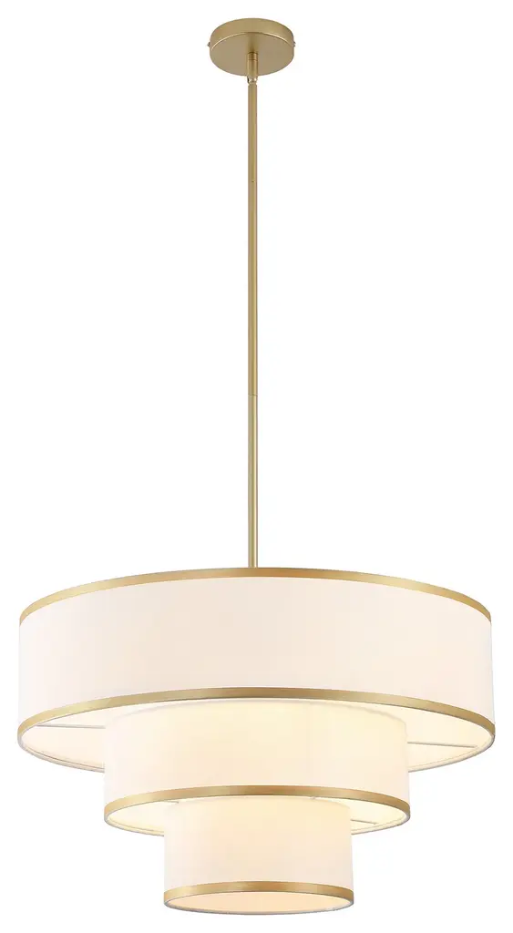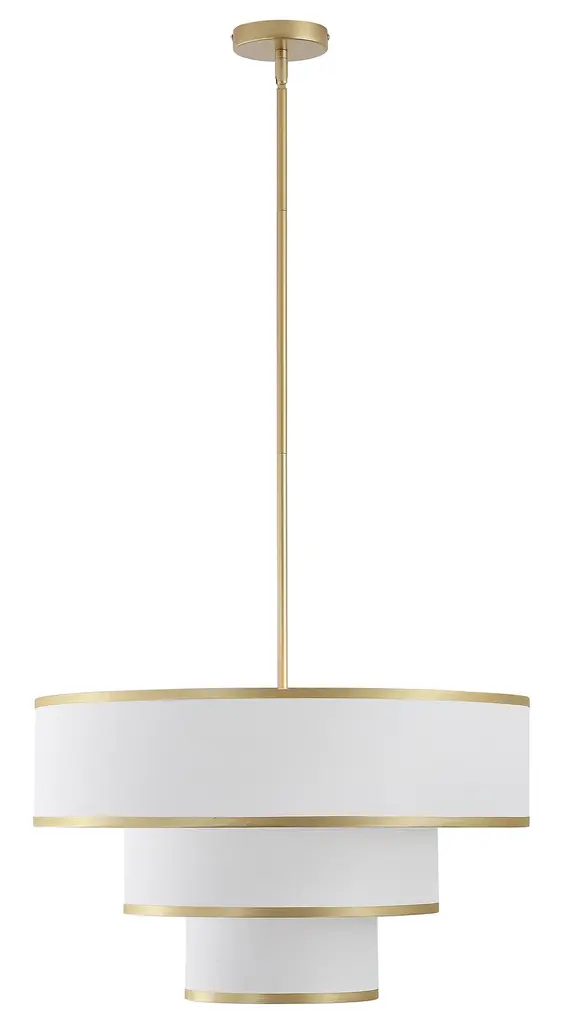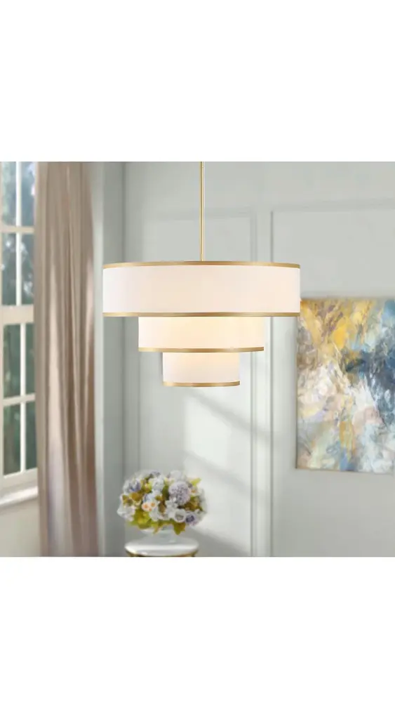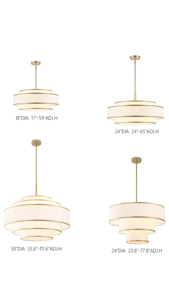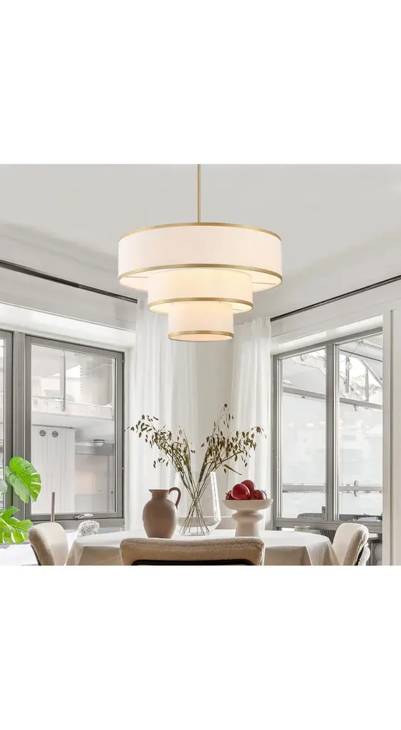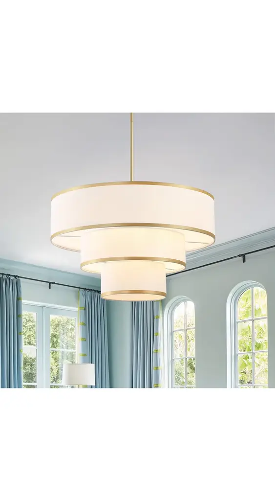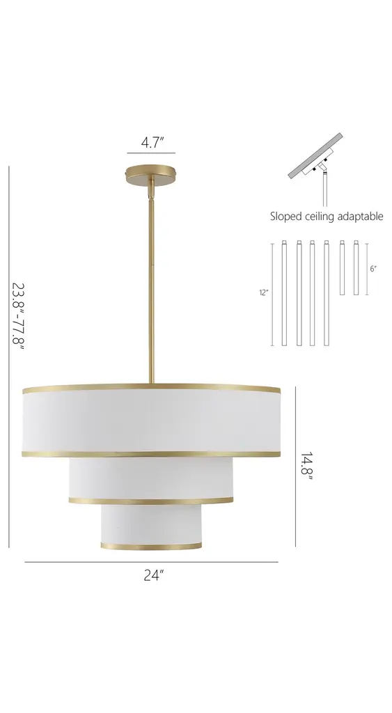 Redefine your living space with this elegant tiered chandelier, designed to make a bold yet refined statement. The fixture features three intricately layered drum shades, creating a cascading effect that adds dimension and interest to the design. Each shade is crafted from premium white fabric that softly diffuses light, creating a warm and inviting glow. The subtle trim along the edges of the shades adds a touch of detail, enhancing the overall aesthetic without detracting from the chandelier's minimalist appeal. The rods and canopy, finished in bronze/brushed nickel/gold, provide a sleek and modern contrast that completes the look. Whether you're hosting a dinner party or enjoying a quiet evening at home, this chandelier will serve as a focal point while casting ambient light that enhances the mood of your interior.Features:Uses five E26 socket bulbs, max. 60W per bulb(not included);Offers a dimmable feature for you to customize the lighting to match your needs;Includes 2 x 6" and 4 x 12" rods, making it suitable for rooms of different ceiling heights;Comes with a sloped ceiling adapter, suitable for both flat and angled ceilings;