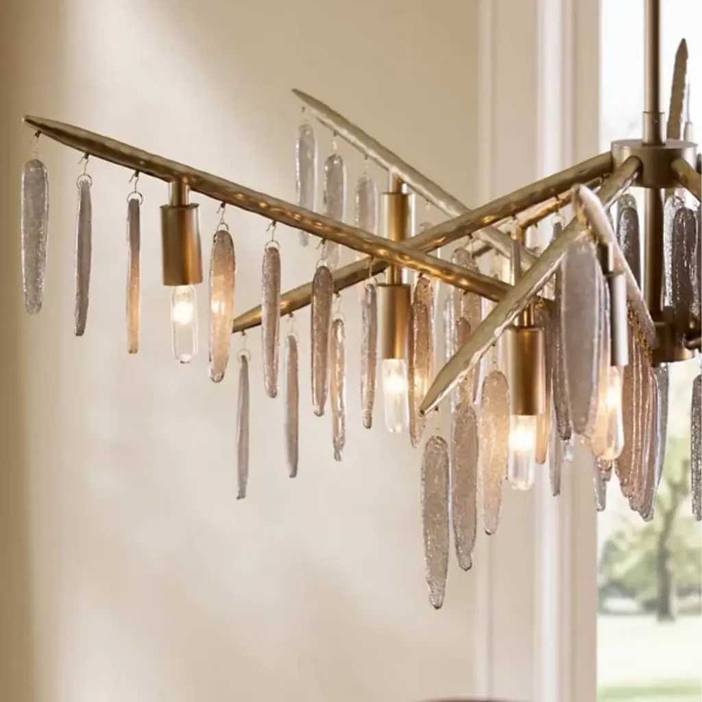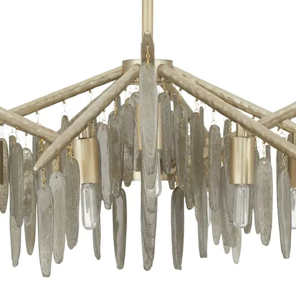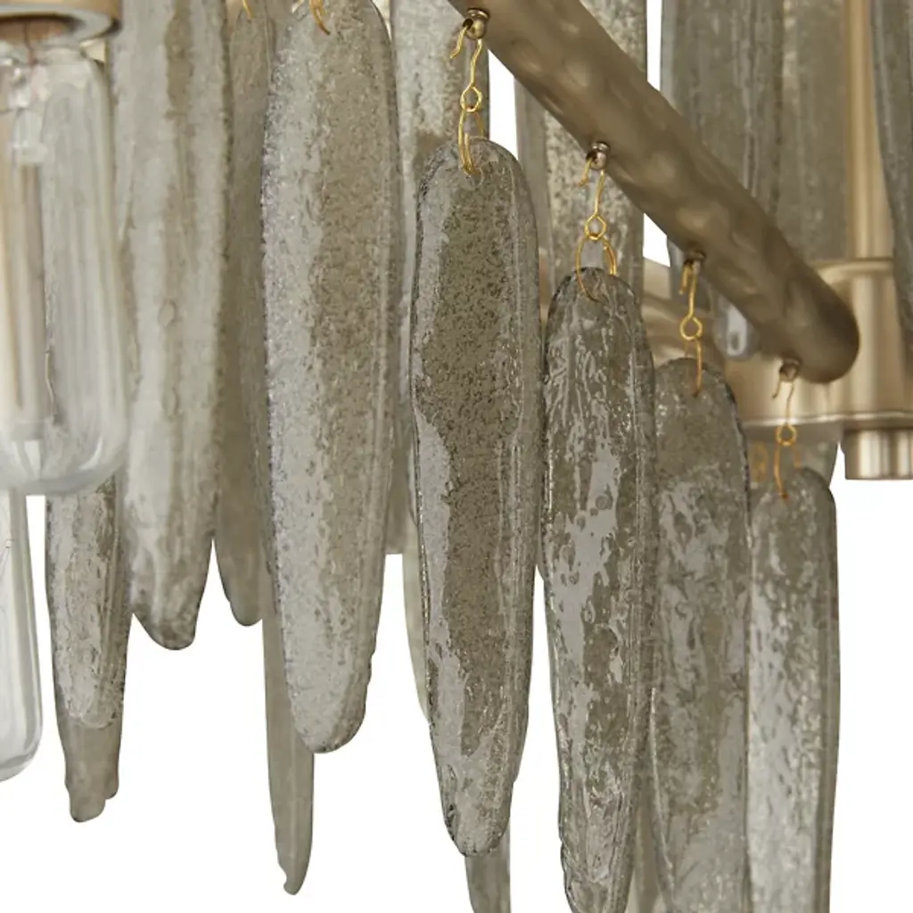 The Gia Chandelier from Arteriors brings winter's magic indoors with glass droplets that mimic frozen icicles clinging to branches. This dimmable showpiece suspends twelve light sources among textured metalwork that recalls tree bark patterns. The hammered iron branches stretch outward, each carrying its crystalline cargo with natural grace. When lit, the seedy glass elements sparkle like morning frost, but even unlit, this nature-inspired piece demands appreciation. Approved for covered outdoor spaces, it's particularly magical in sunrooms or above dining tables.